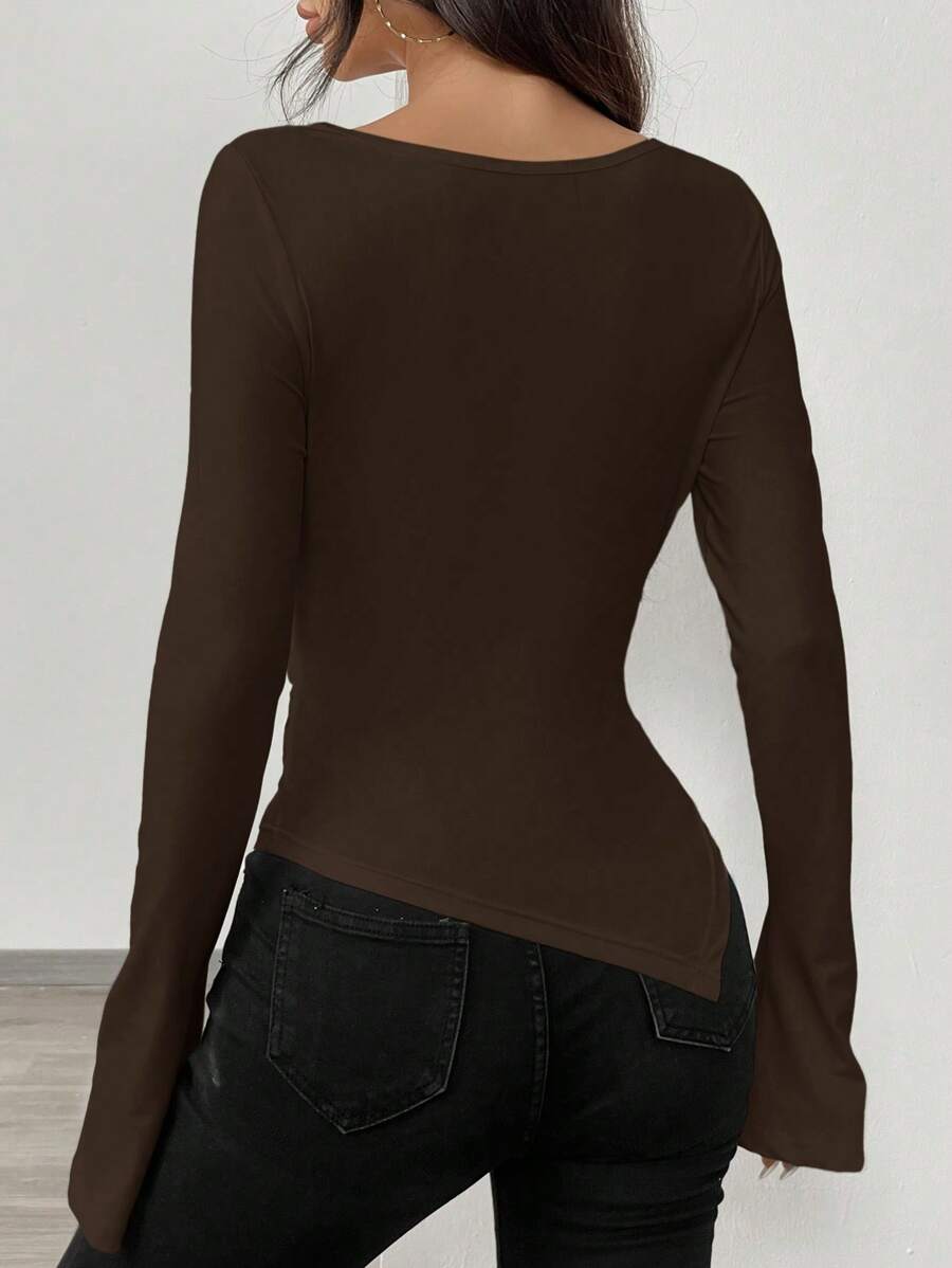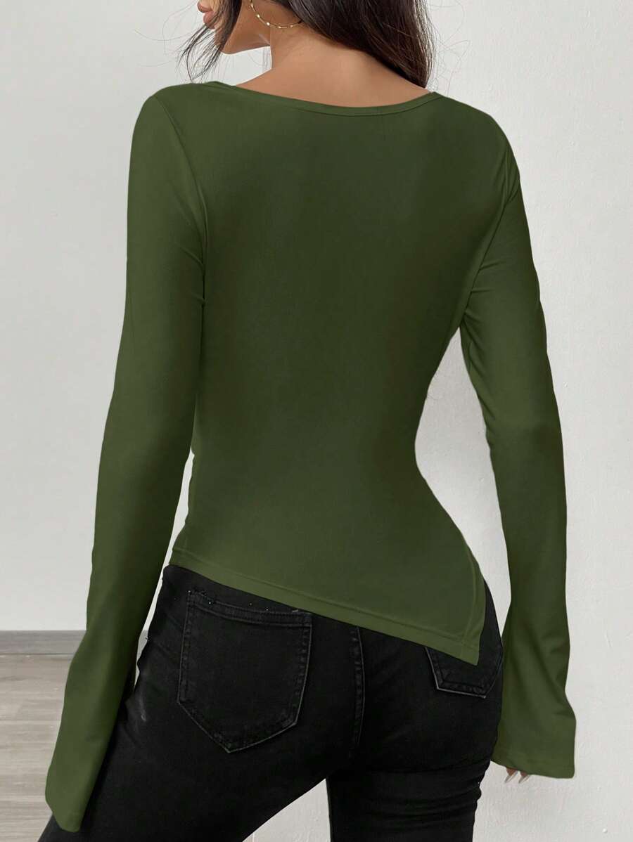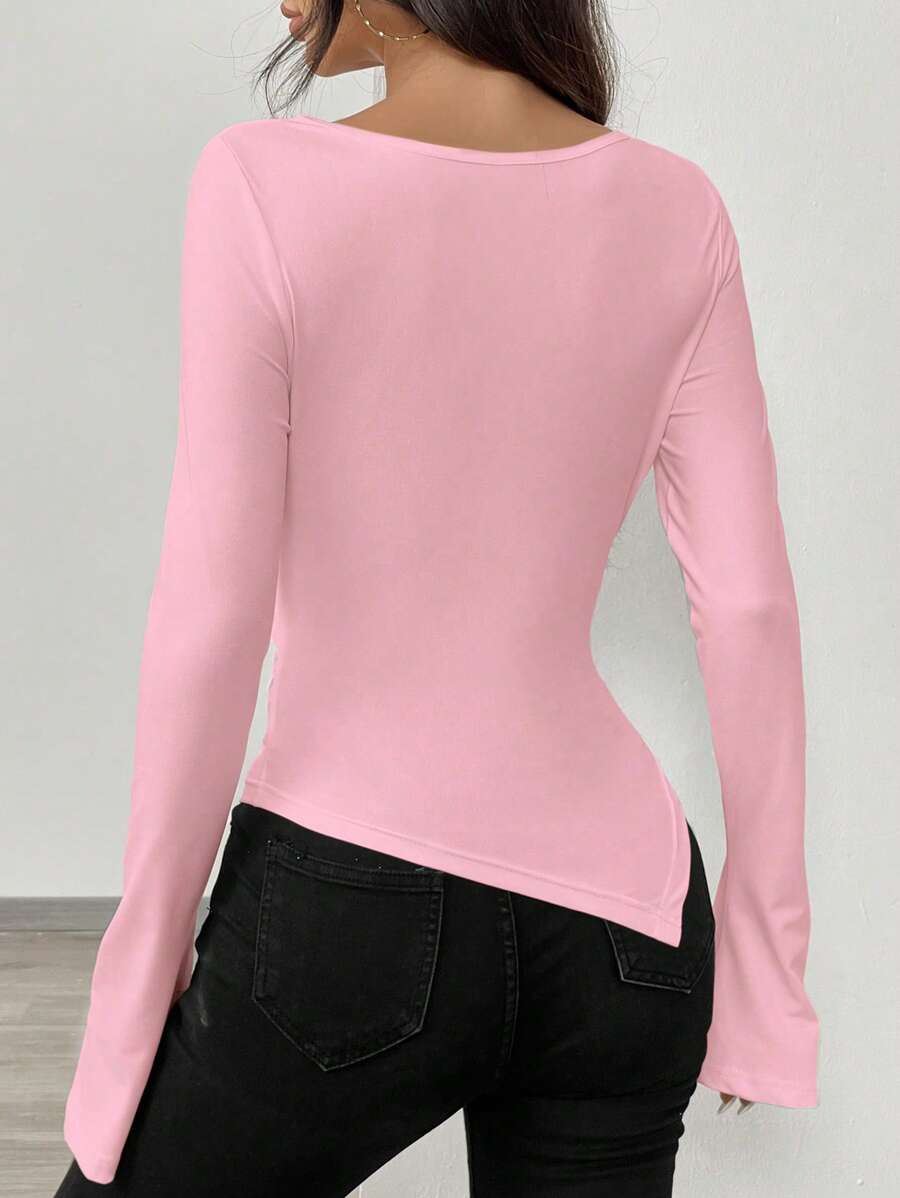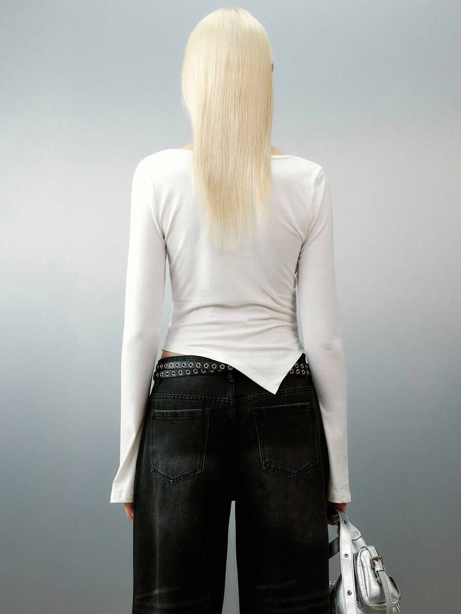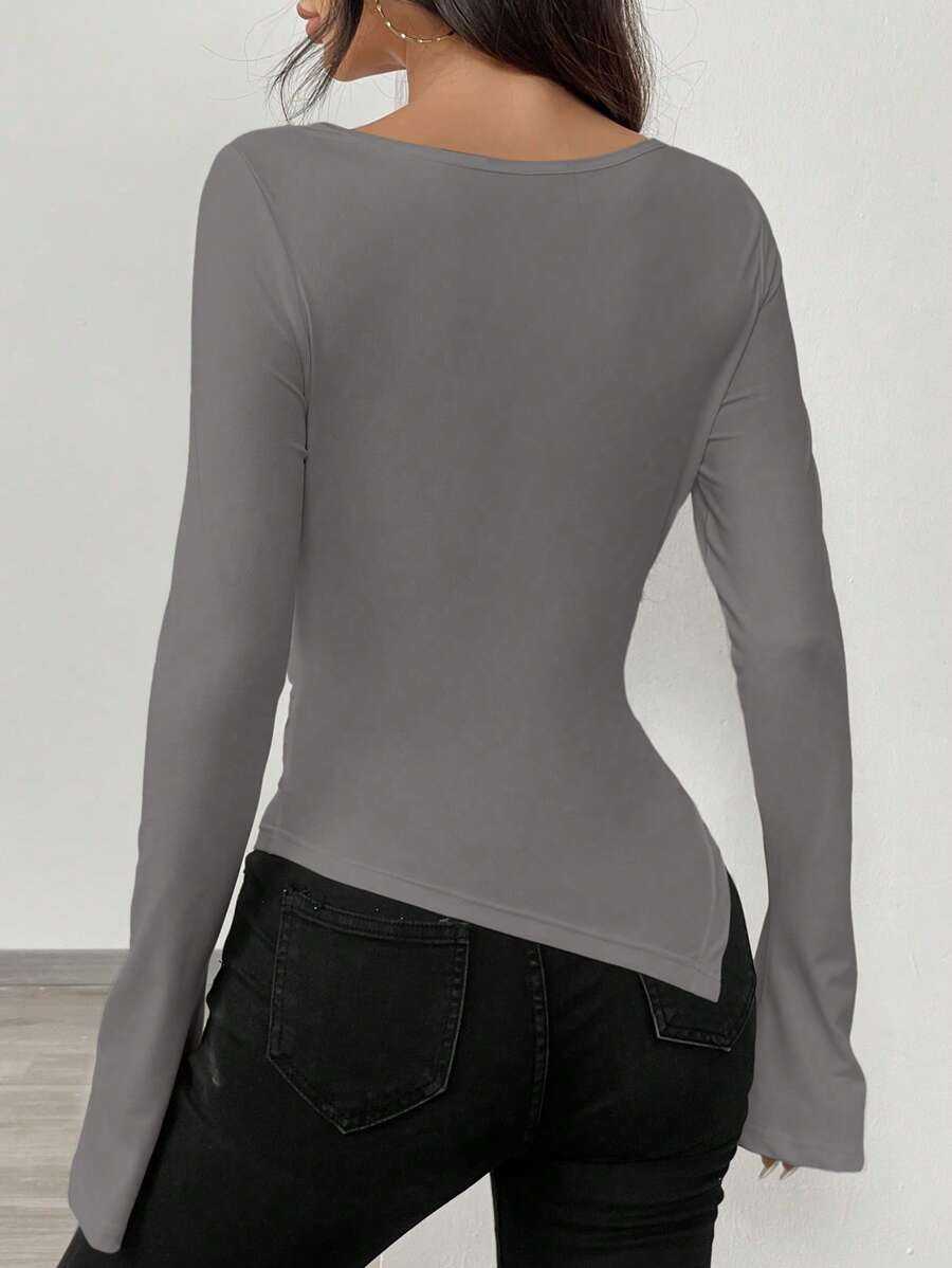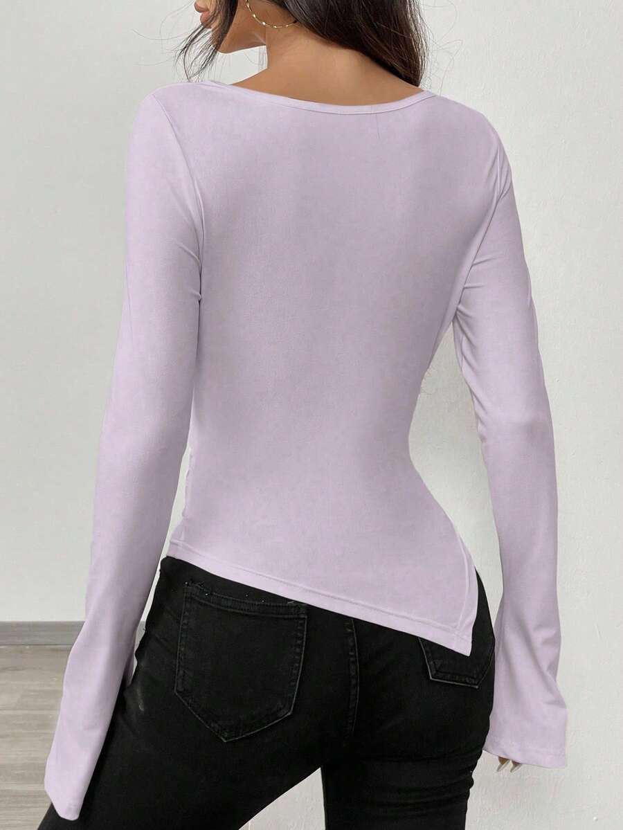 Chiquease Scoop Neck Asymmetrical Hem Knit T-Shirt That Can Be Worn Asymmetrical Neck Fall Cloth For Women