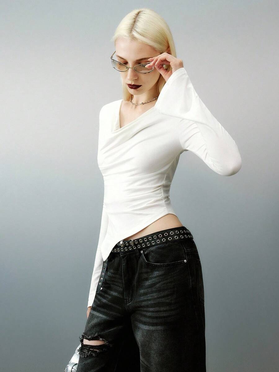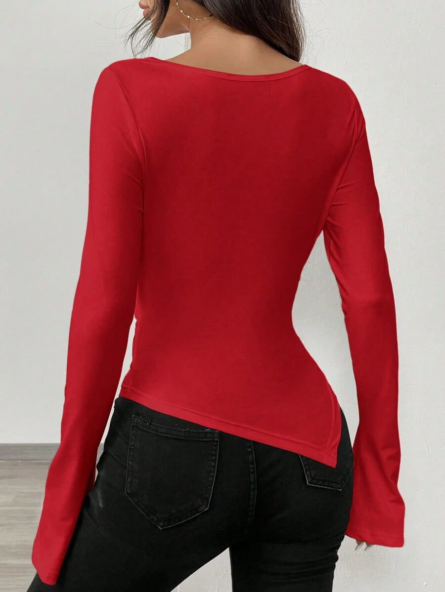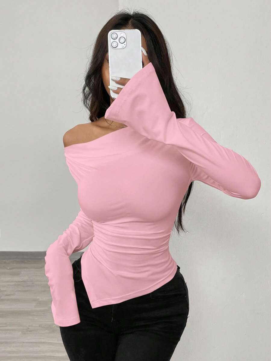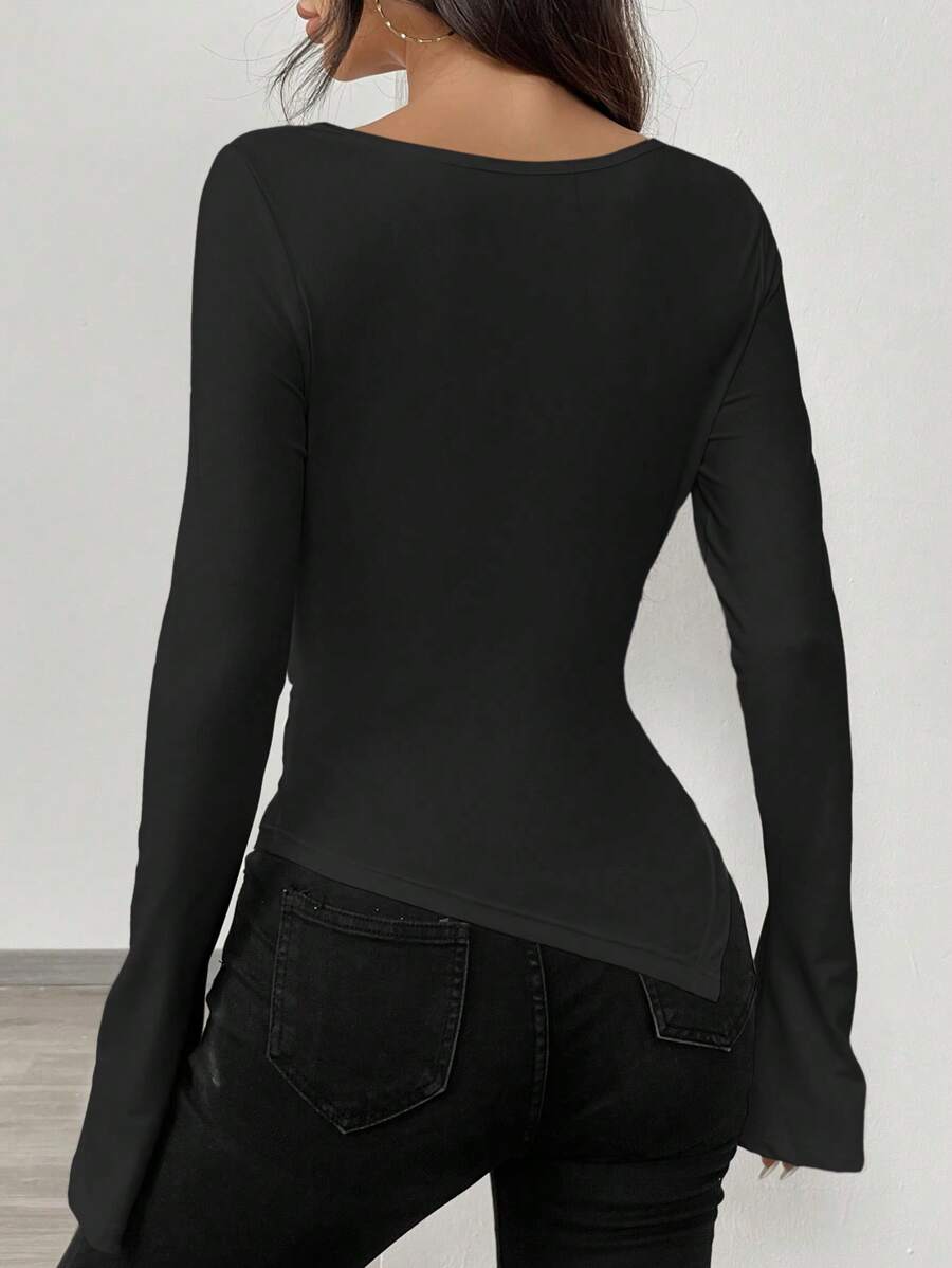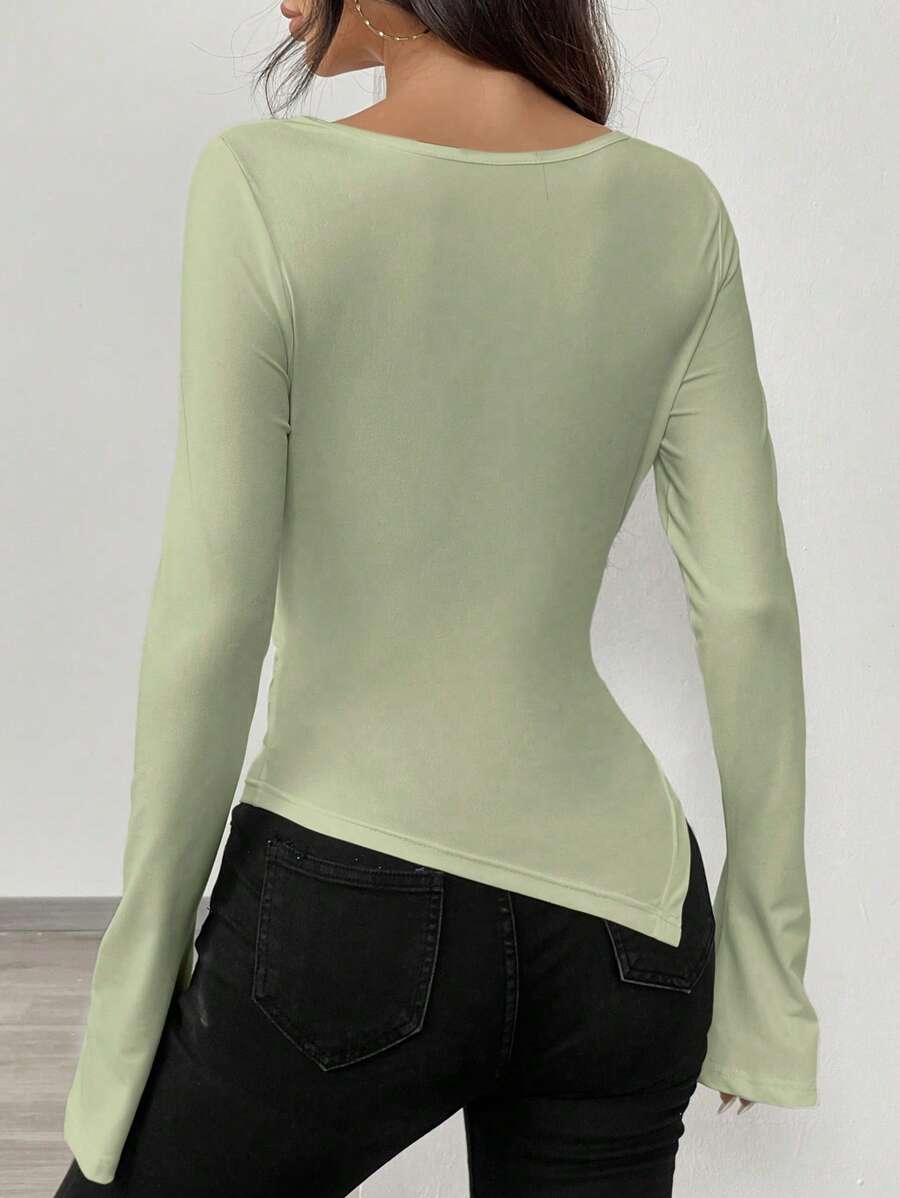 Chiquease Scoop Neck Asymmetrical Hem Knit T-Shirt That Can Be Worn Asymmetrical Neck Fall Cloth For Women