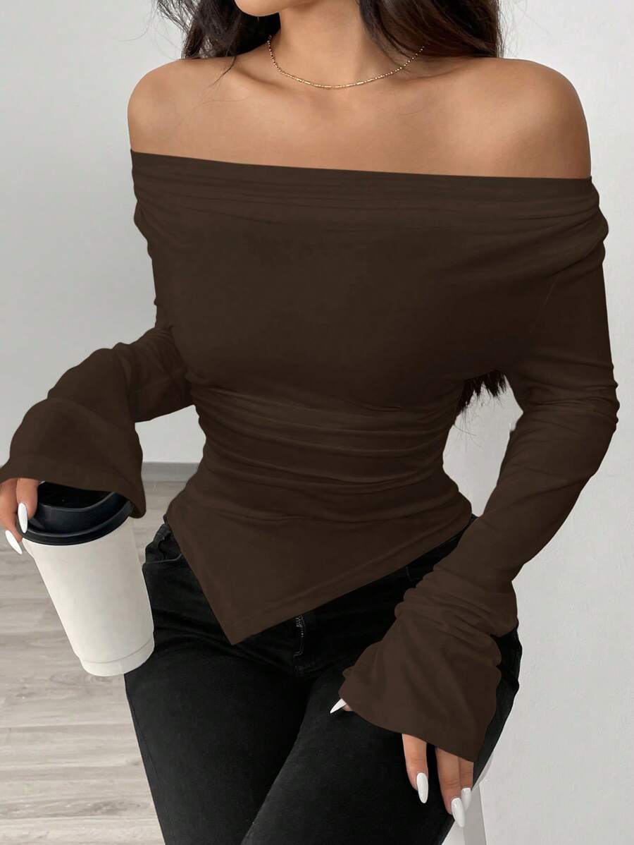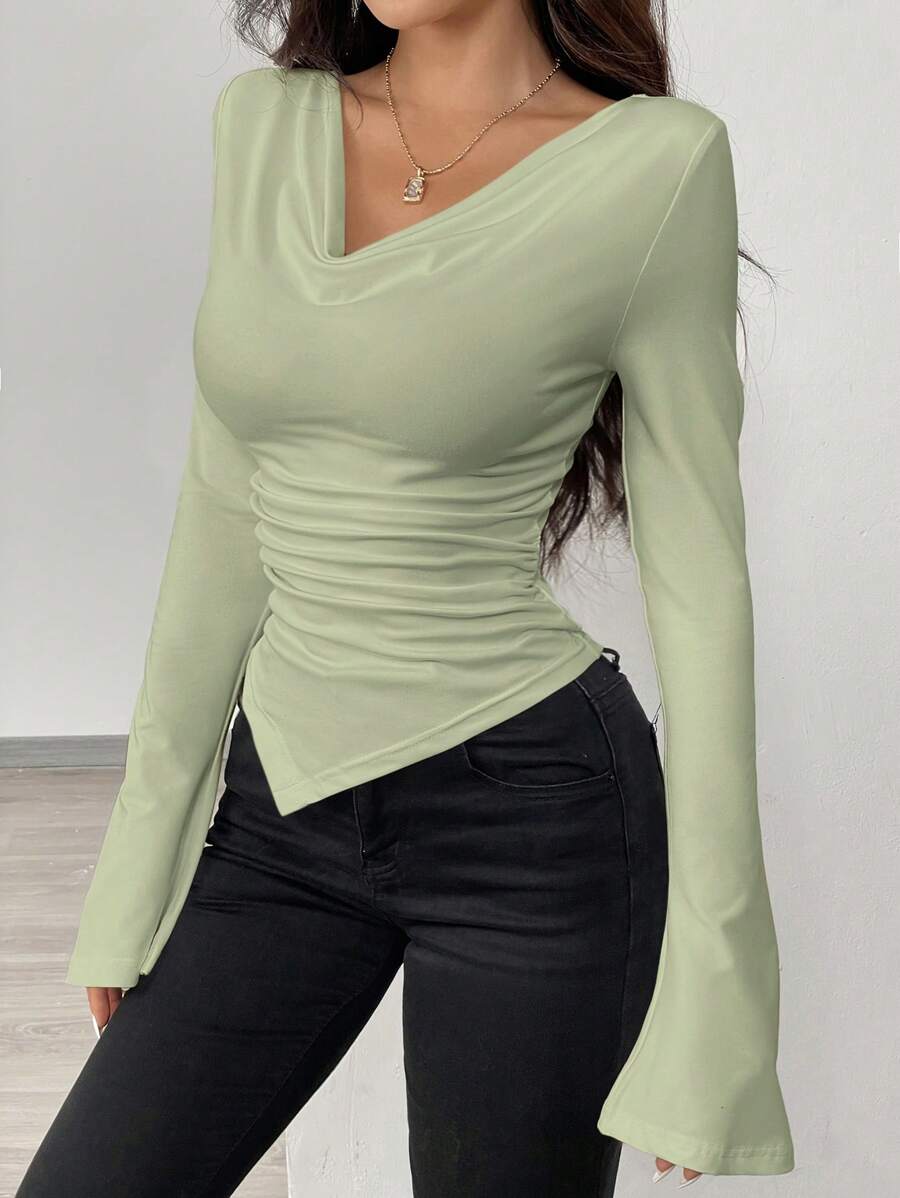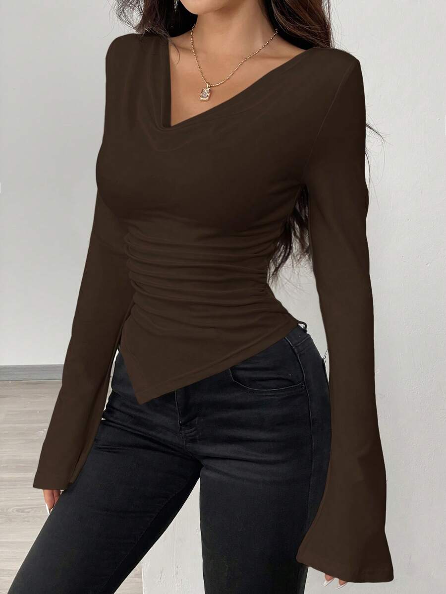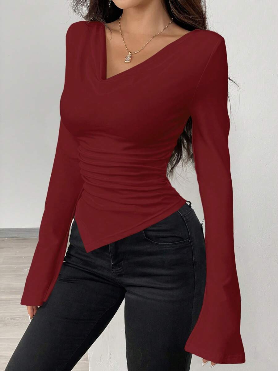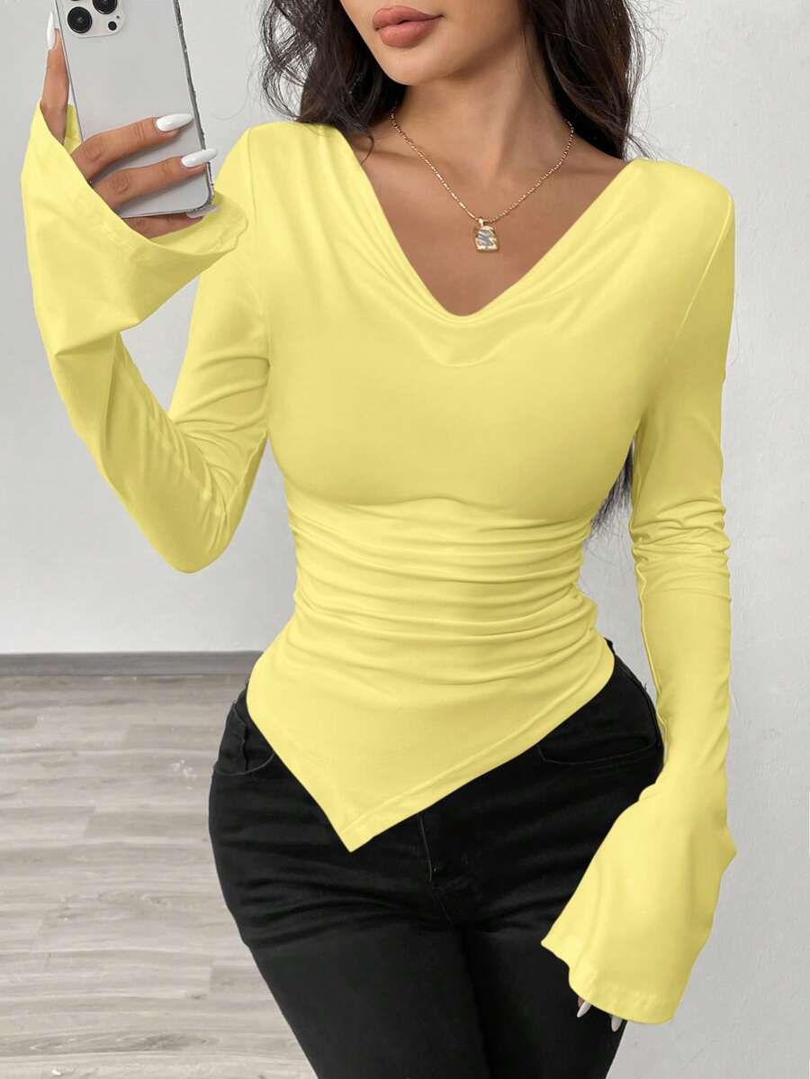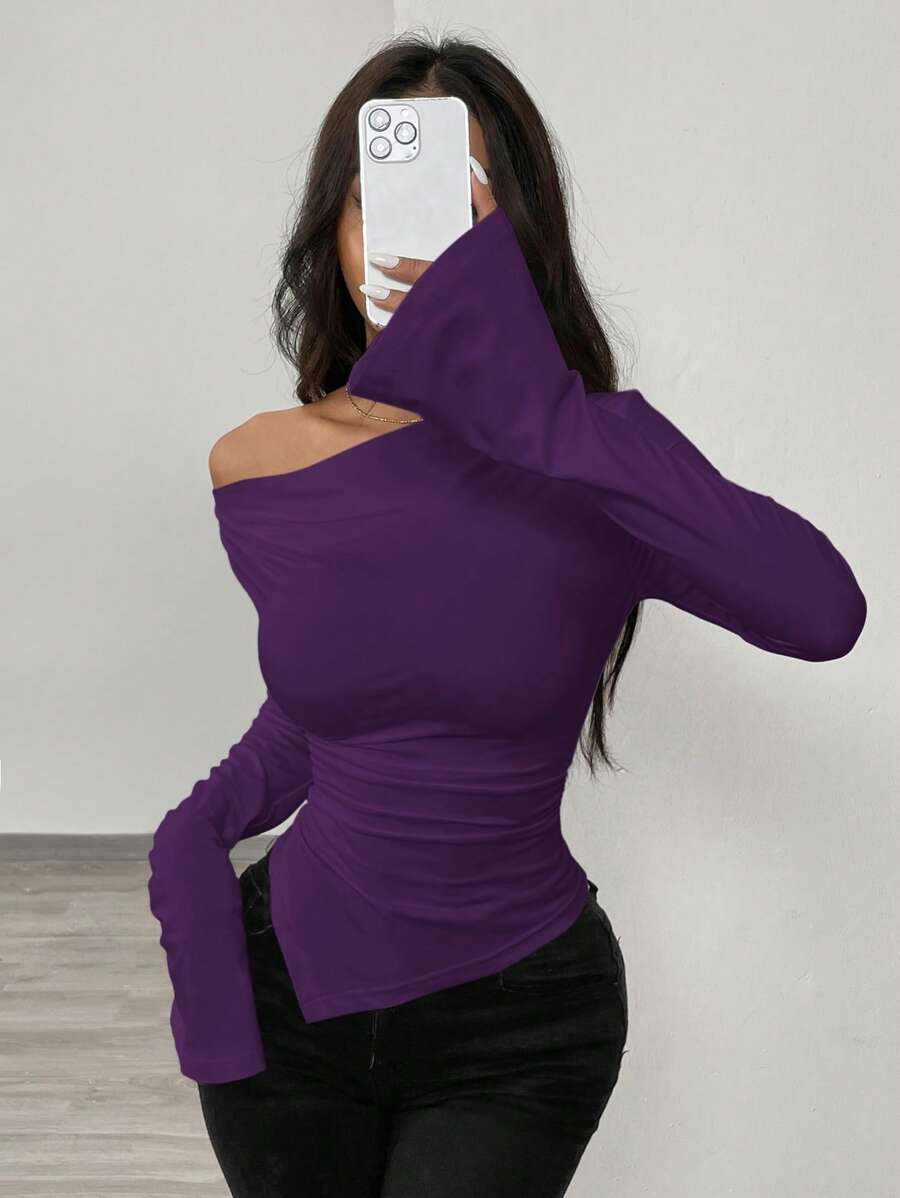 Chiquease Scoop Neck Asymmetrical Hem Knit T-Shirt That Can Be Worn Asymmetrical Neck Fall Cloth For Women