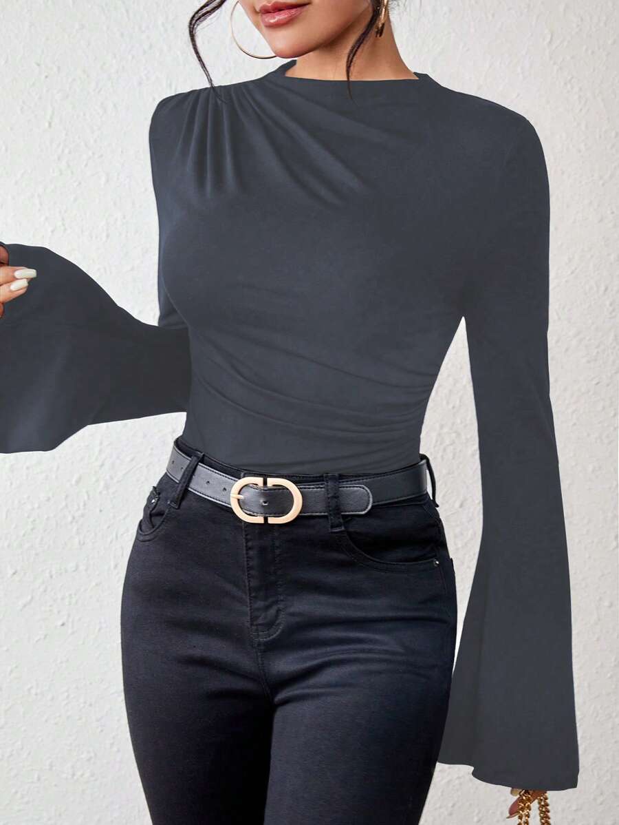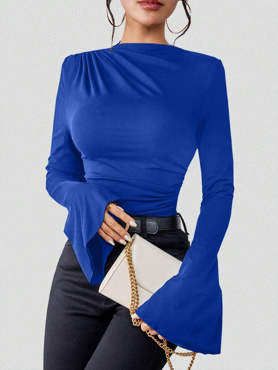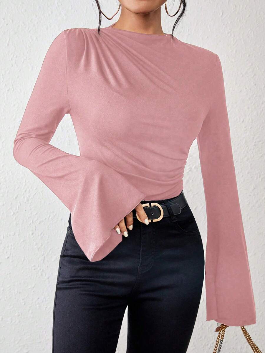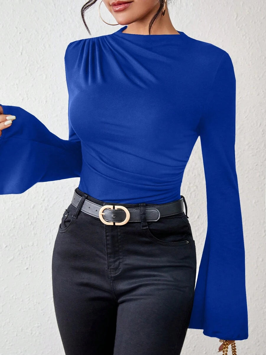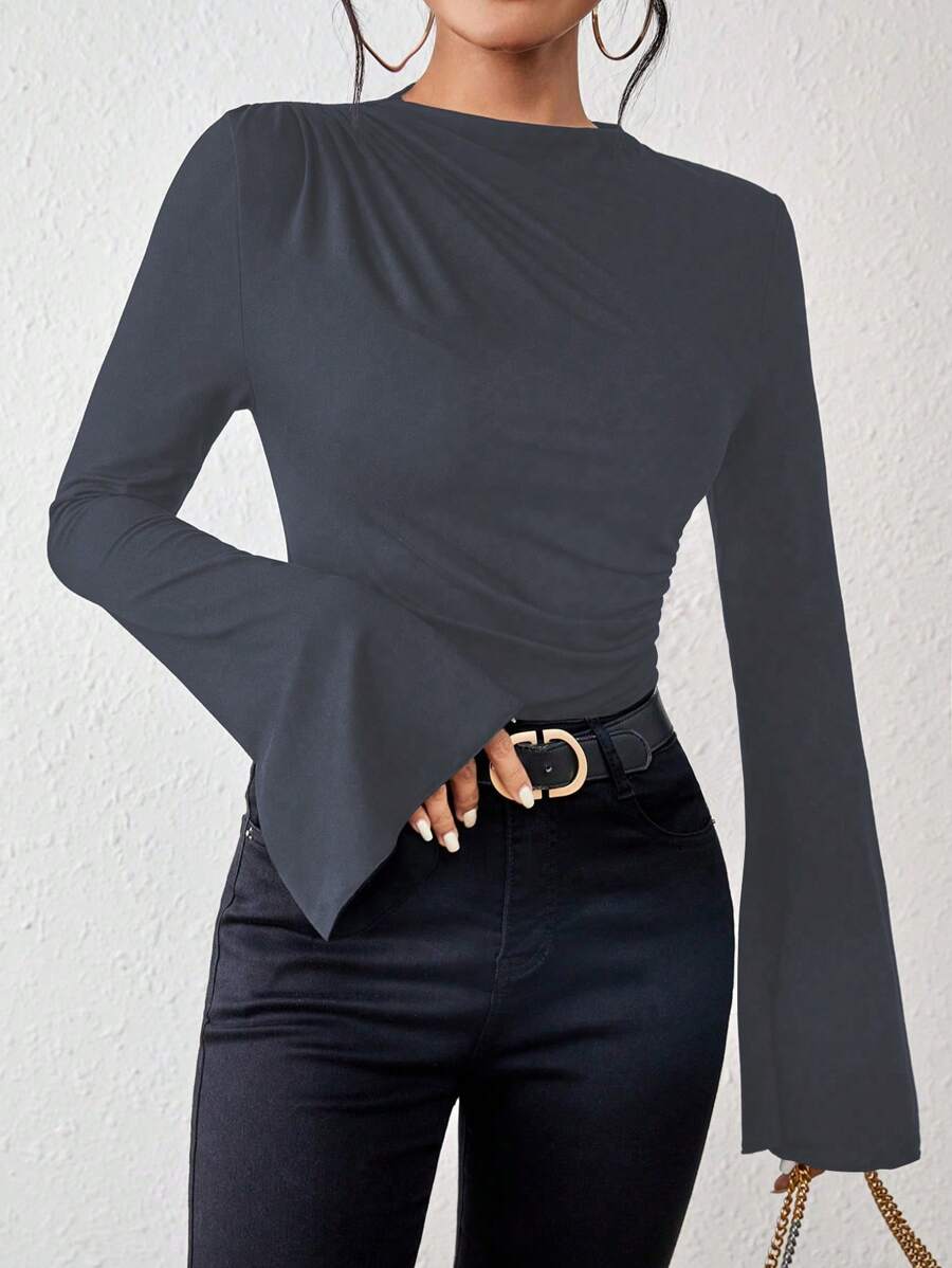 Chiquease Solid Ruched Front Flare Sleeve Tee Fall Cloth For Women