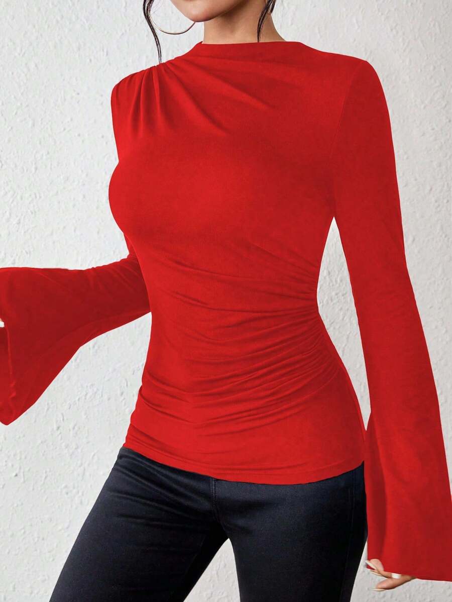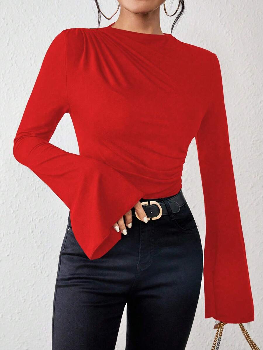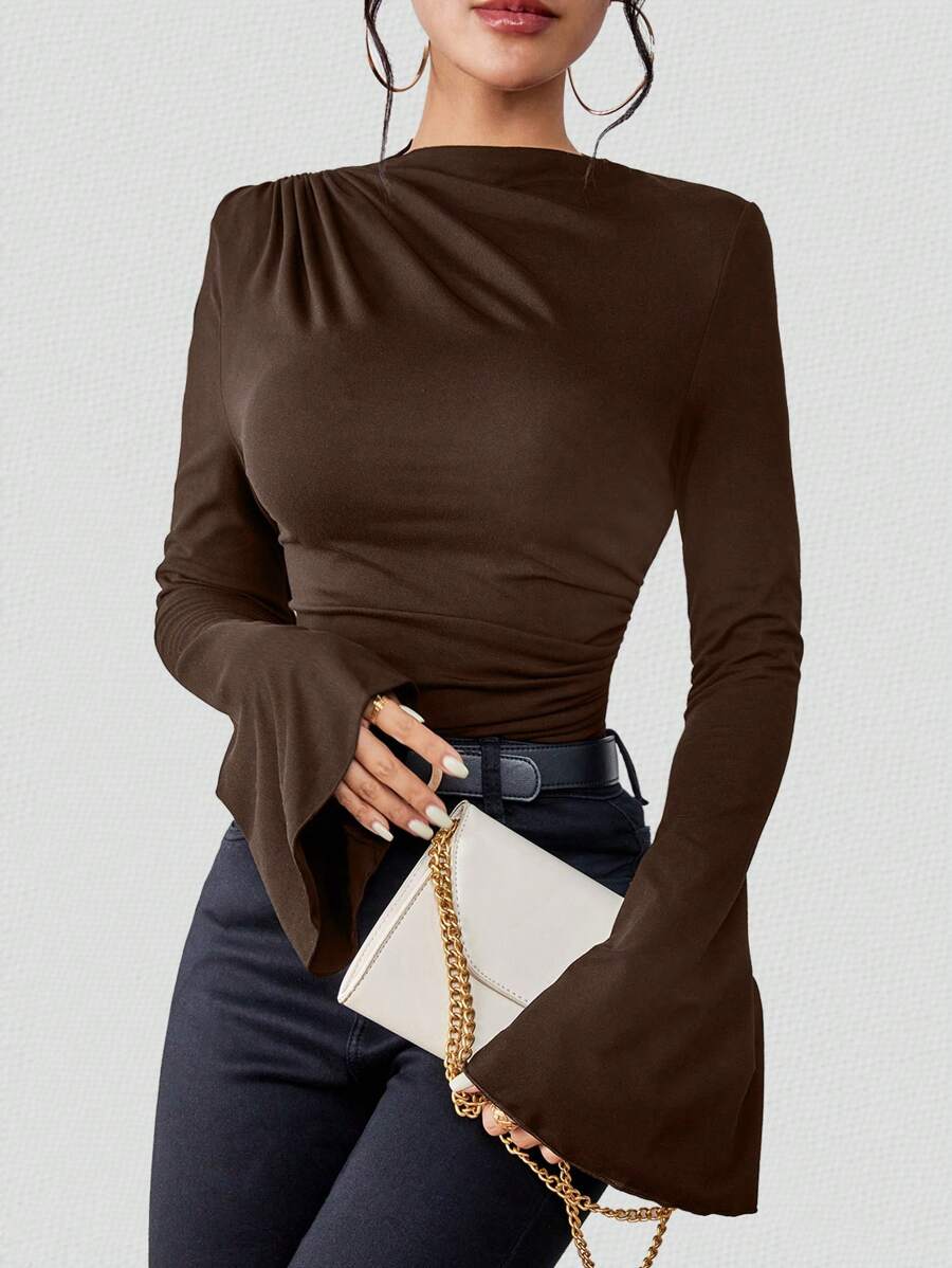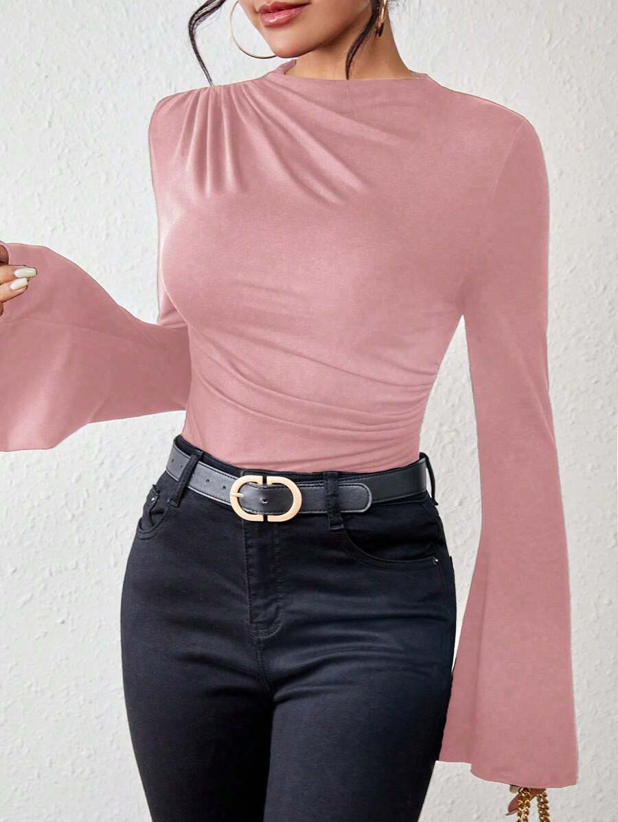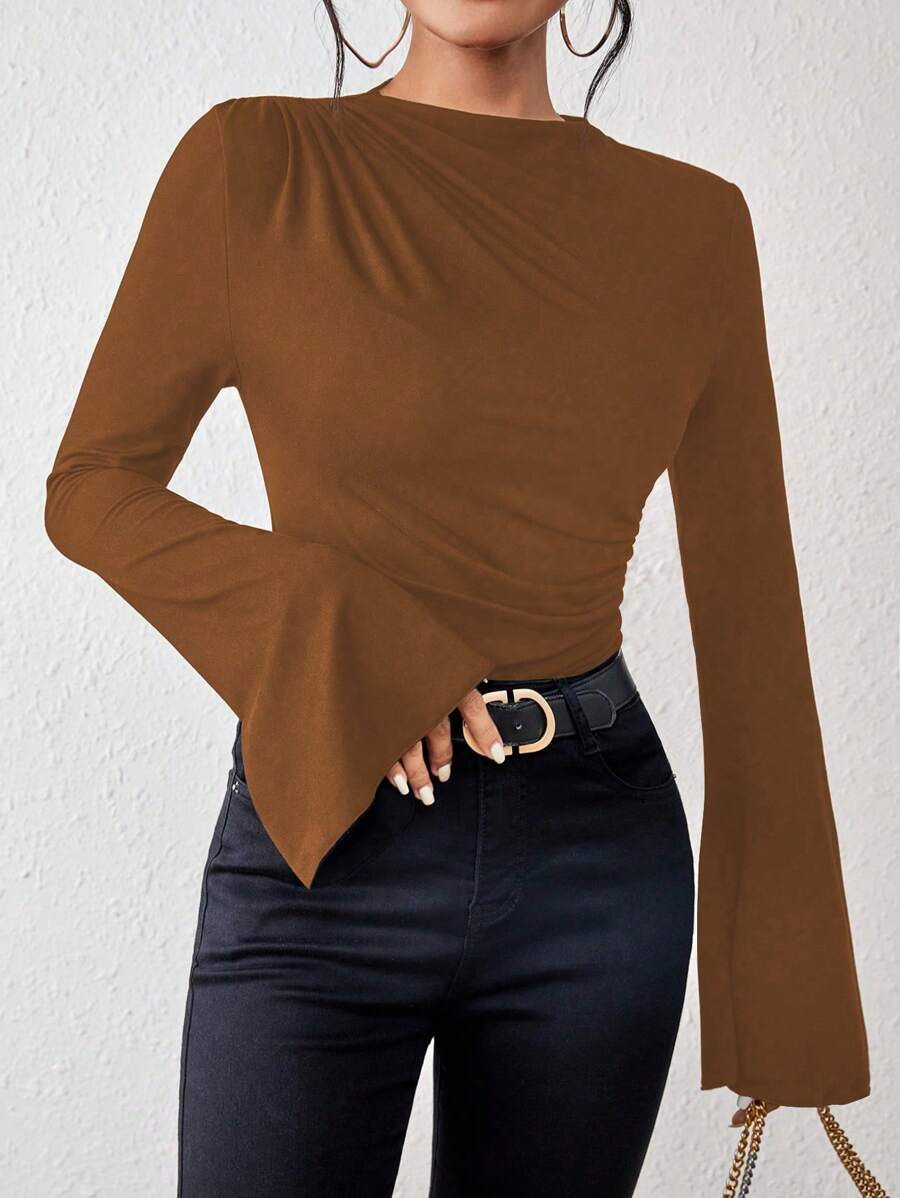Chiquease Solid Ruched Front Flare Sleeve Tee Fall Cloth For Women