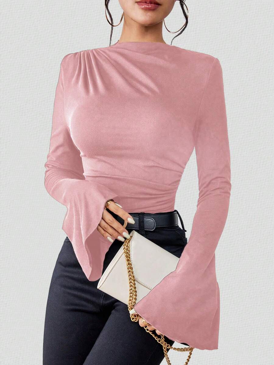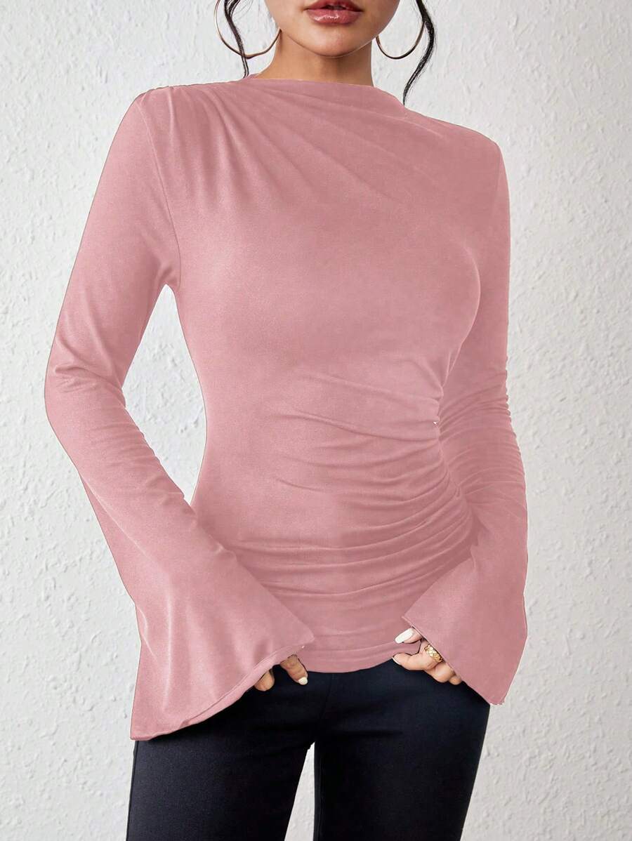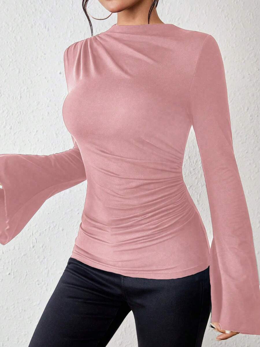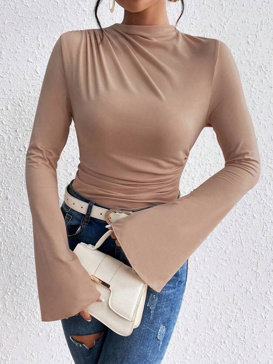 Chiquease Solid Ruched Front Flare Sleeve Tee Fall Cloth For Women