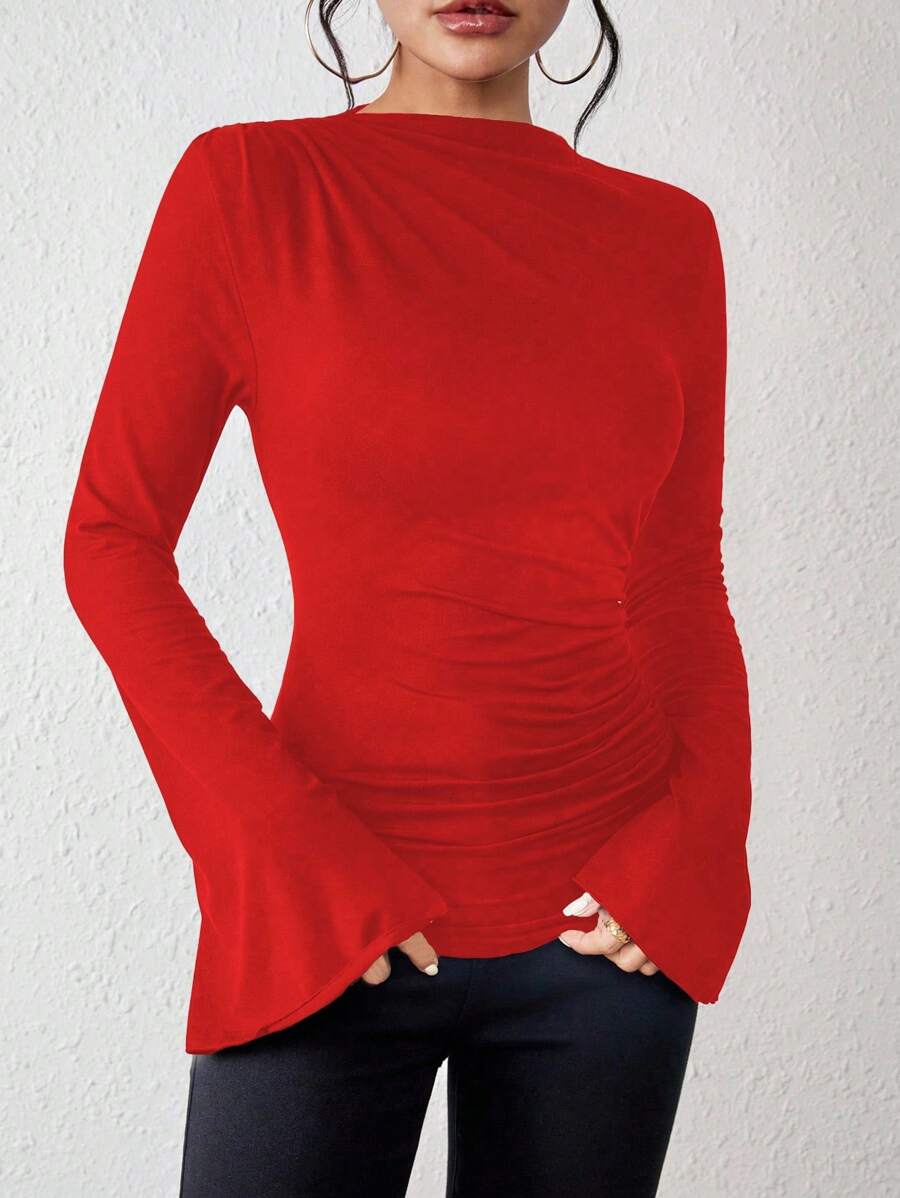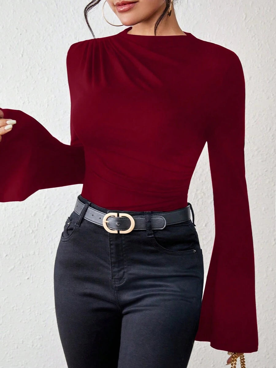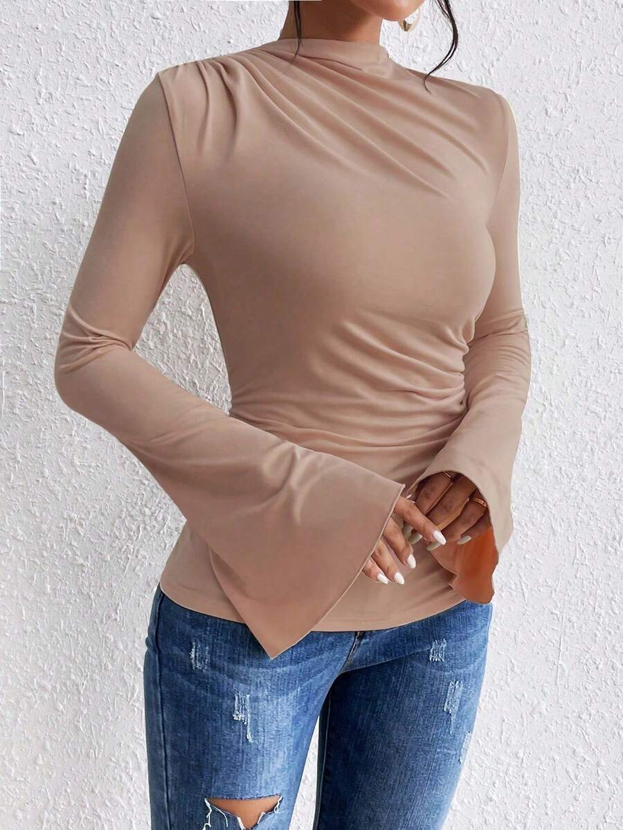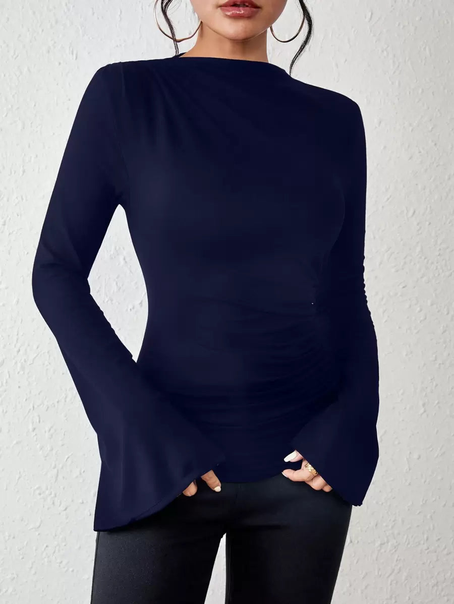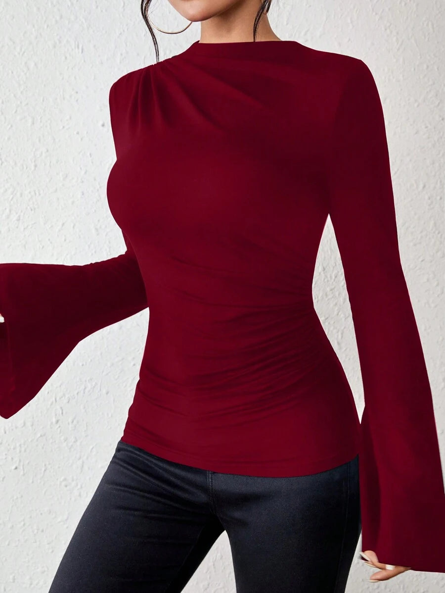 Chiquease Solid Ruched Front Flare Sleeve Tee Fall Cloth For Women