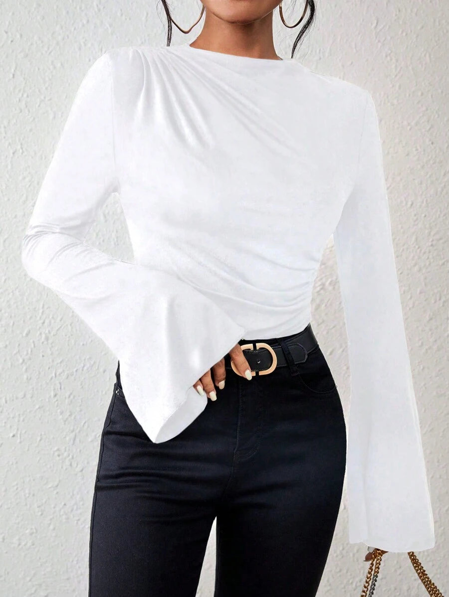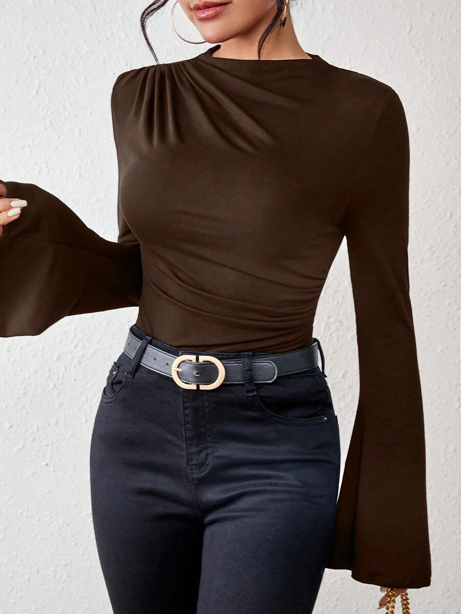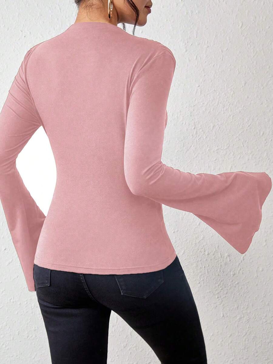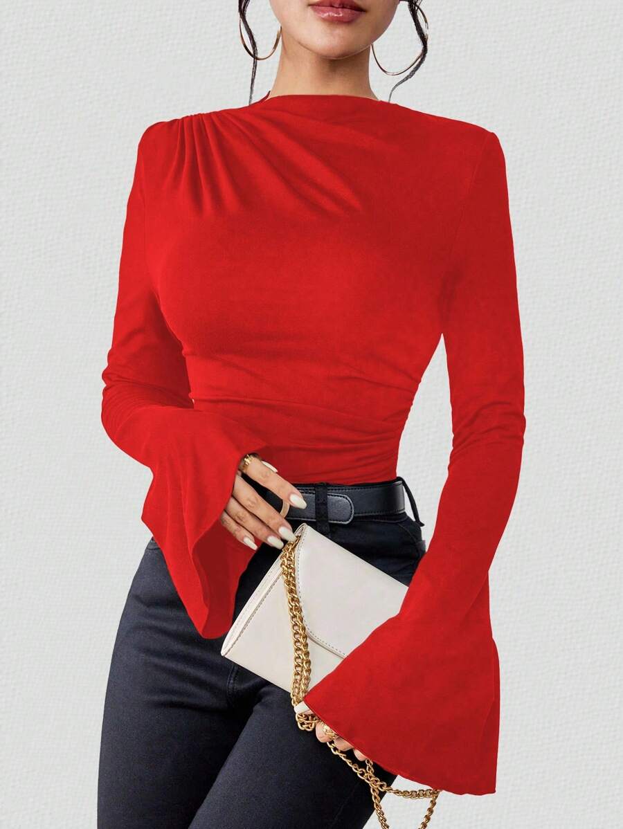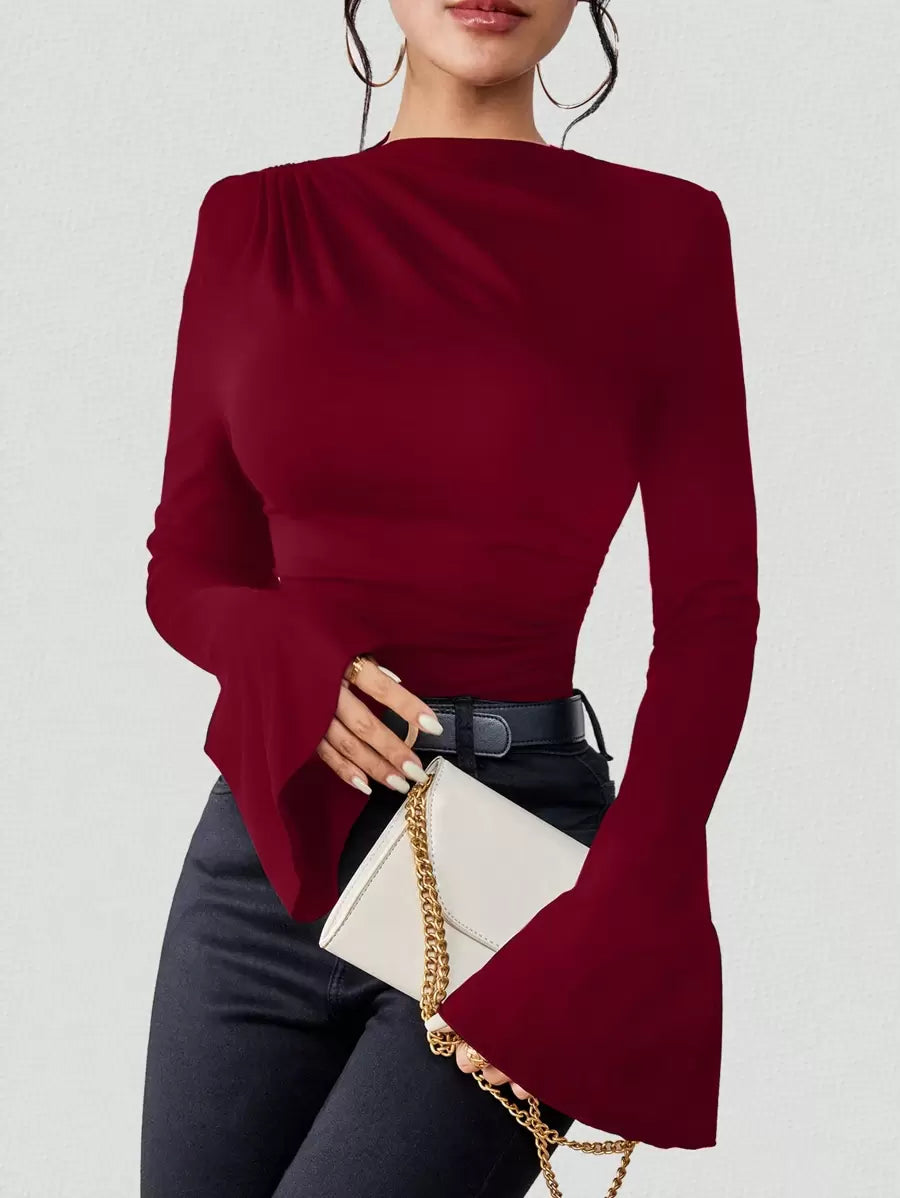 Chiquease Solid Ruched Front Flare Sleeve Tee Fall Cloth For Women