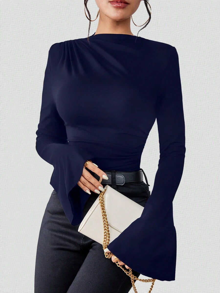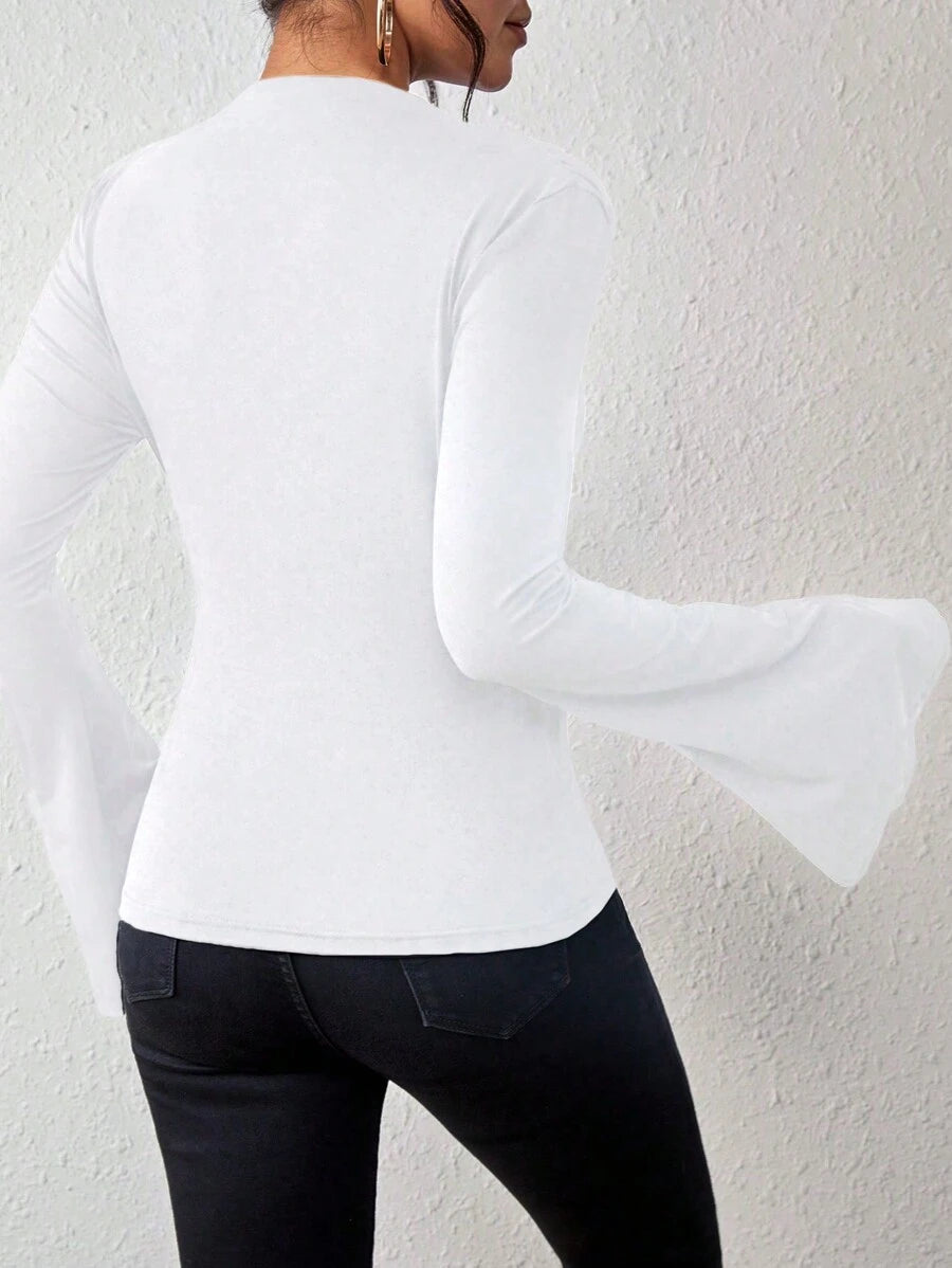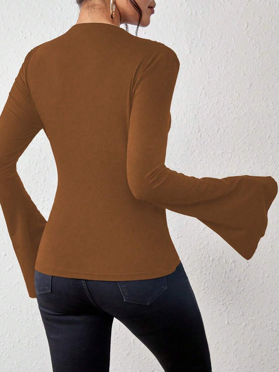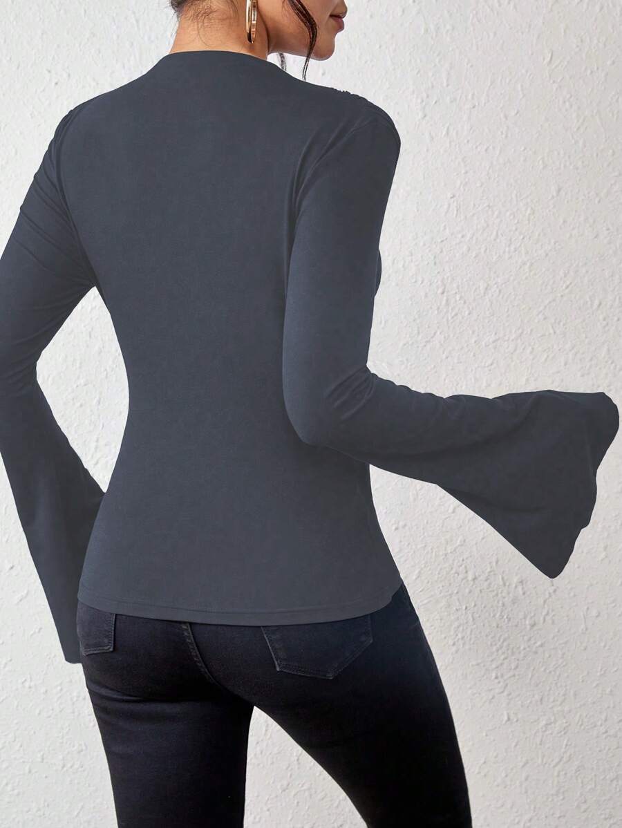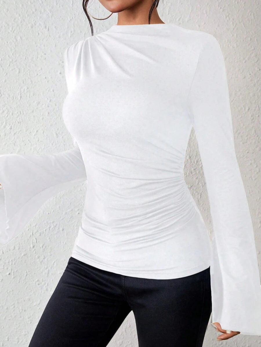 Chiquease Solid Ruched Front Flare Sleeve Tee Fall Cloth For Women
