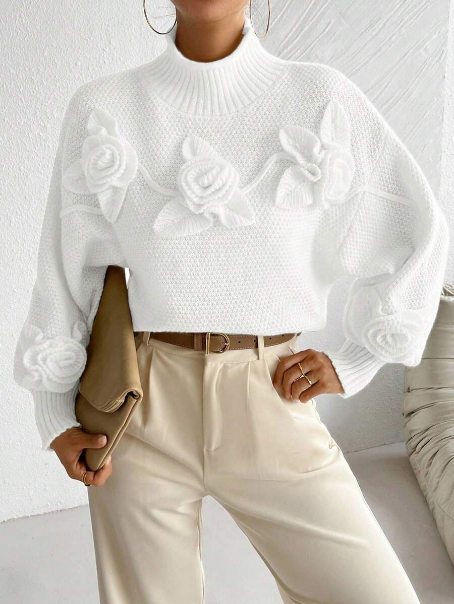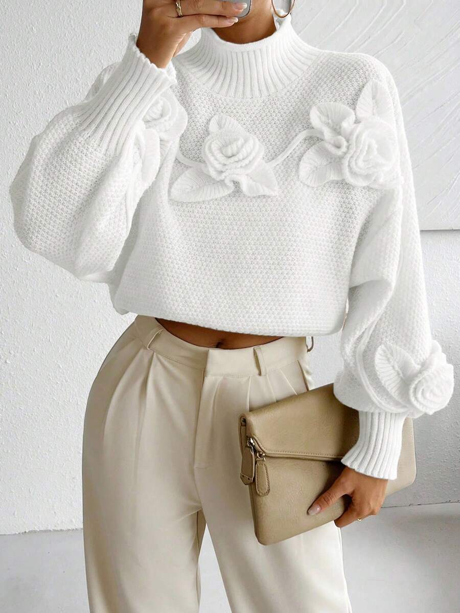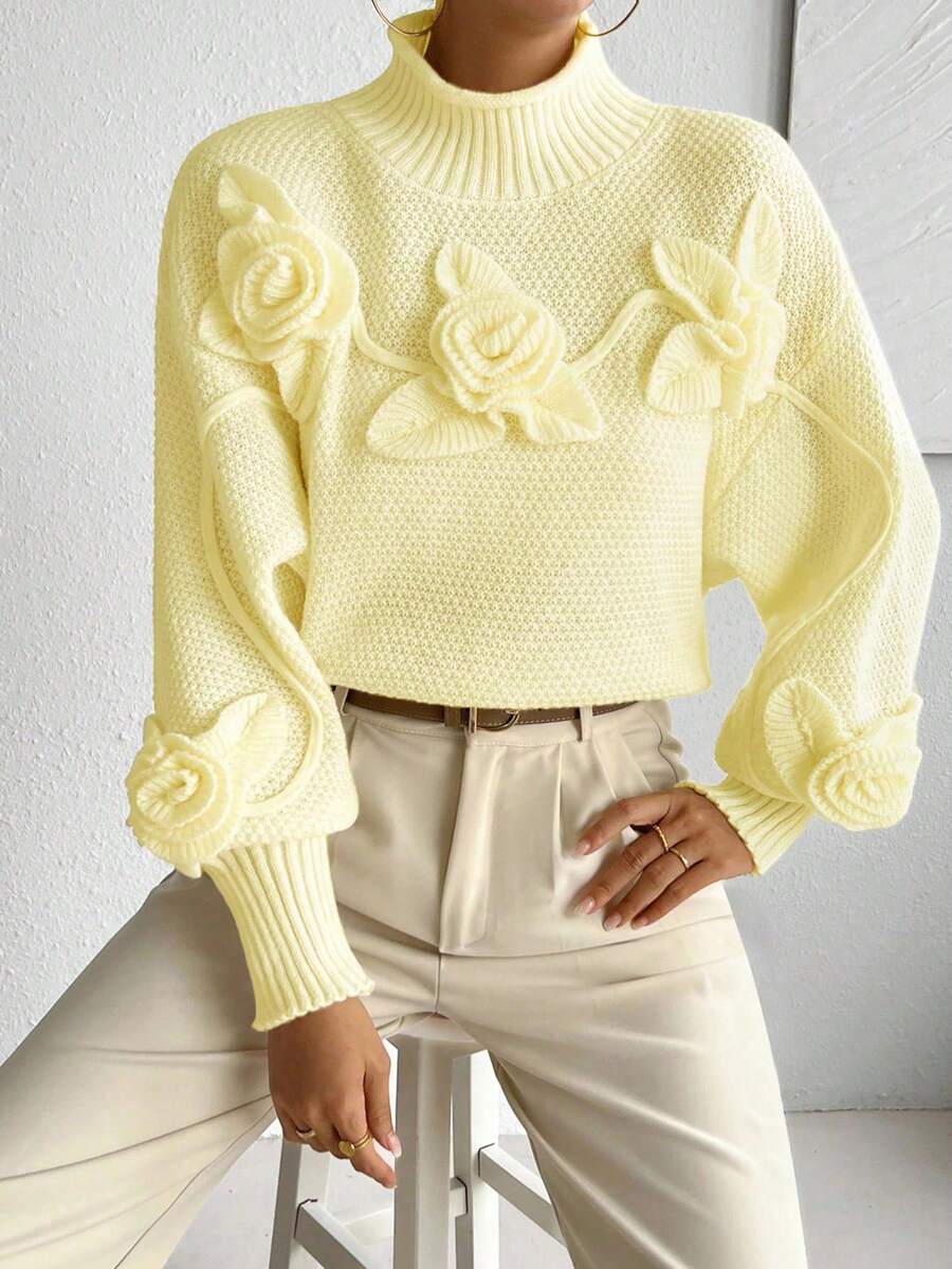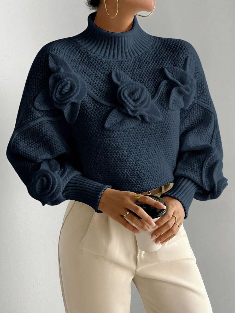 Chiquease Women's Solid Color 3D Floral High Neck Pullover Sweater, Autumn Fall Winter Cloth For Women