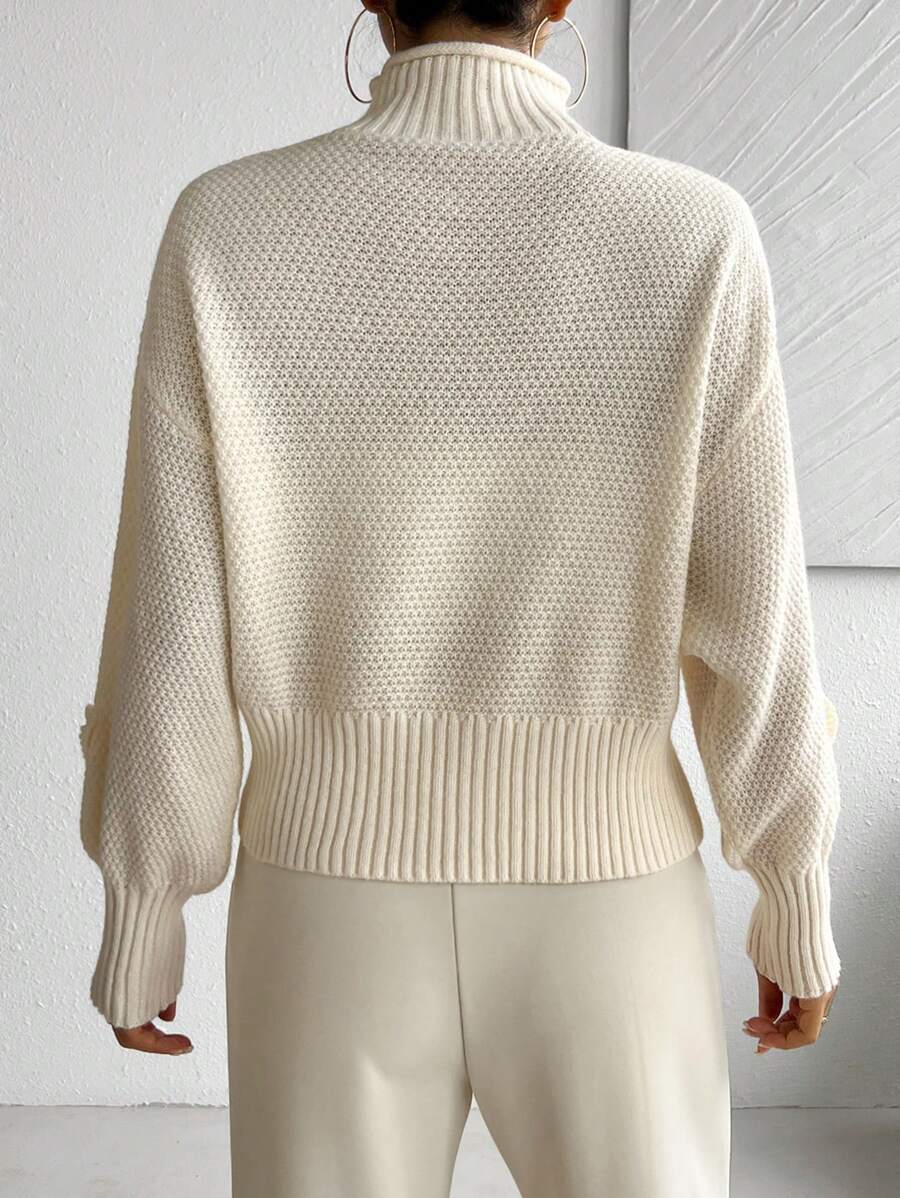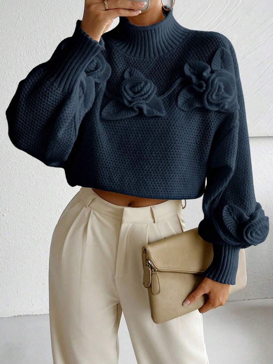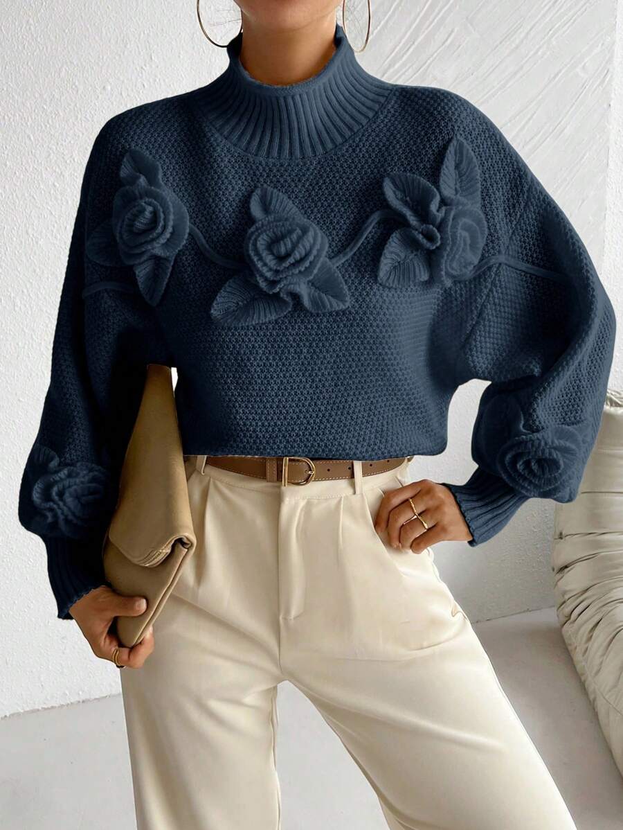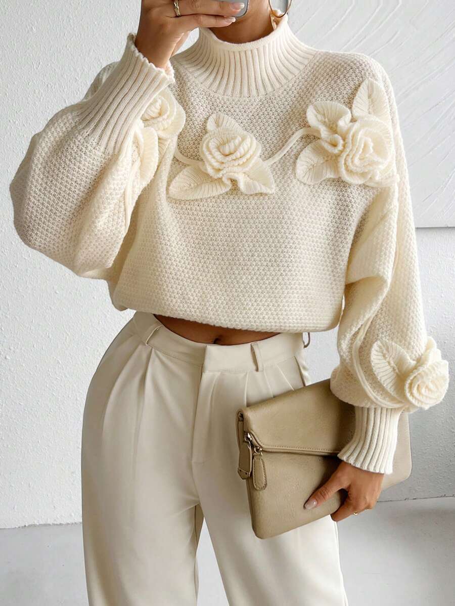 Chiquease Women's Solid Color 3D Floral High Neck Pullover Sweater, Autumn Fall Winter Cloth For Women