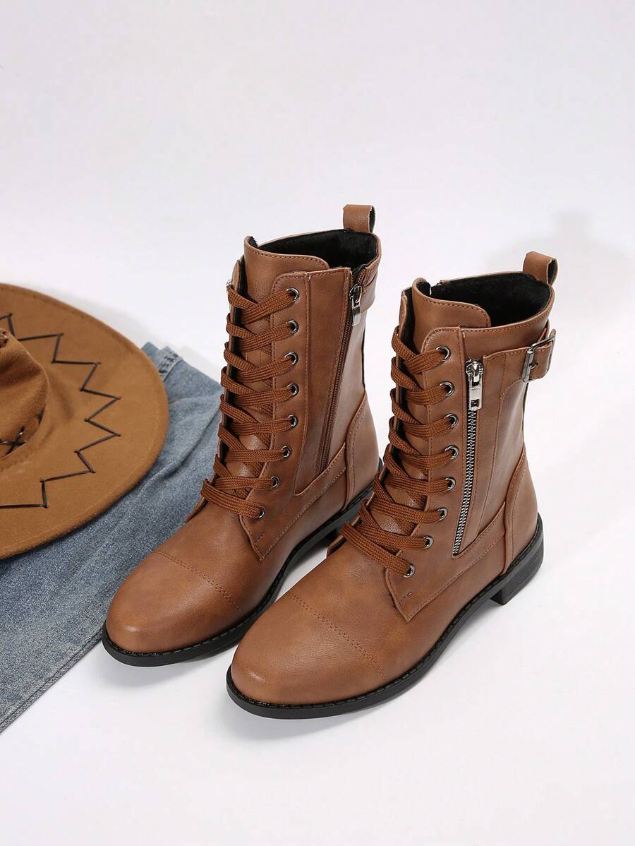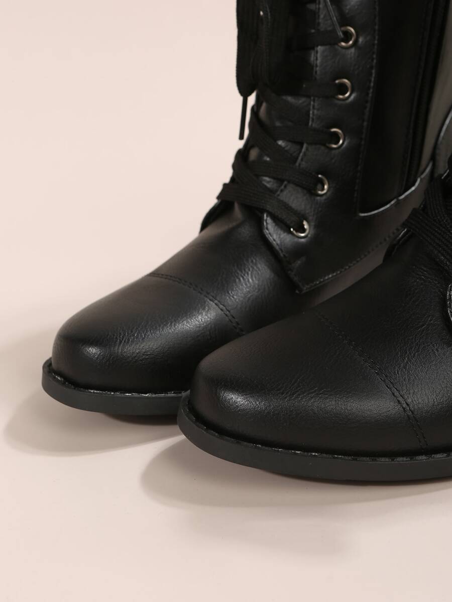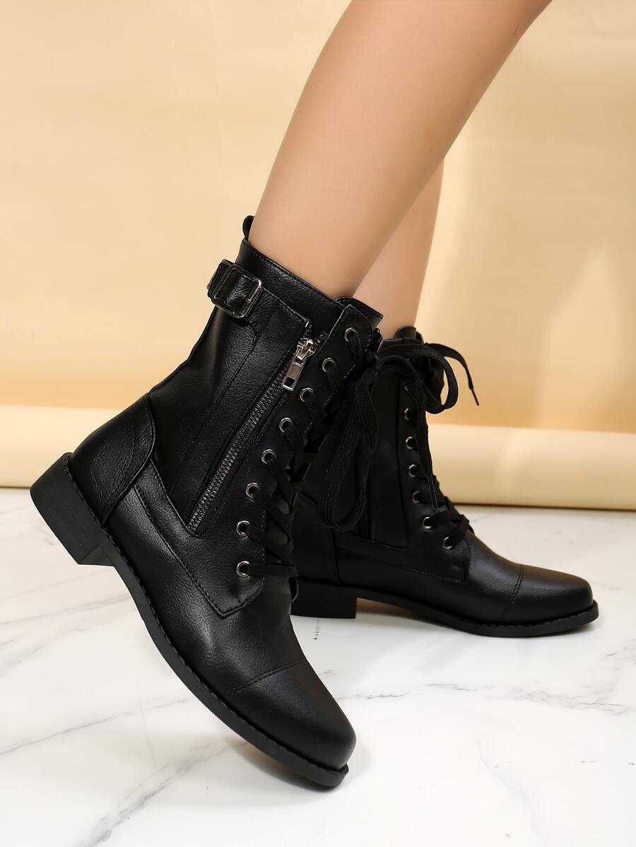 Čizme za borbu s kopčanjem sa strane i vezanjem sprijeda za jesen/zimu 2025, crne, jednostavne, ženske, fashionable punk čizme