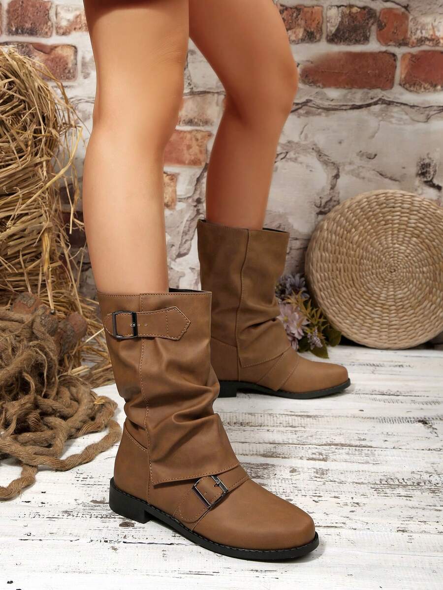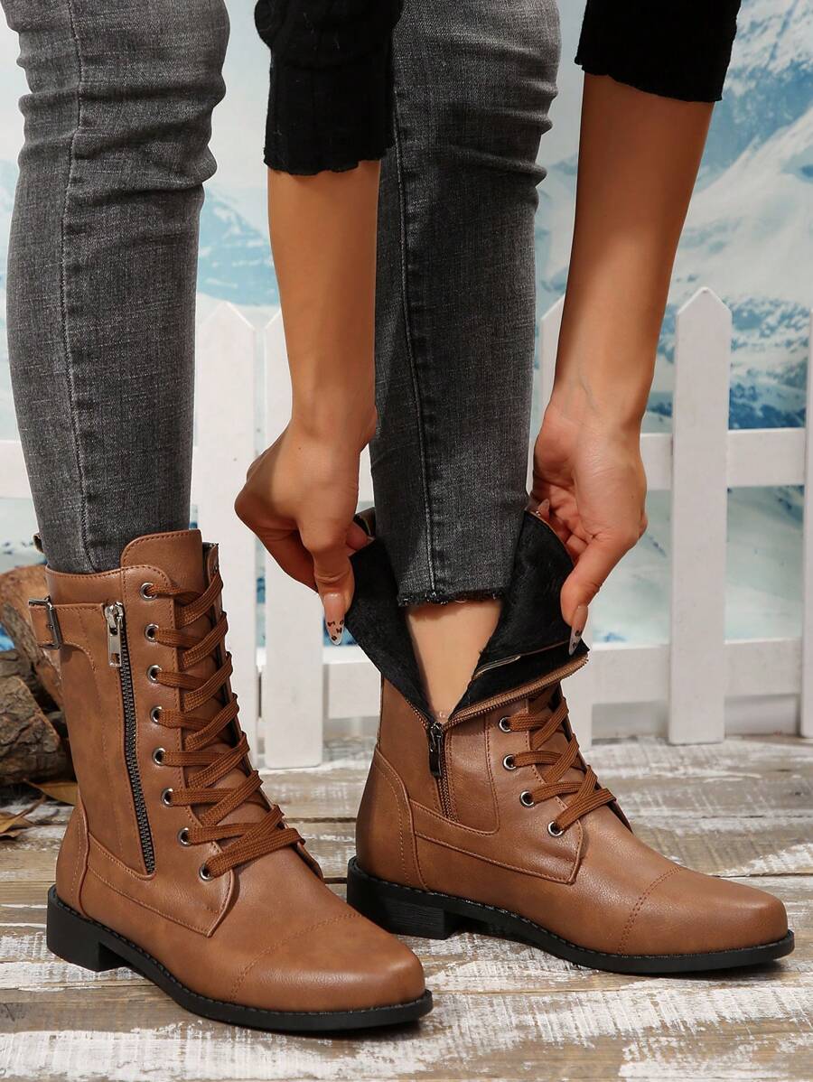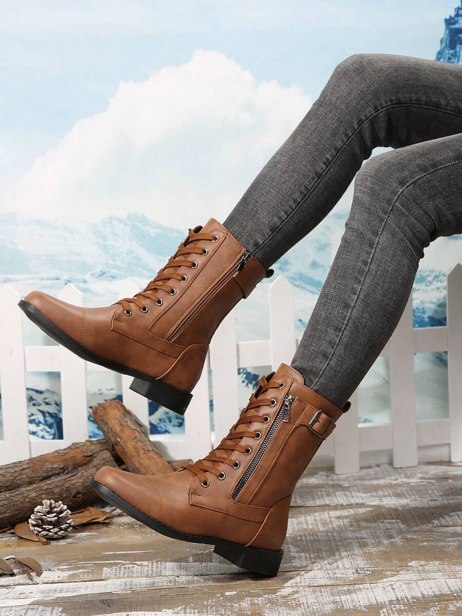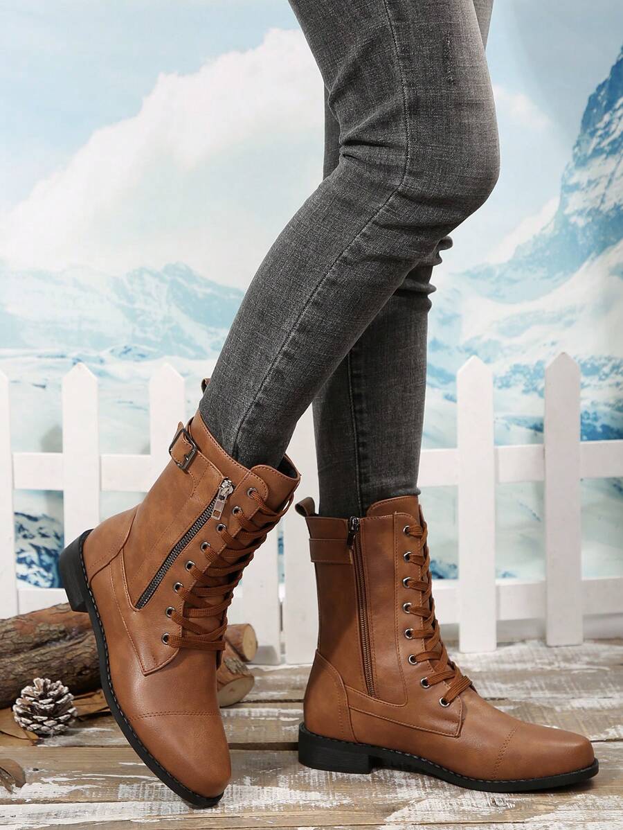Čizme za borbu s kopčanjem sa strane i vezanjem sprijeda za jesen/zimu 2025, crne, jednostavne, ženske, fashionable punk čizme