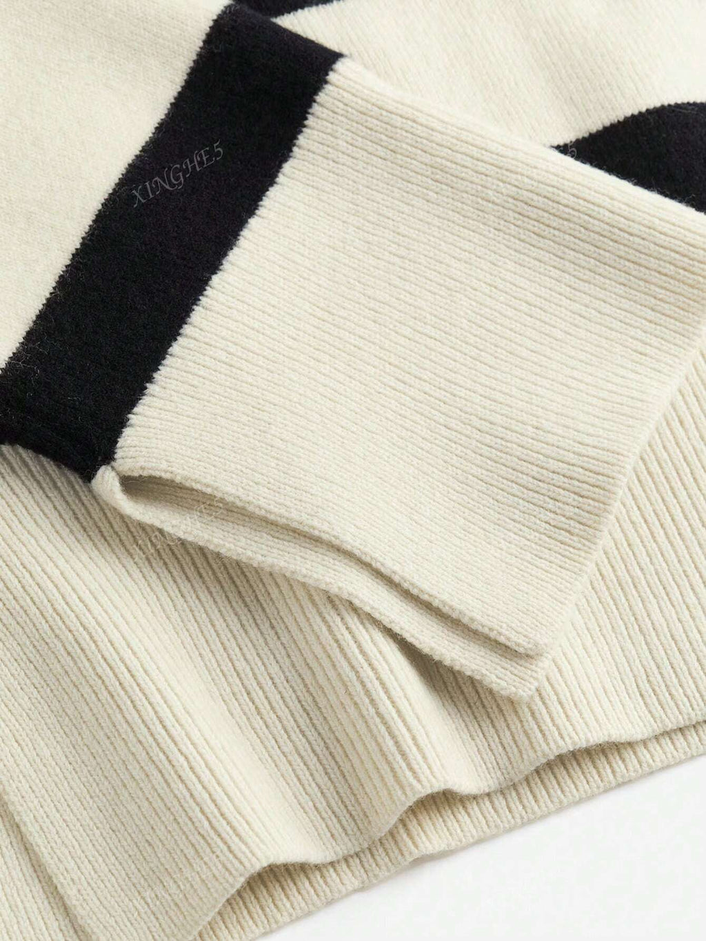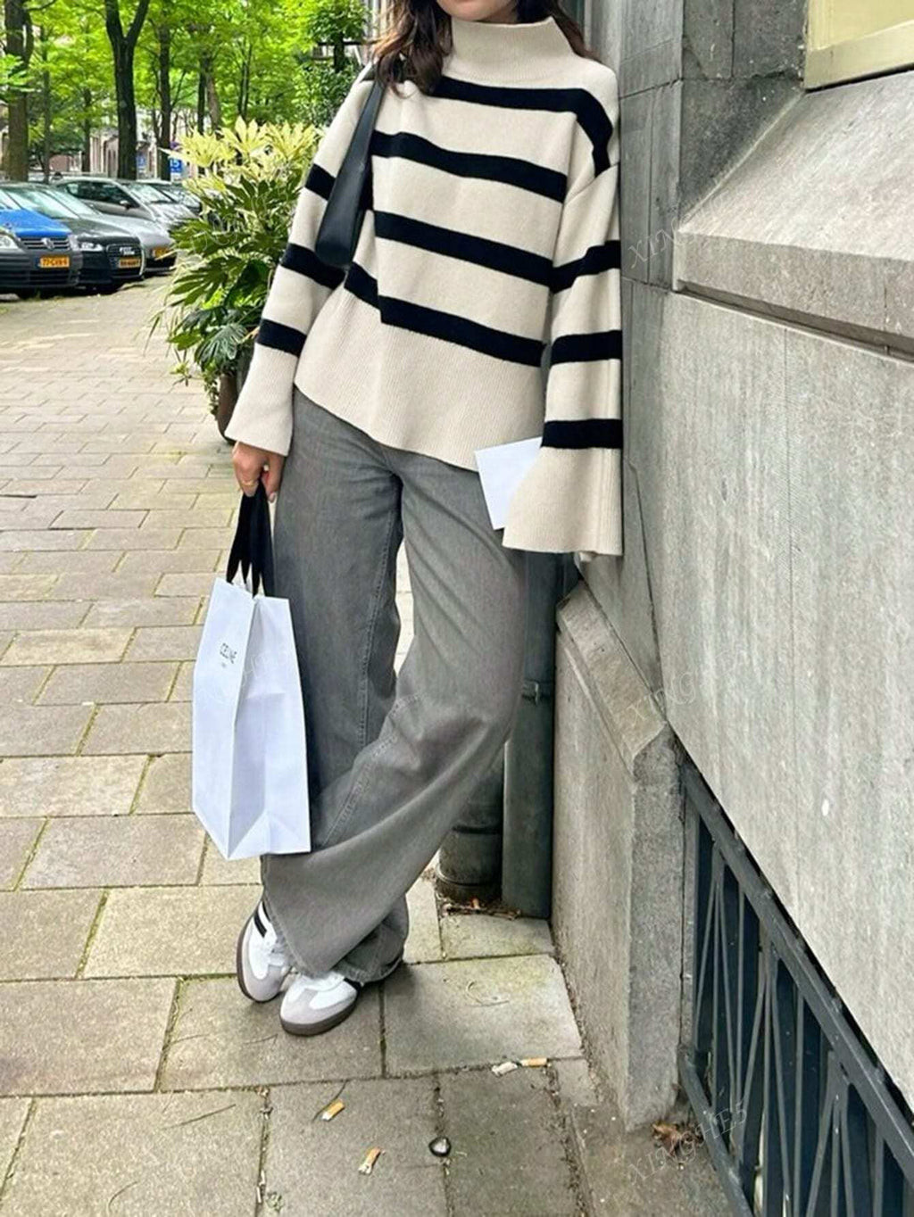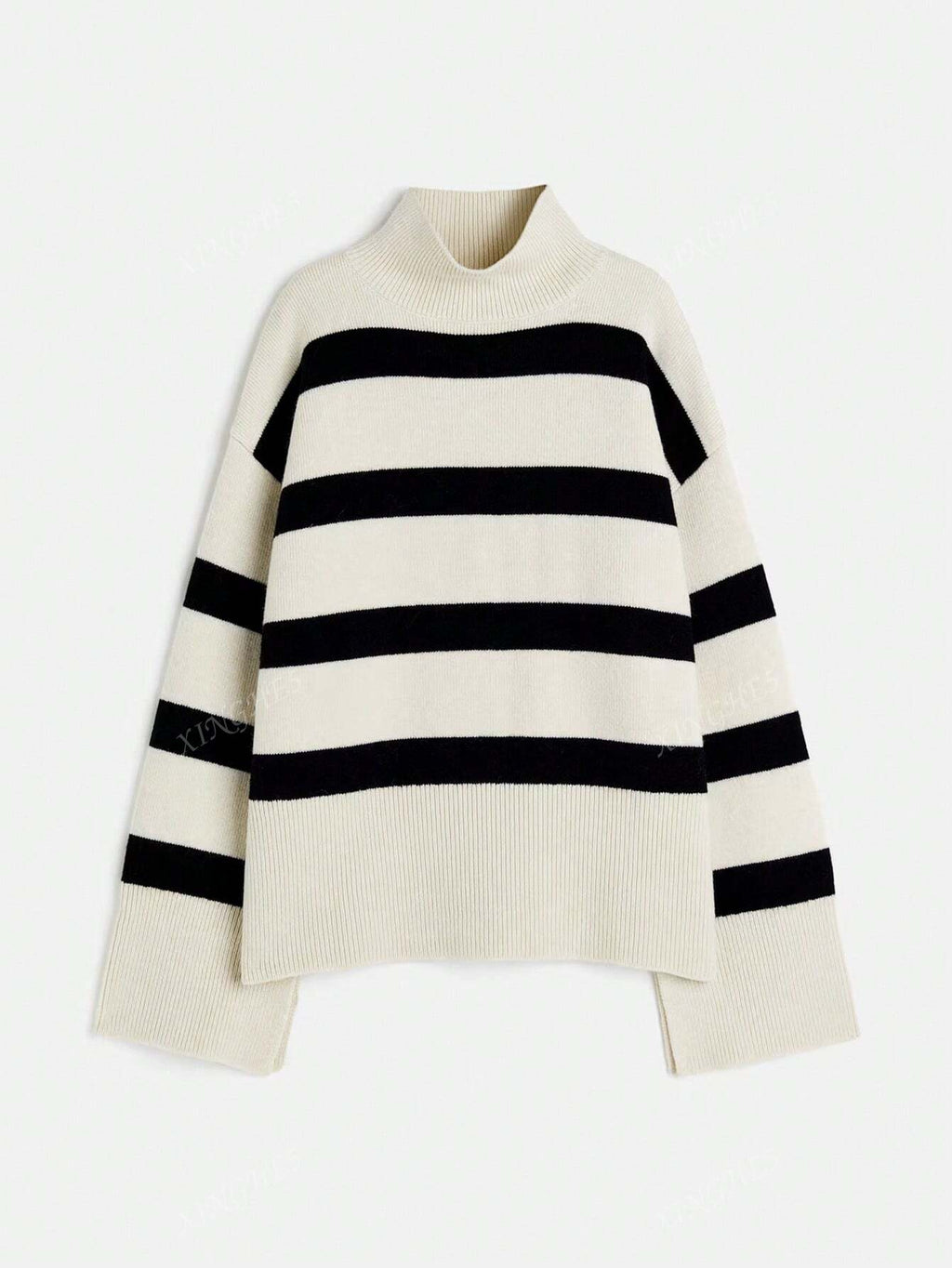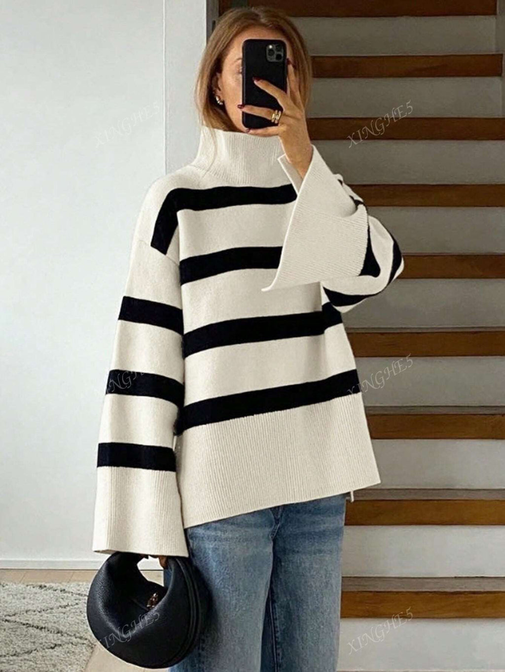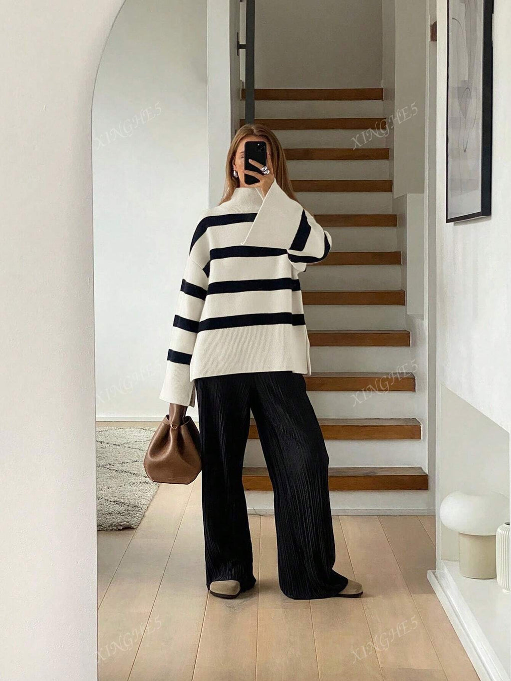 Classic Striped, Side Slit Design, Mock Neck Sweater, Fashionable And Elegant, Suitable For Dates, Travel, And Daily Commute In Autumn/Winter