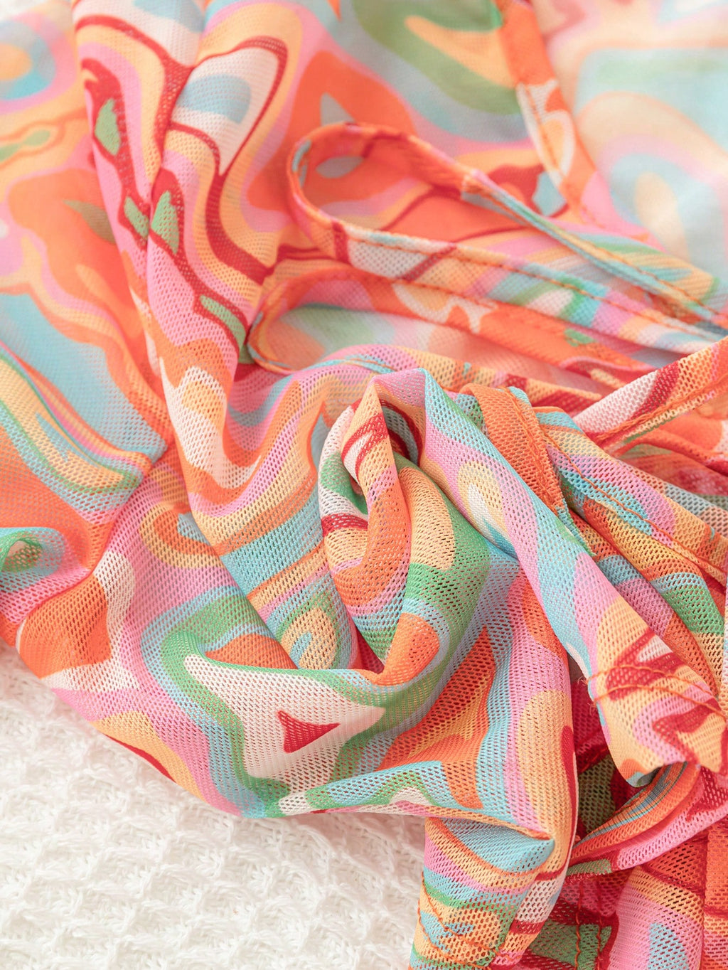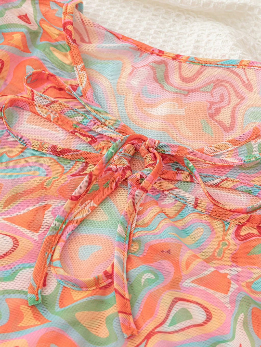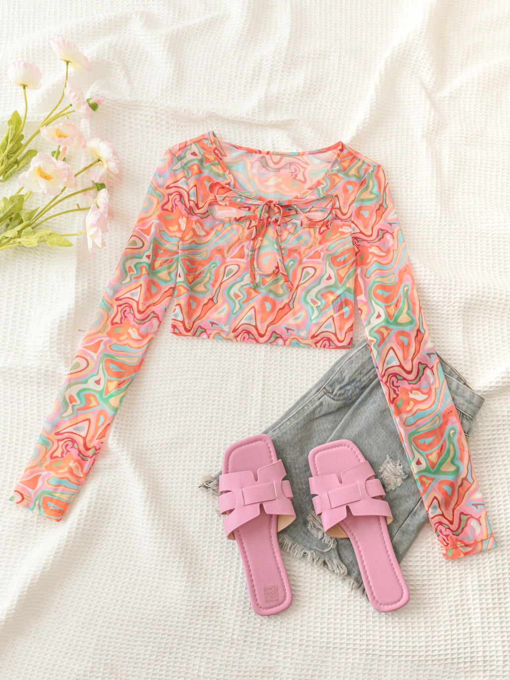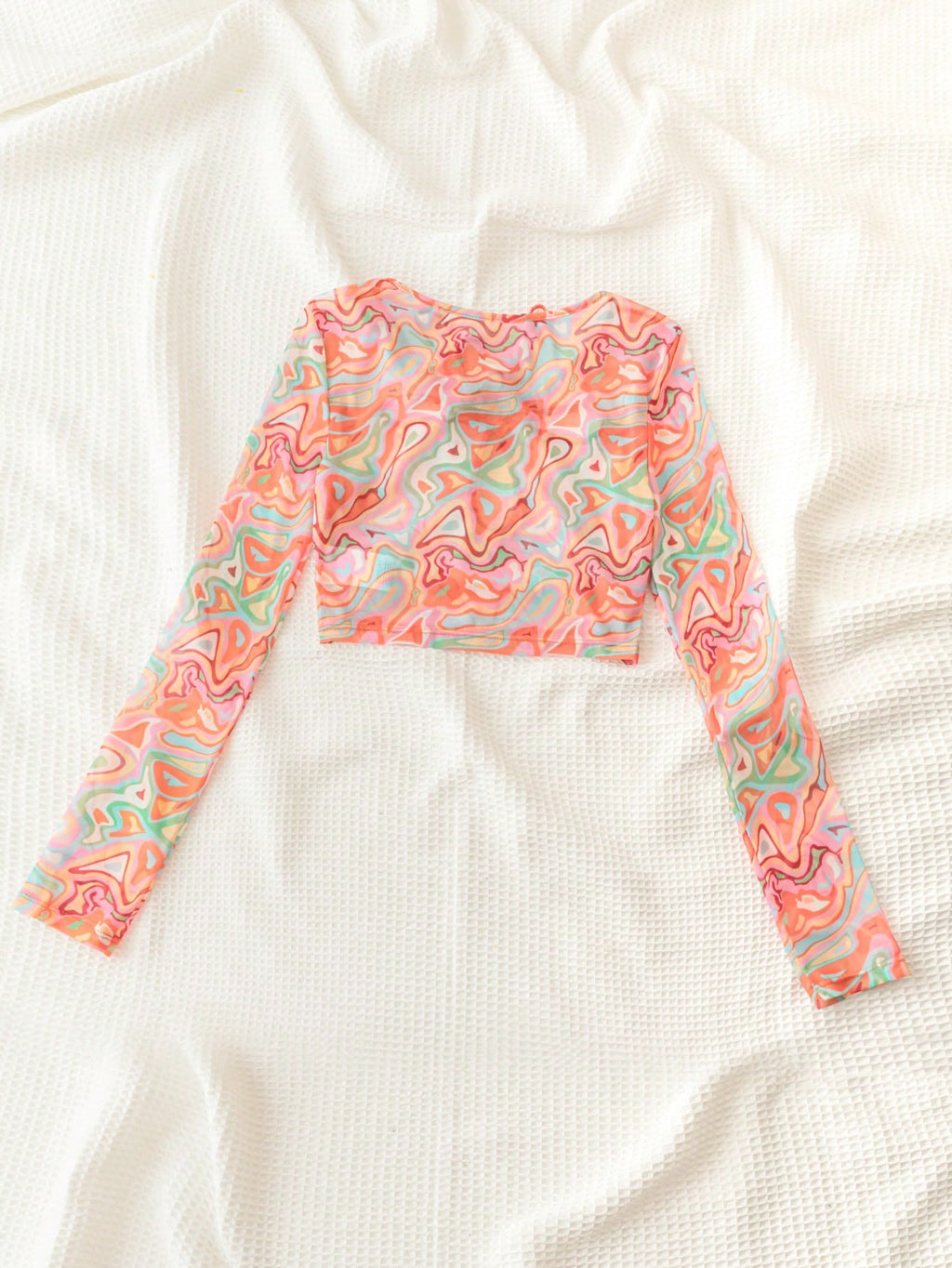 Dreamara Ženski prozirni osnovni top od mrežaste tkanine sa printom šarenih valova s kratkim rezom i dugim rukavima, idealan za odmor