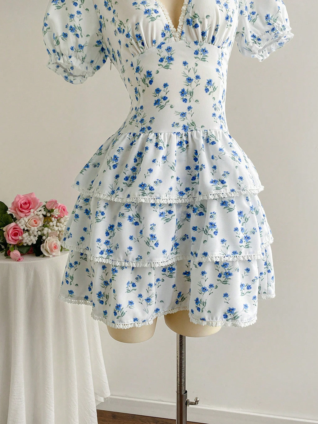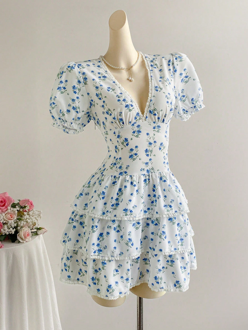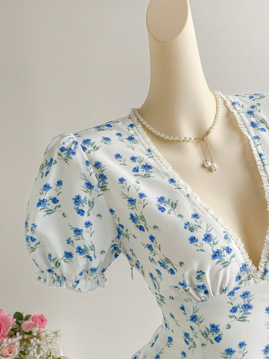 Elamini plava Ditsy cvjetna patchwork mini haljina s plisiranim V-izrezom