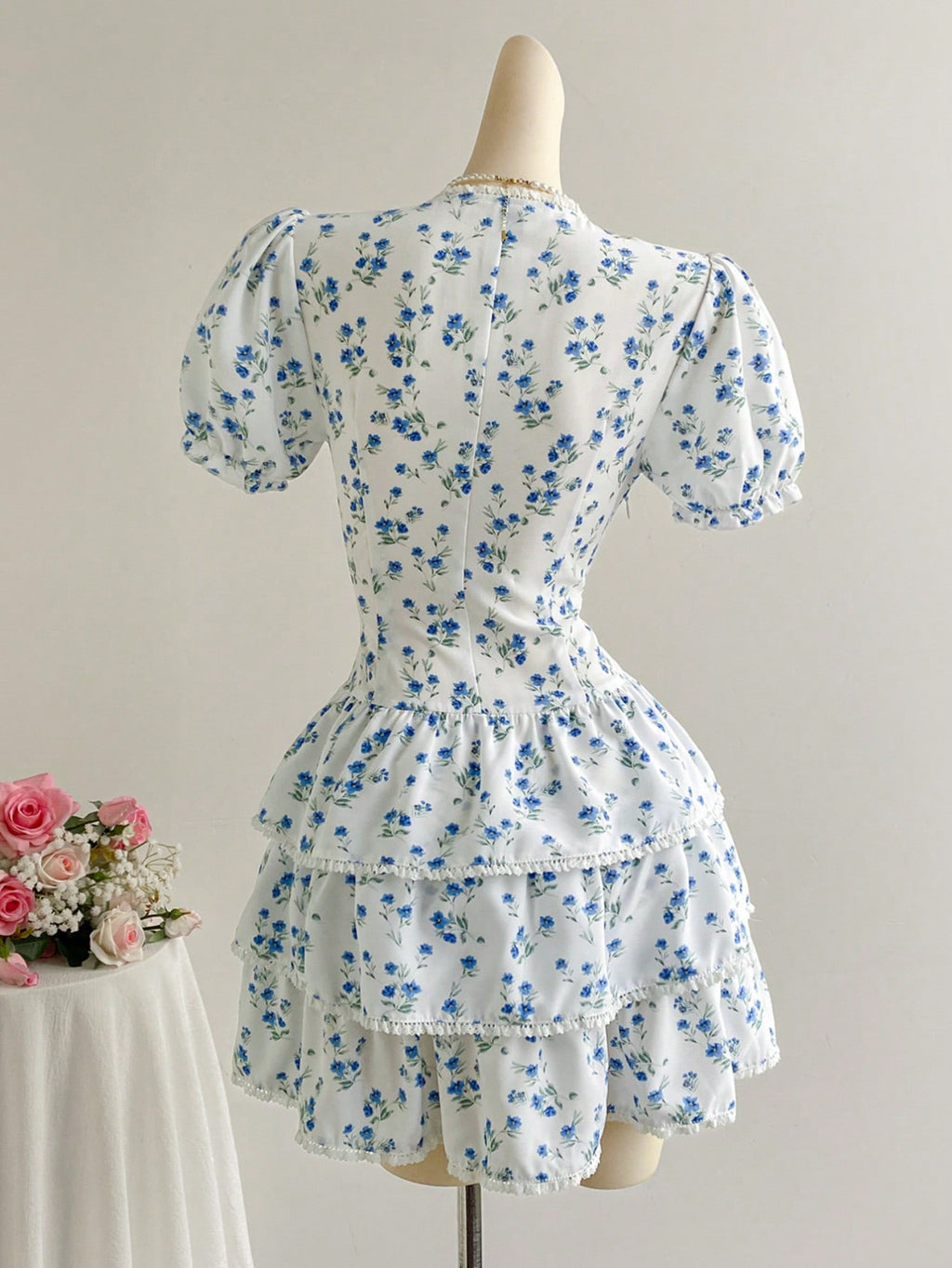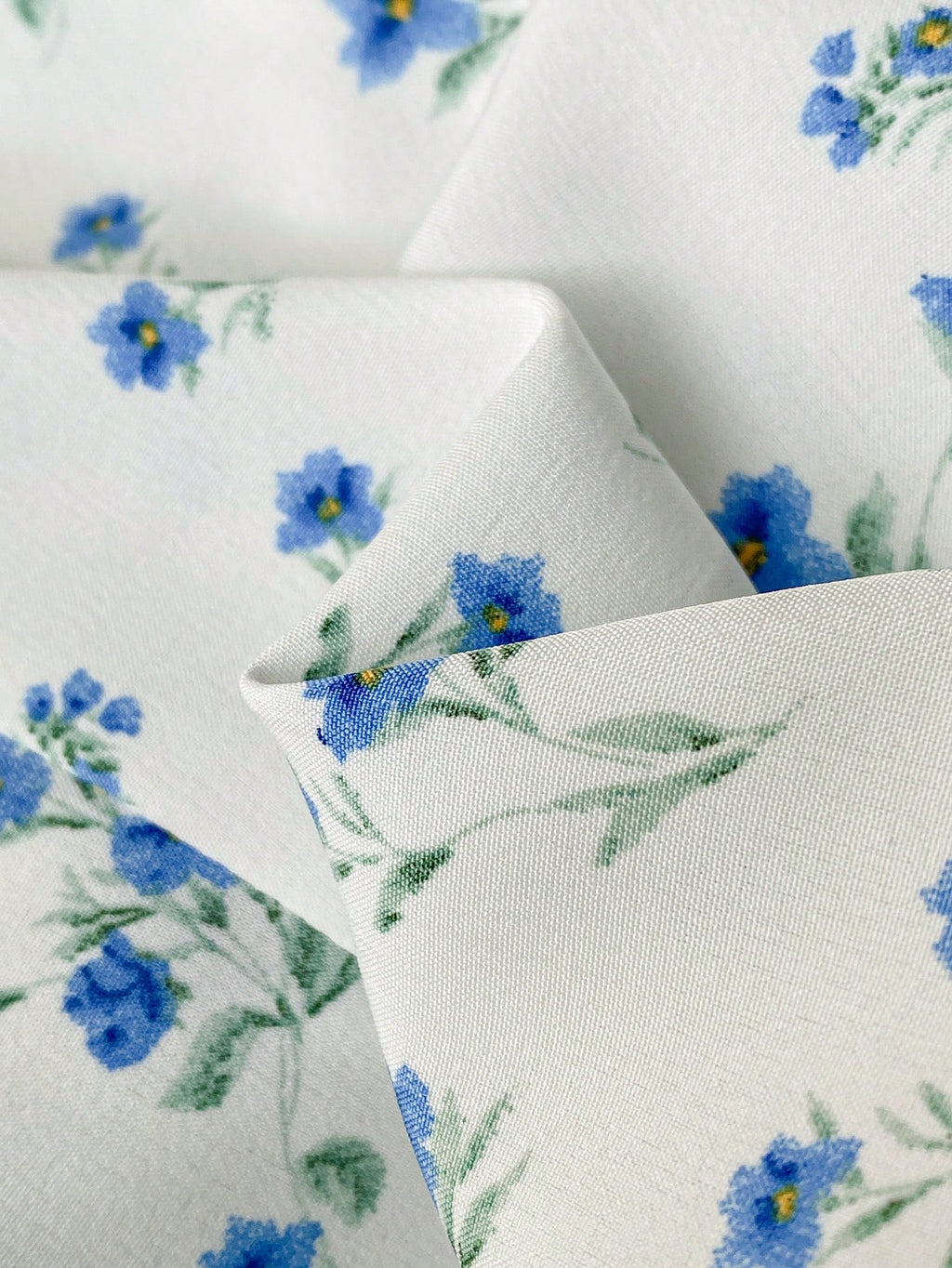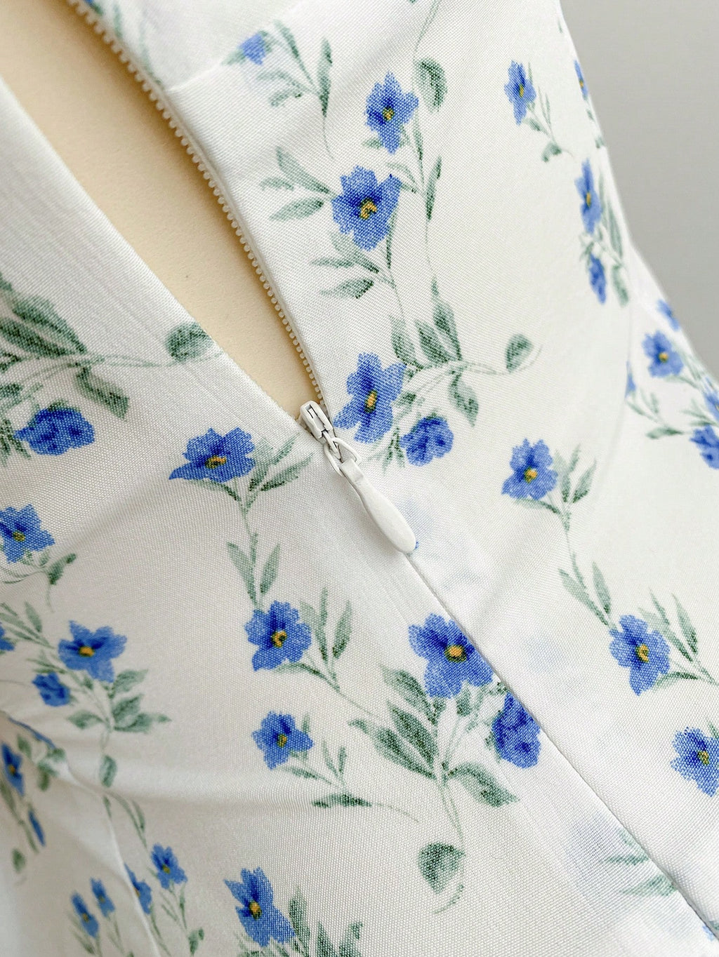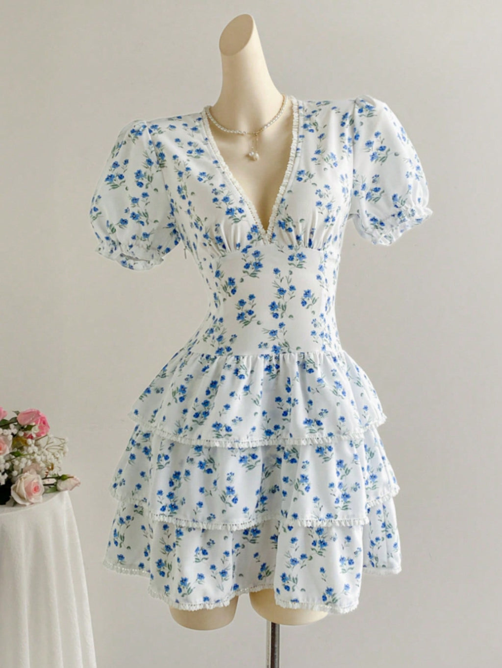 Elamini plava Ditsy cvjetna patchwork mini haljina s plisiranim V-izrezom