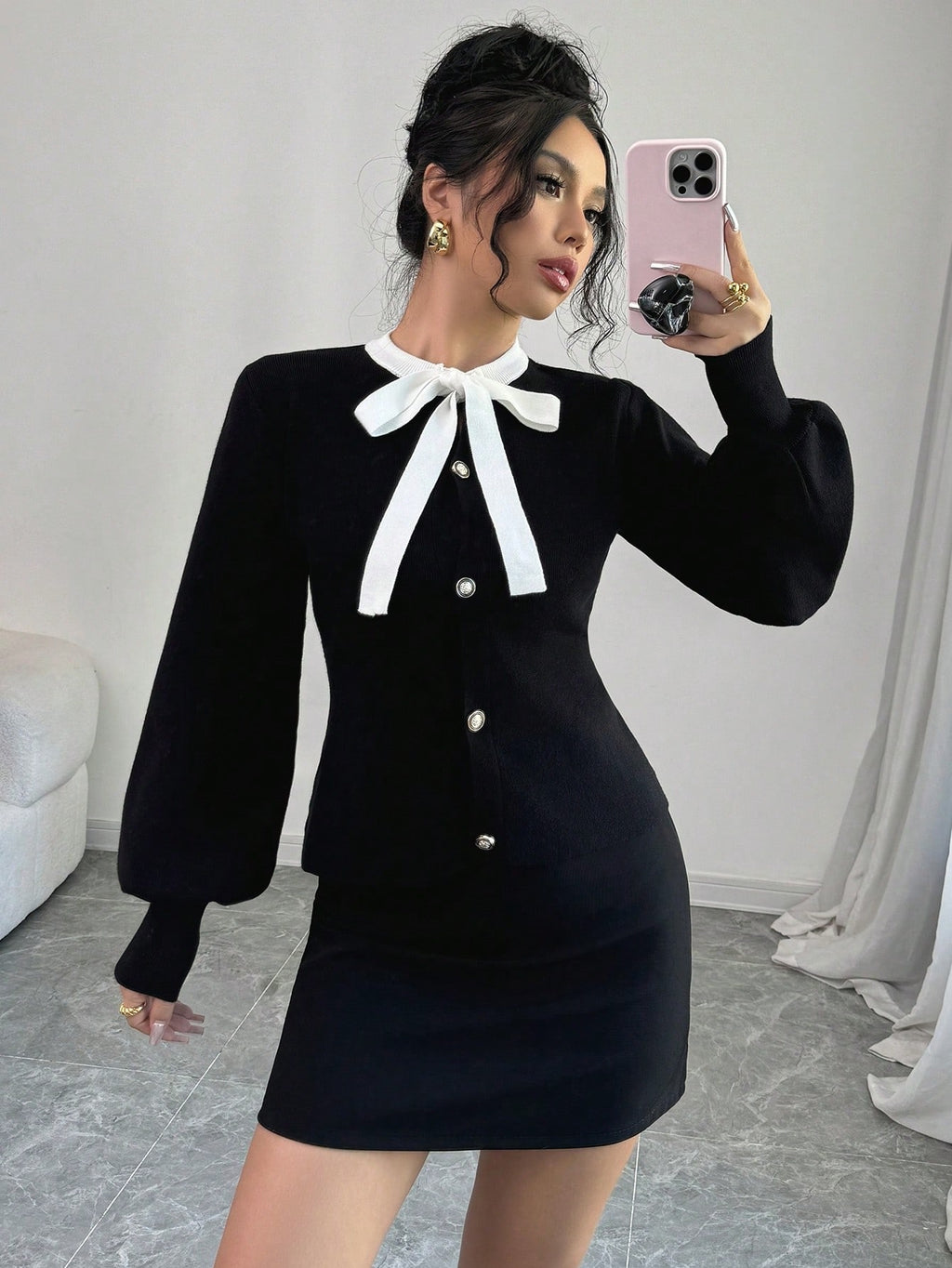EMI 1pc Elegant Front Button Colorblock Bowknot Cardigan