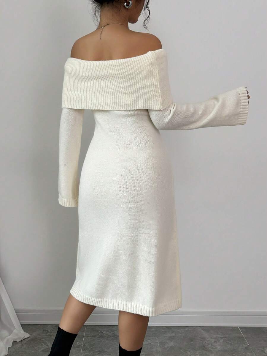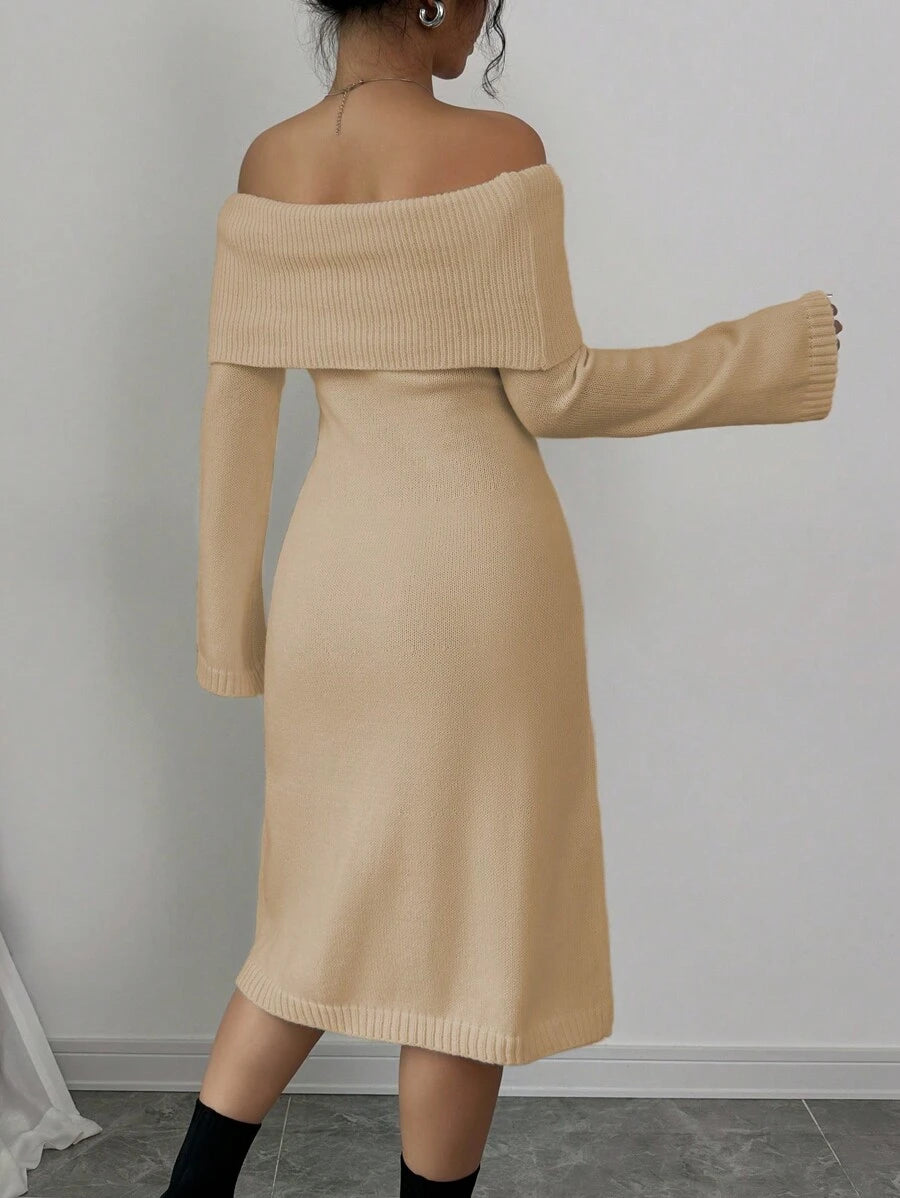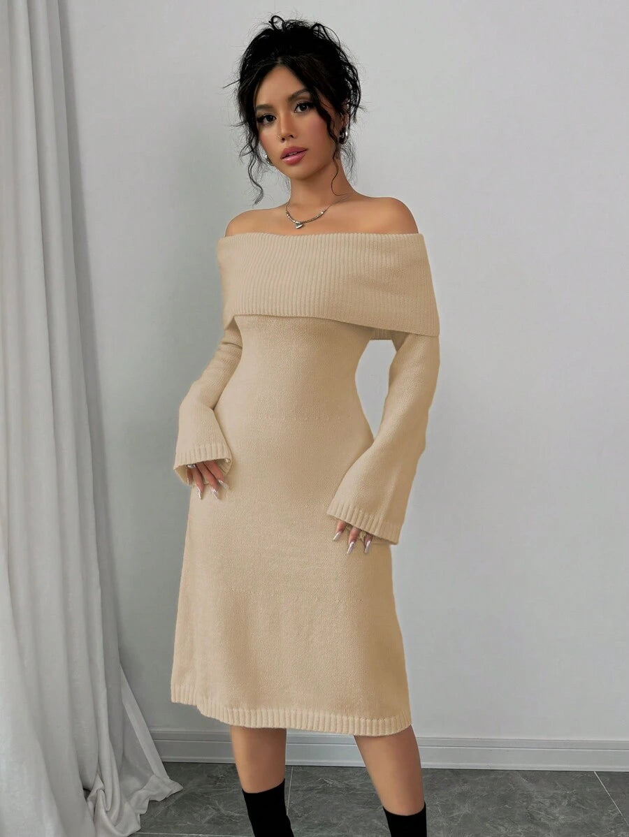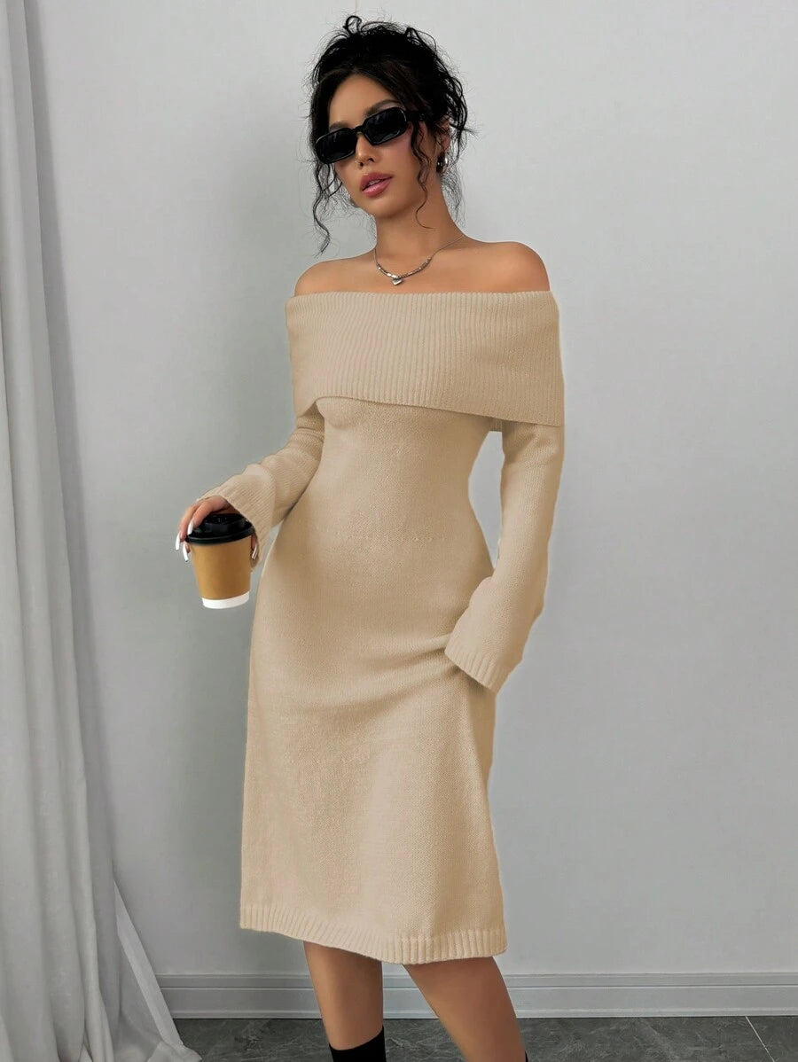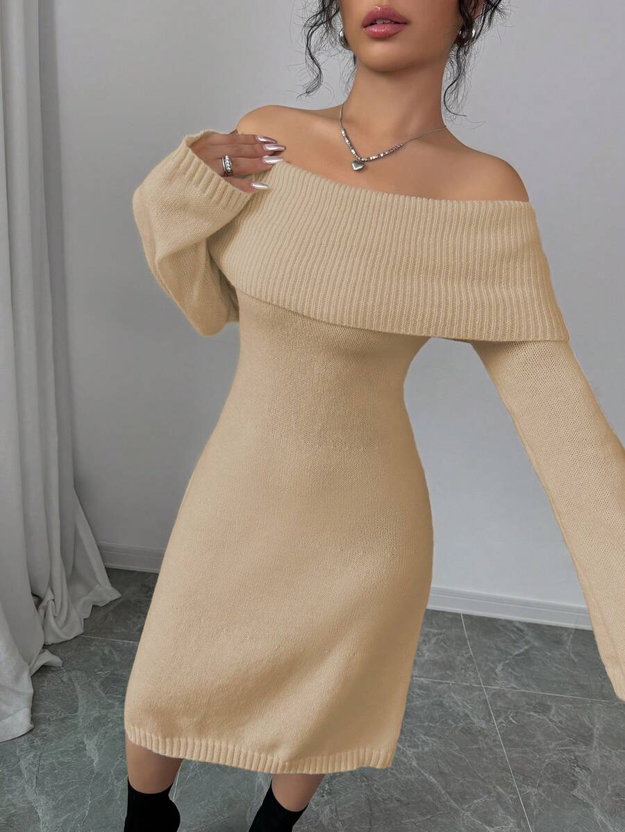 EMI 1pc Off Shoulder Long Sleeve Knitted Warm A-Line Hem Beige Sweater Dress For Women, Autumn/Winter