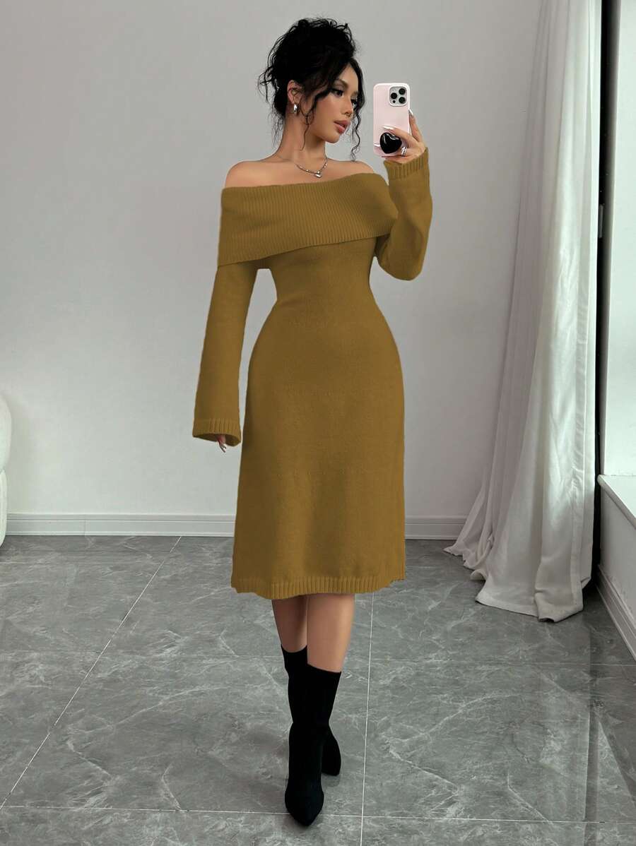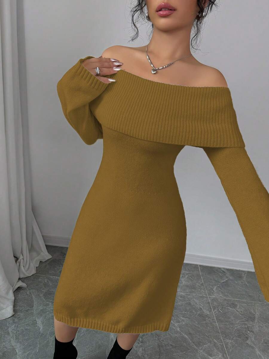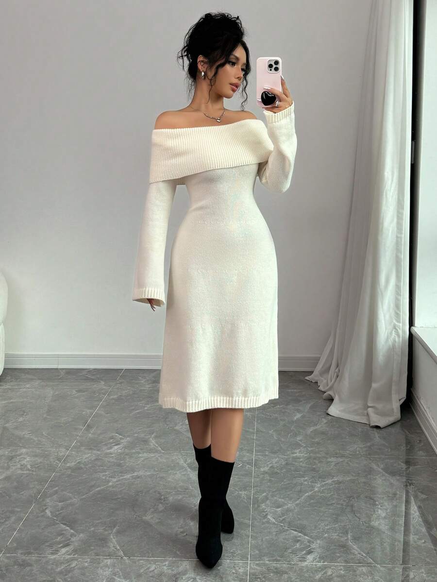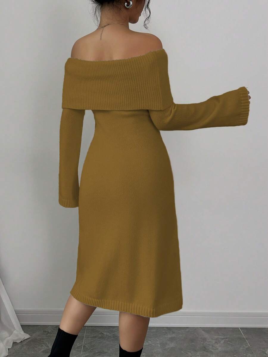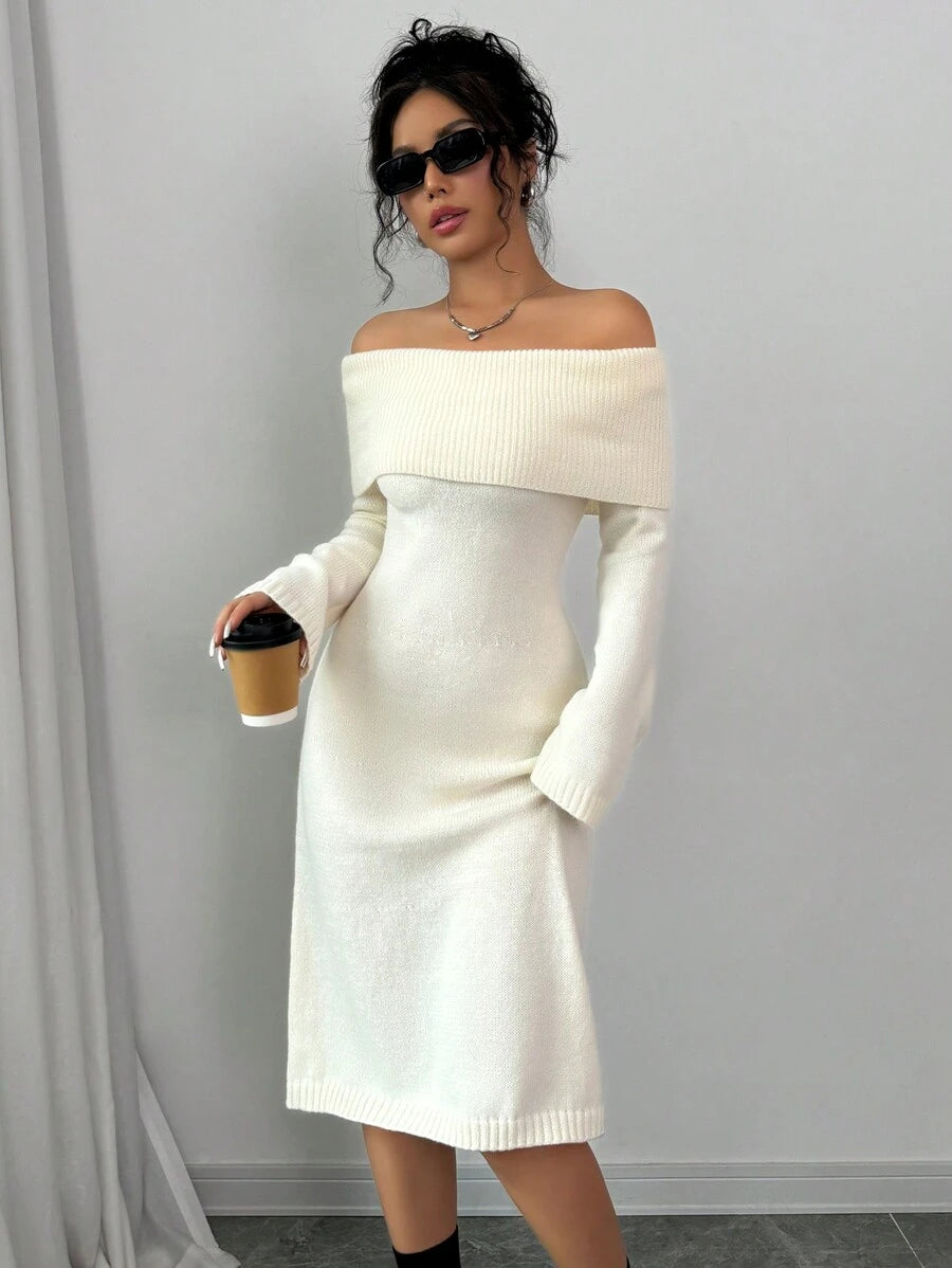 EMI 1pc Off Shoulder Long Sleeve Knitted Warm A-Line Hem Beige Sweater Dress For Women, Autumn/Winter