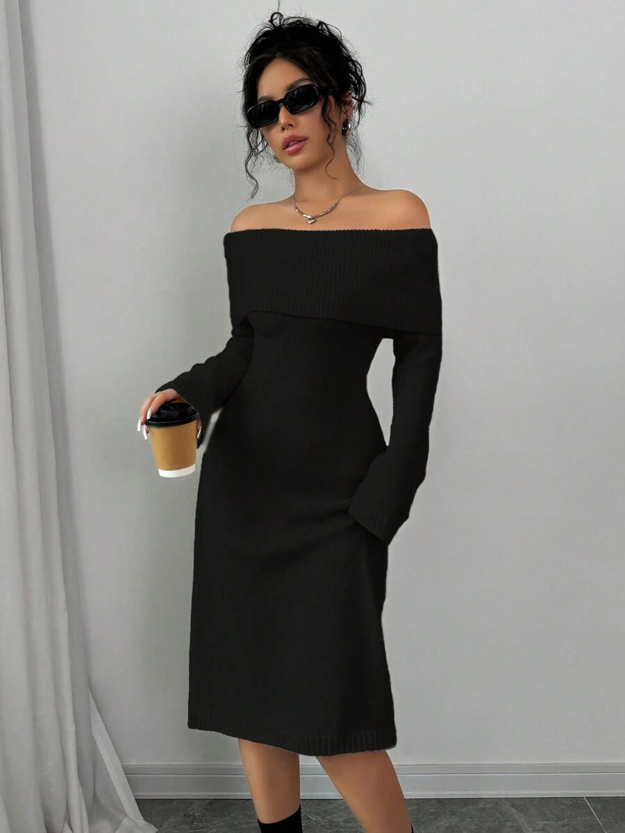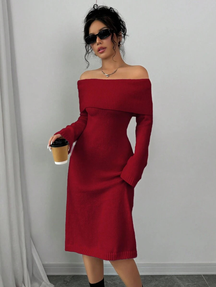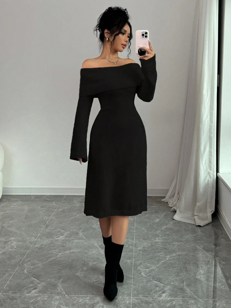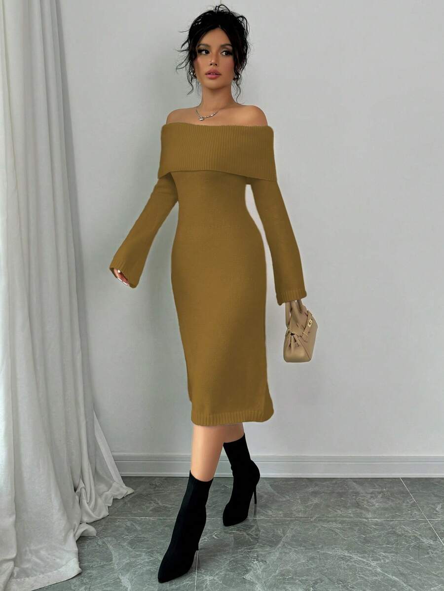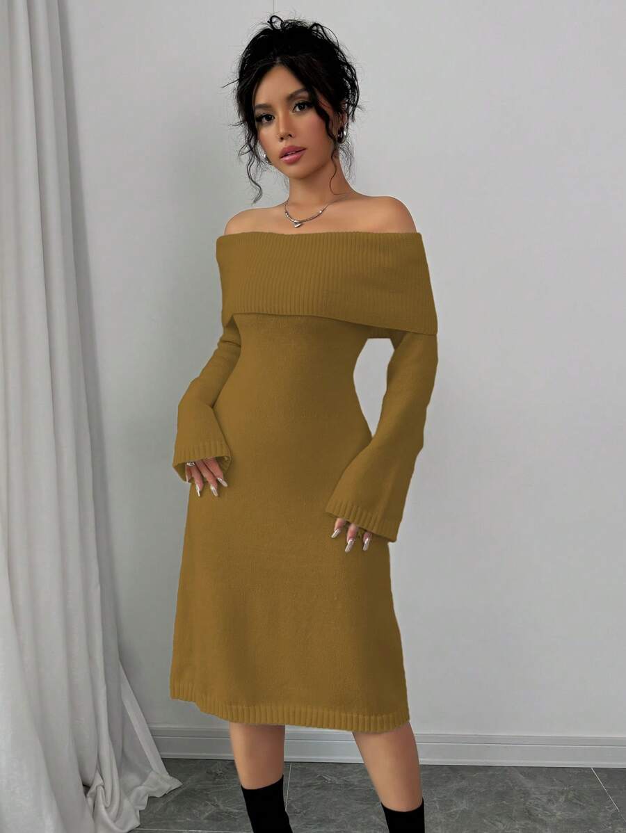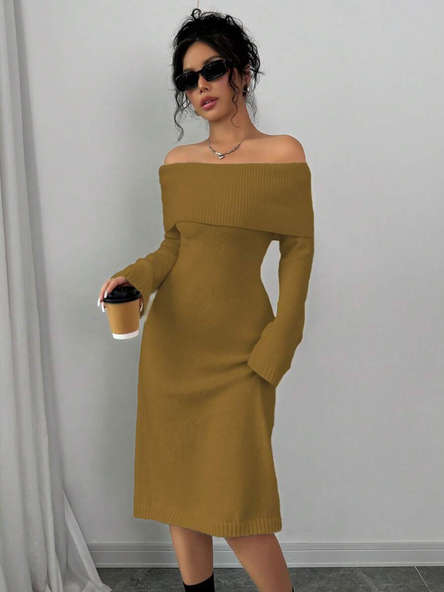 EMI 1pc Off Shoulder Long Sleeve Knitted Warm A-Line Hem Beige Sweater Dress For Women, Autumn/Winter