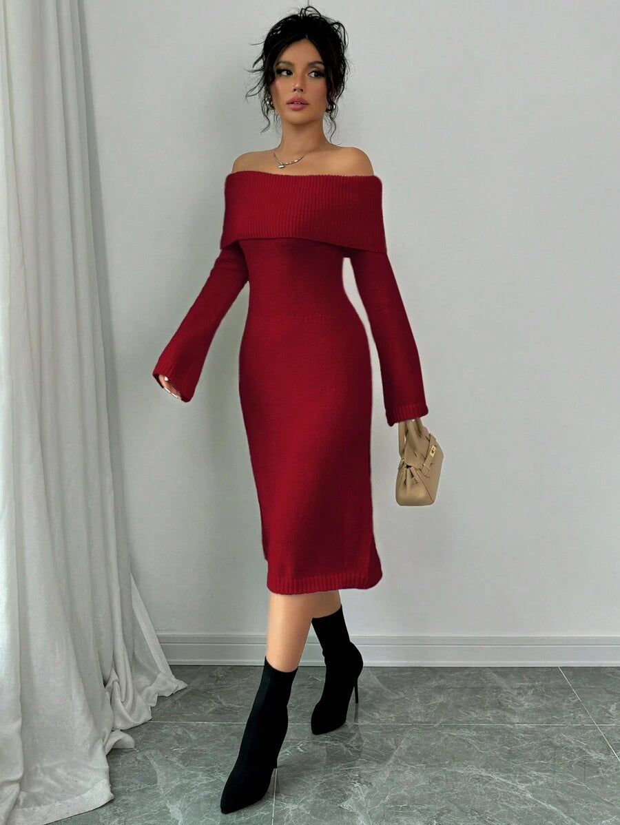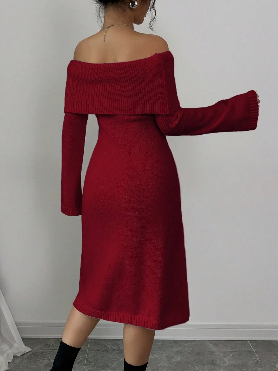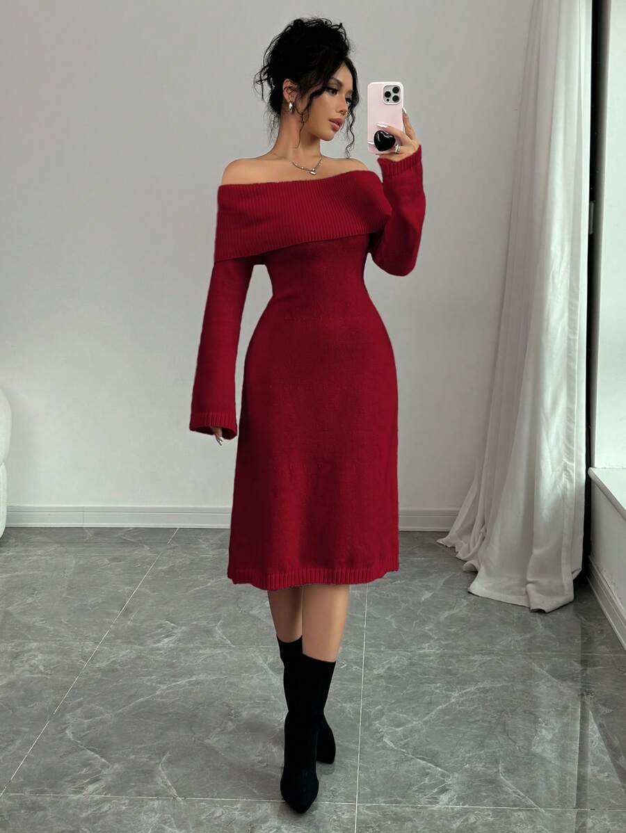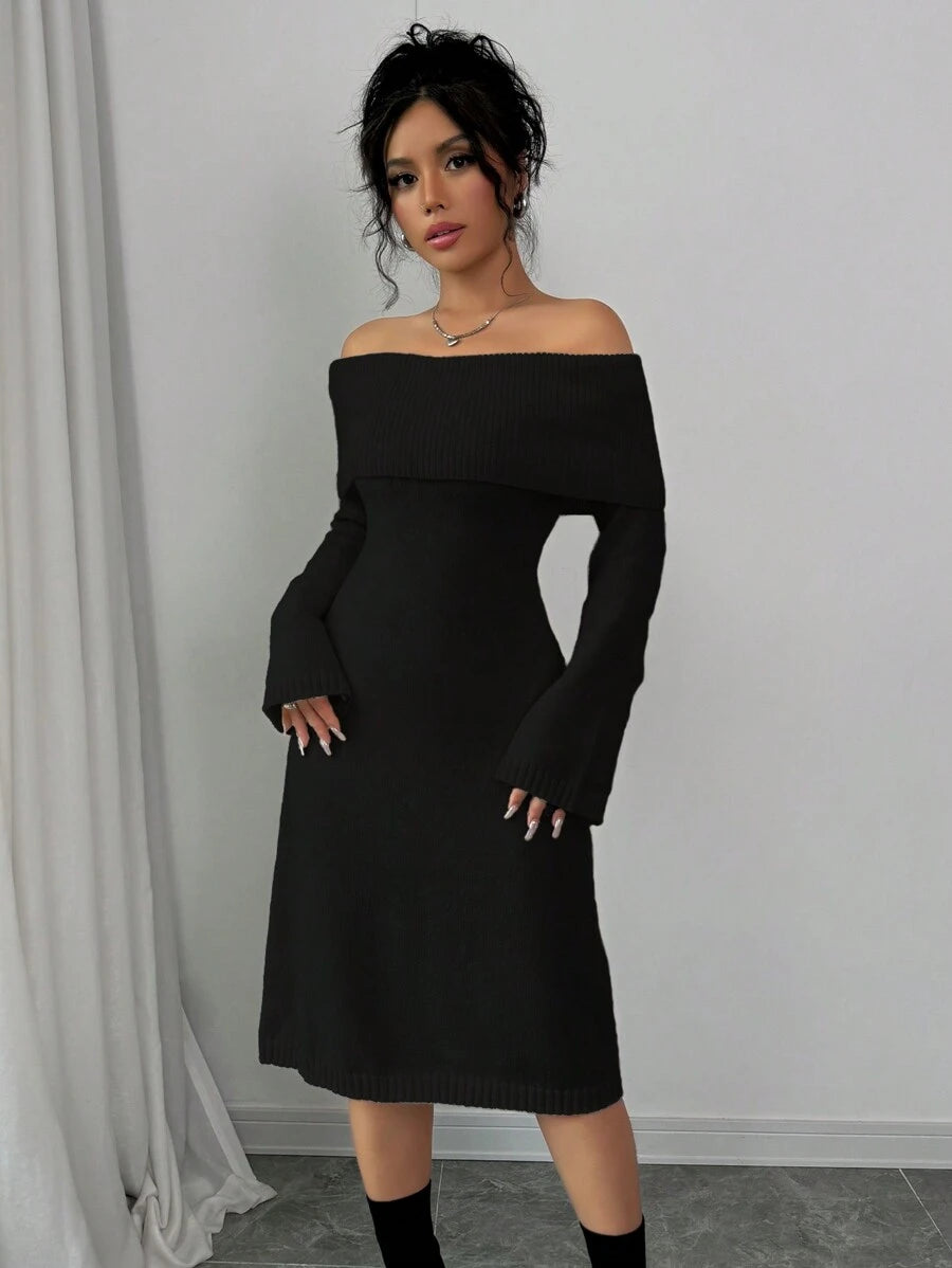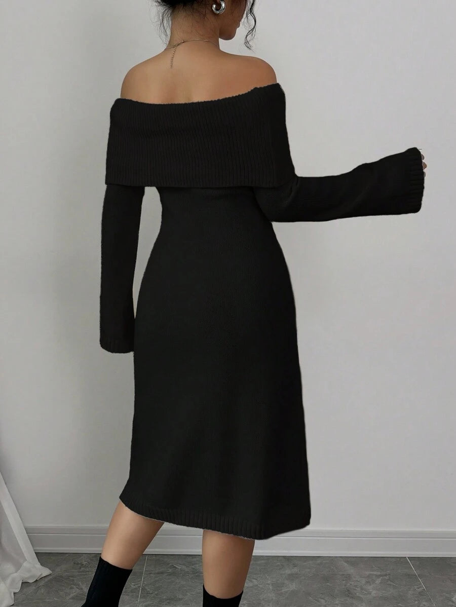 EMI 1pc Off Shoulder Long Sleeve Knitted Warm A-Line Hem Beige Sweater Dress For Women, Autumn/Winter