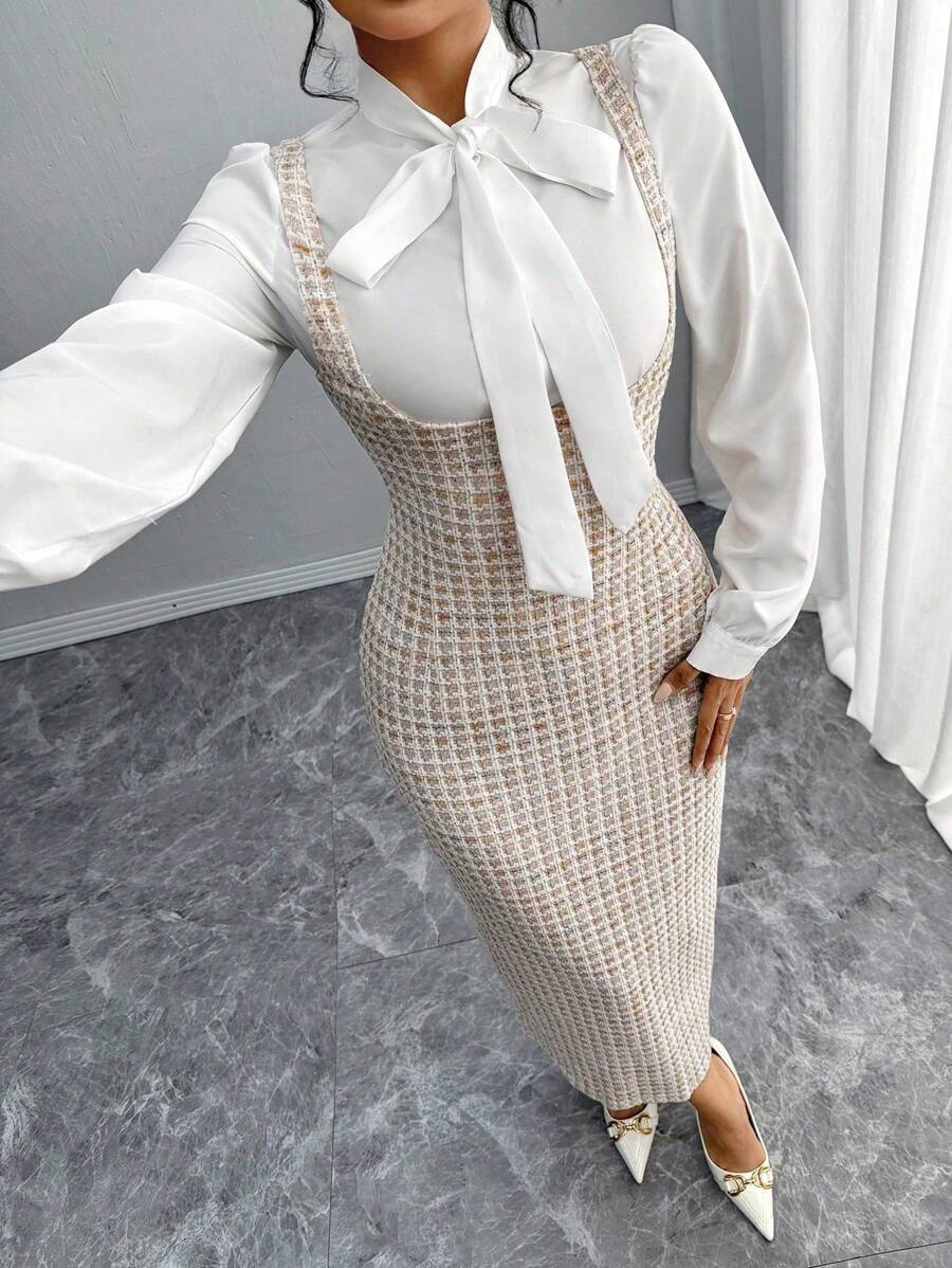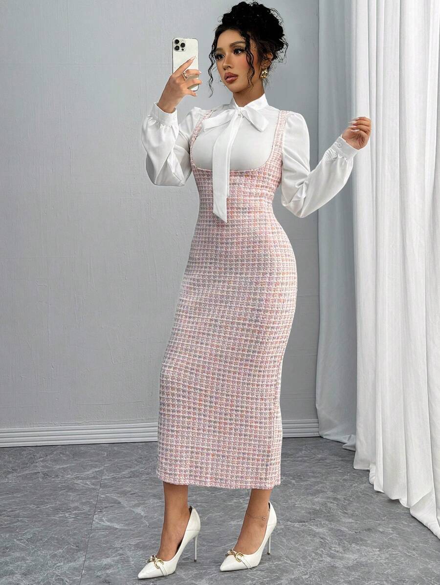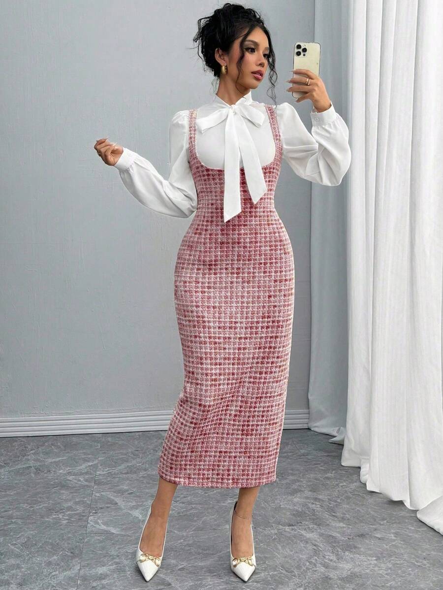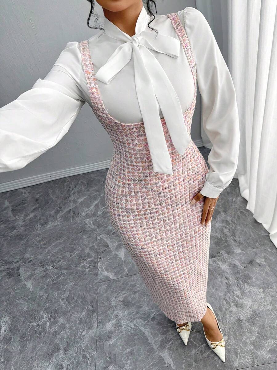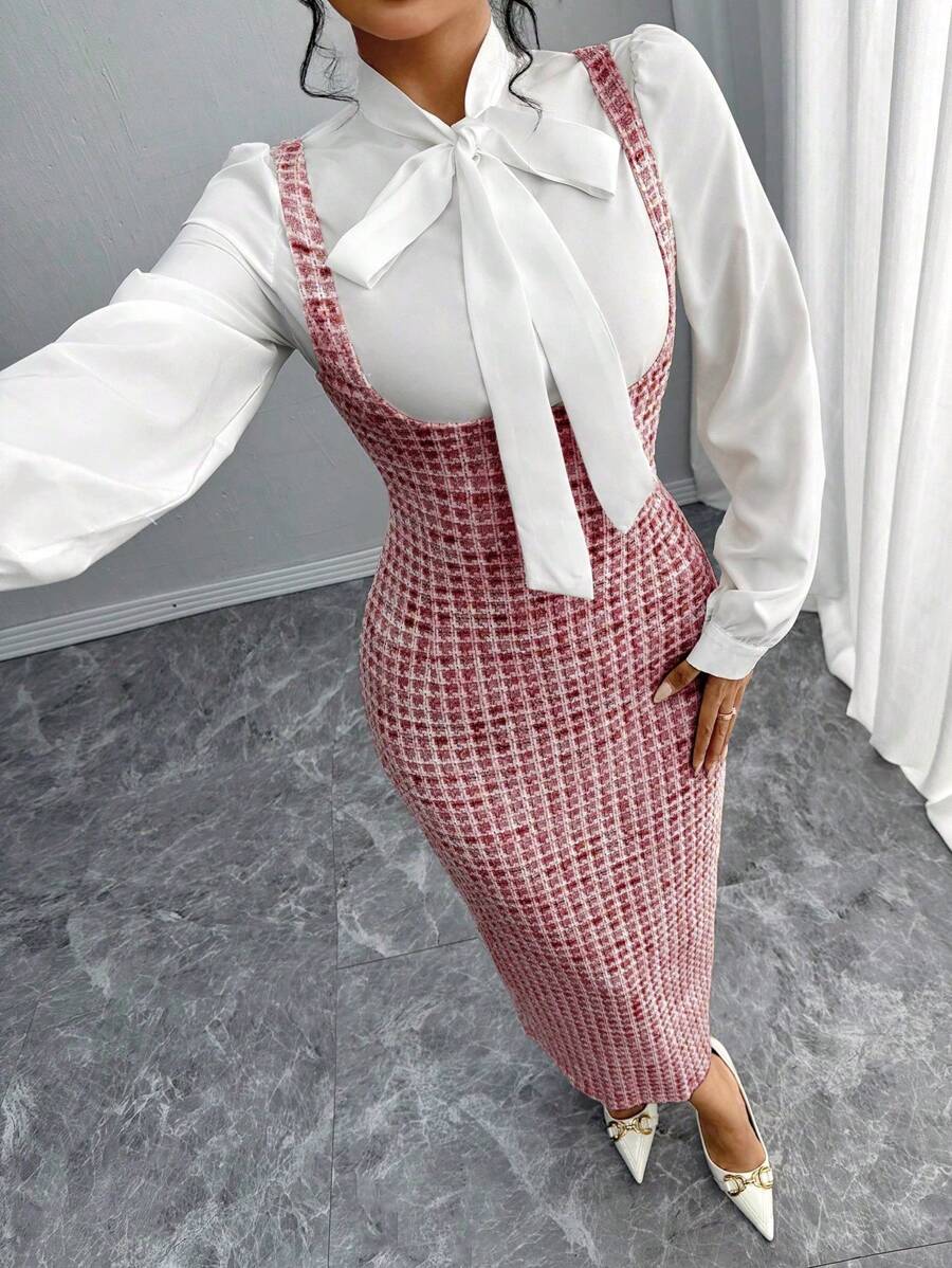 EMI 2pcs Elegant French Style White Collar Tie Blouse And Pink Jacquard Long Bib Dress Suit, Autumn/Winter Women Fall Cloth For Women