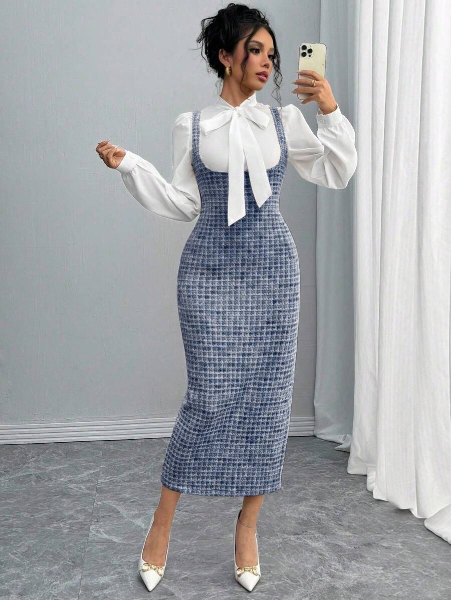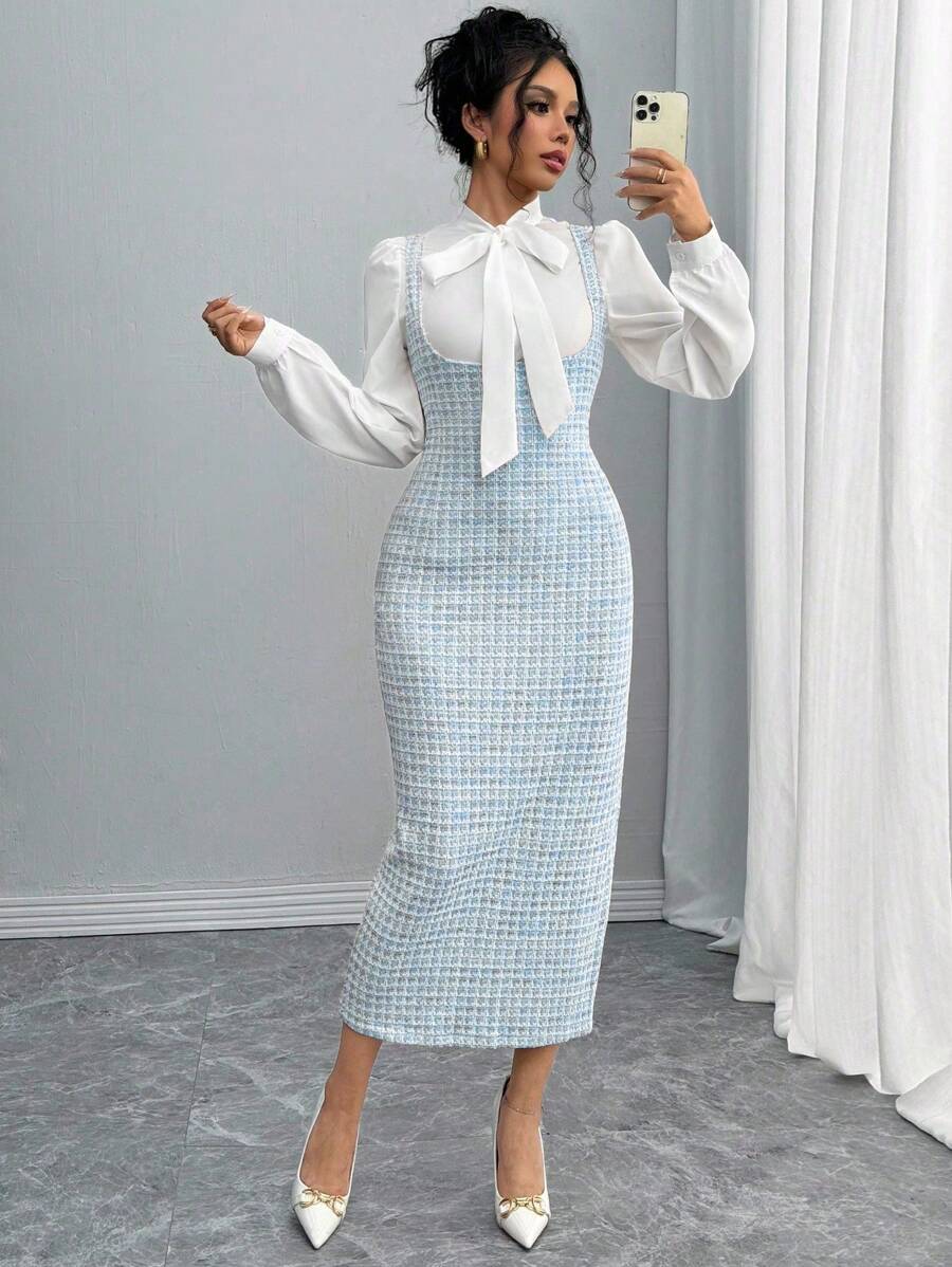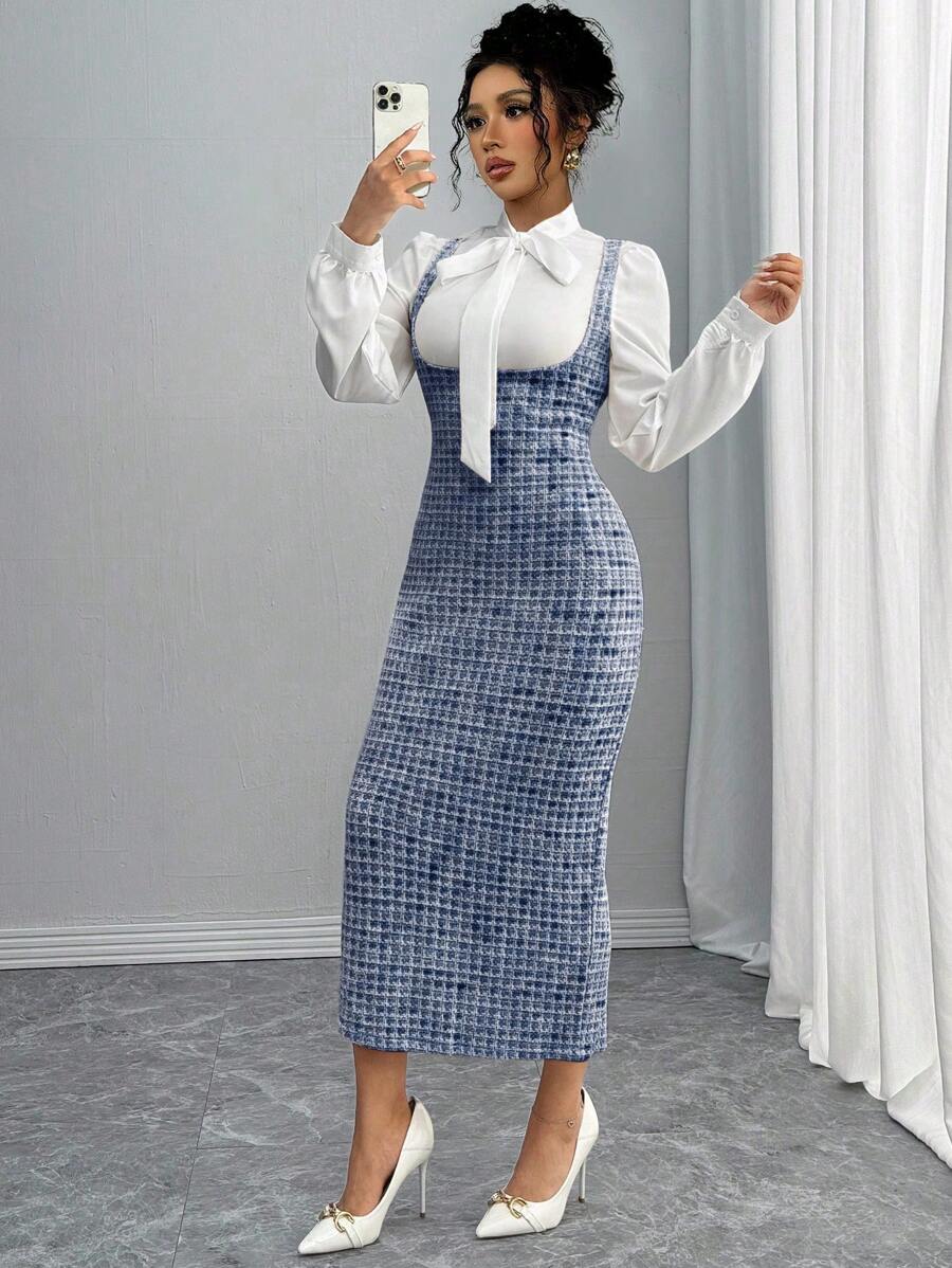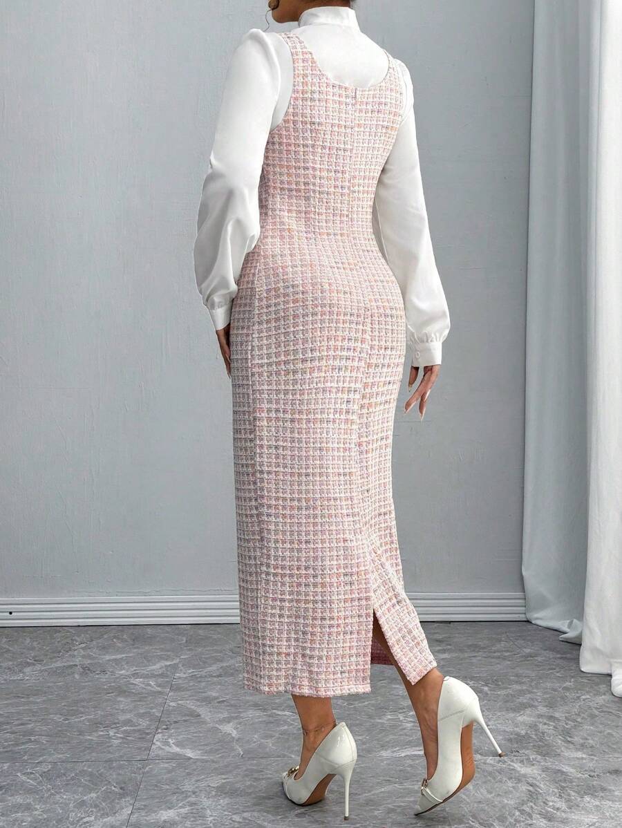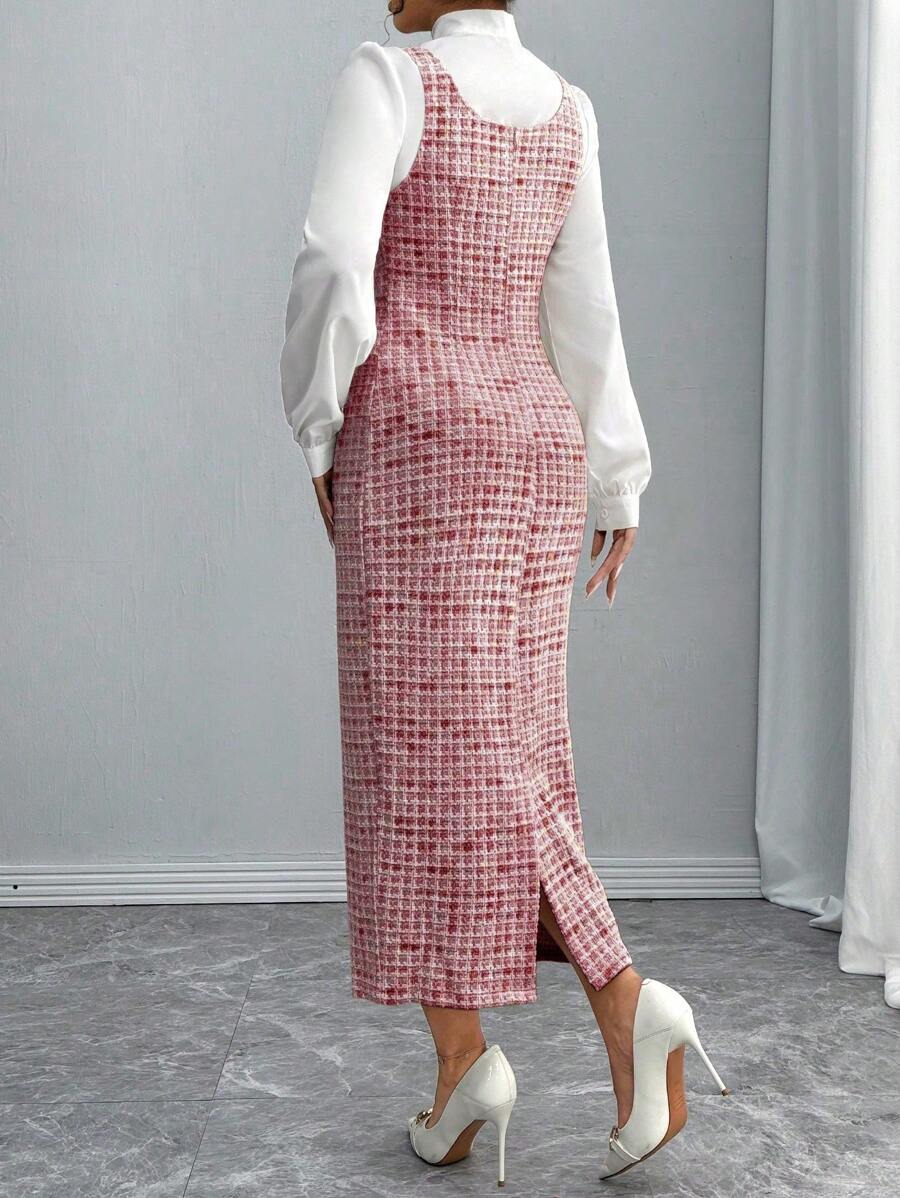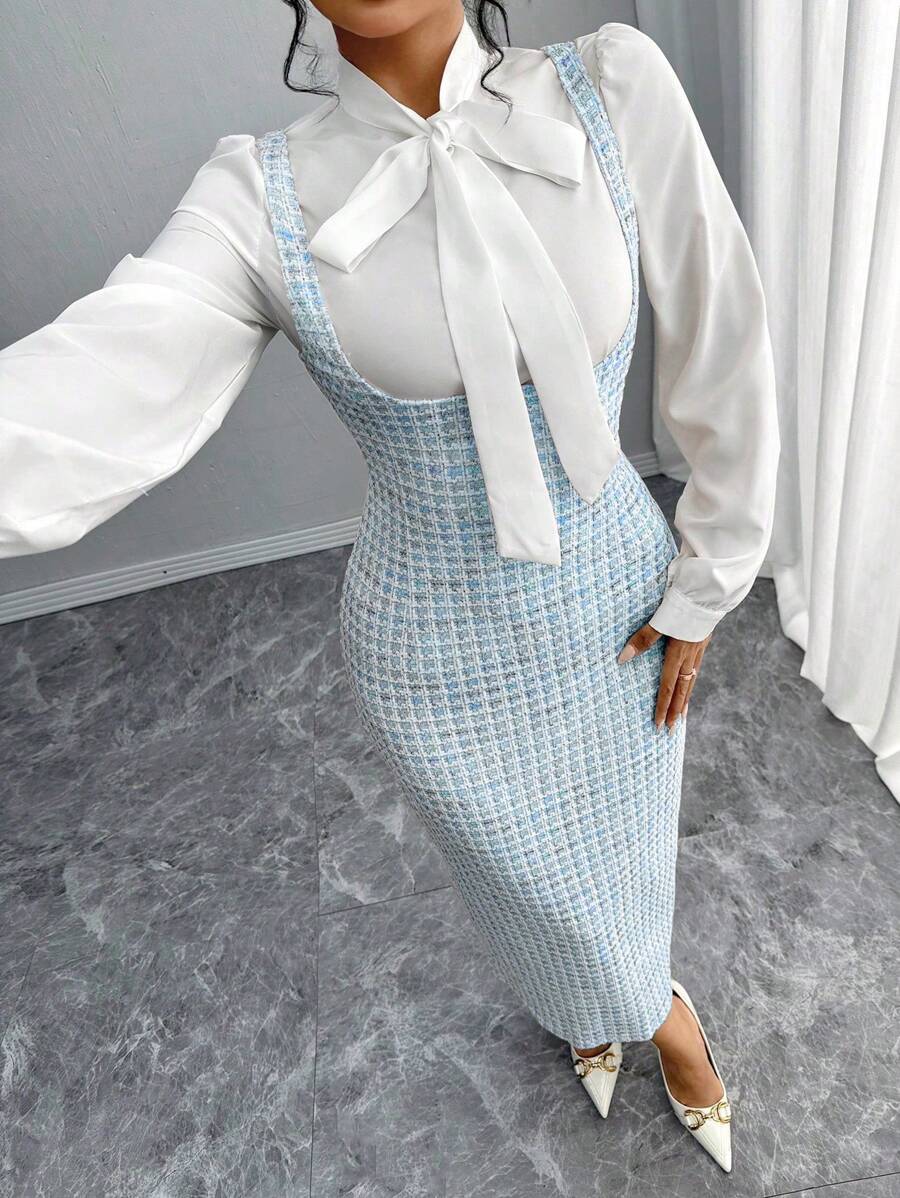 EMI 2pcs Elegant French Style White Collar Tie Blouse And Pink Jacquard Long Bib Dress Suit, Autumn/Winter Women Fall Cloth For Women