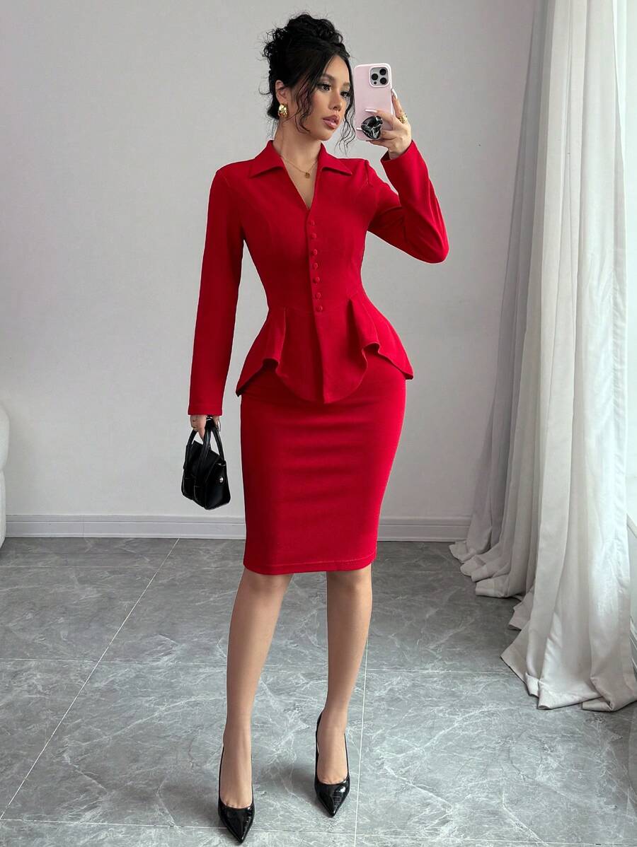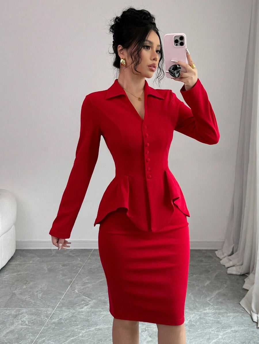 EMI 2pcs/Set Women Waist Cinching V-Neck Top And Bodycon Skirt Suit, Autumn/Winter Fall Cloth For Women
