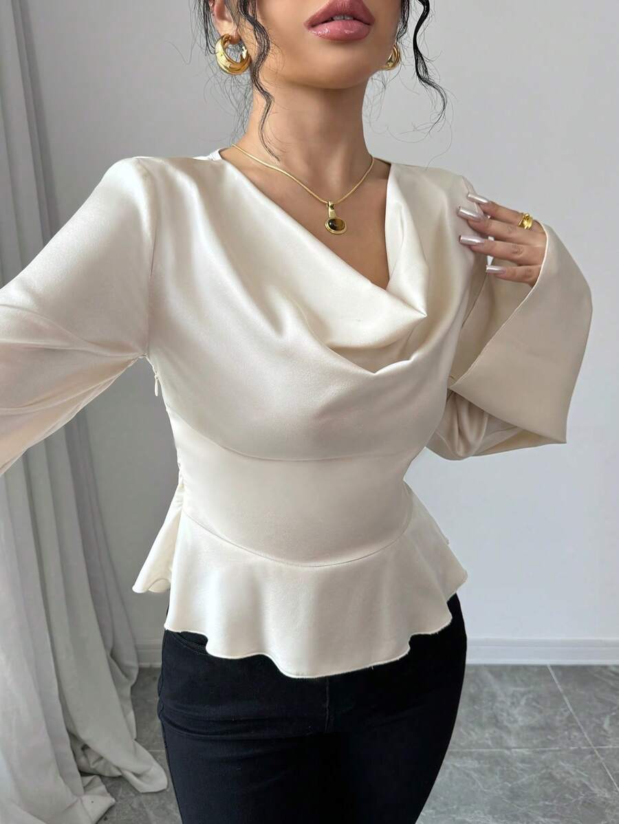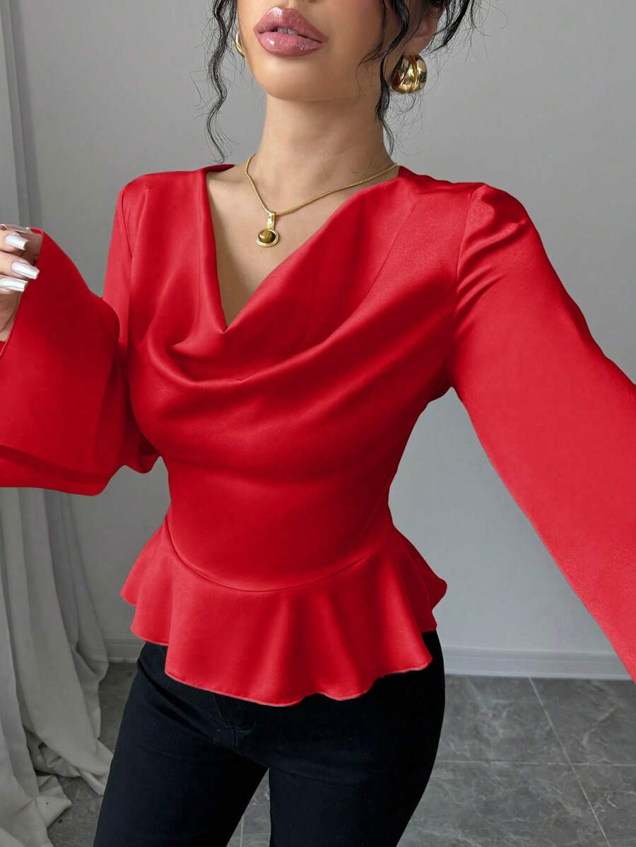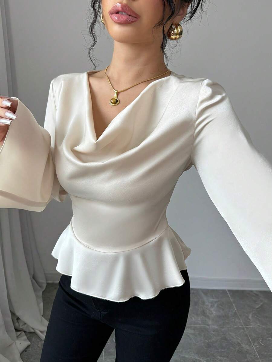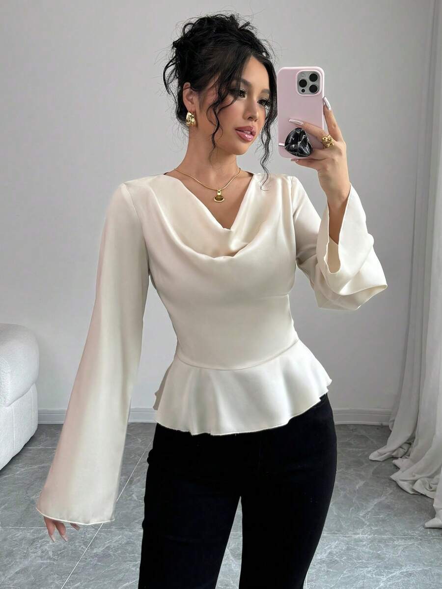 EMI Autumn/Winter Flounced Collar Cinched Waist A-Line Flared Long Sleeve Blouse