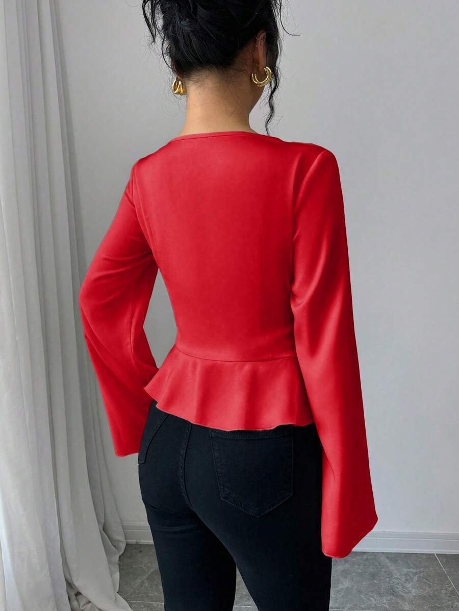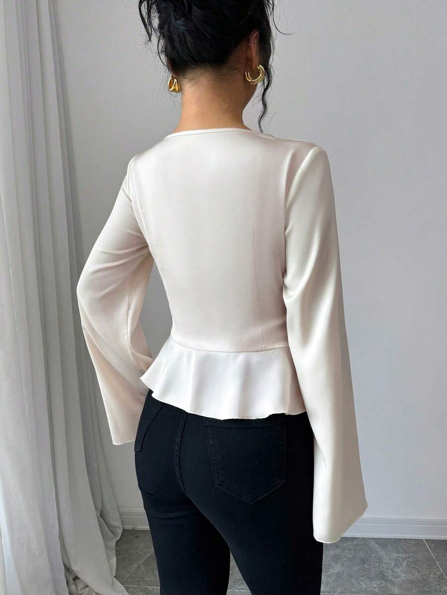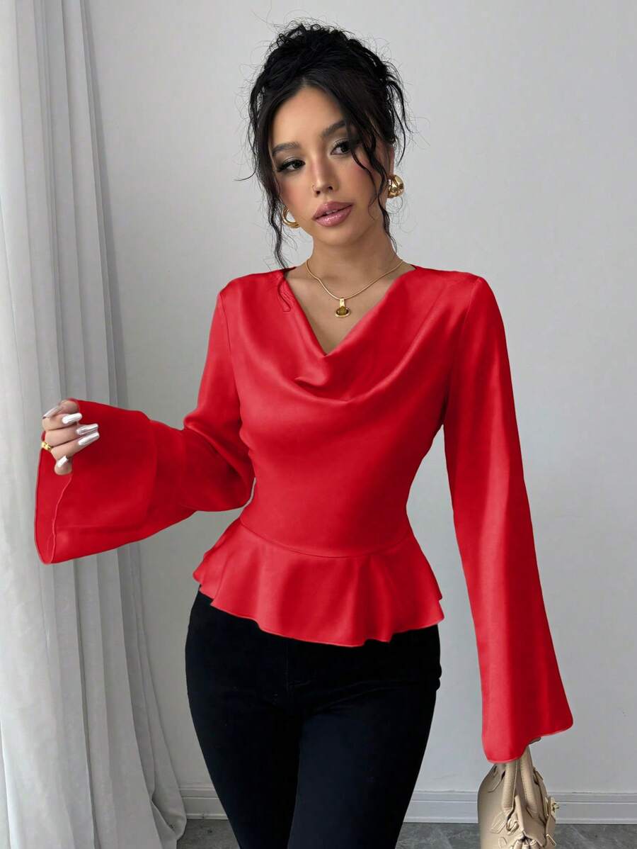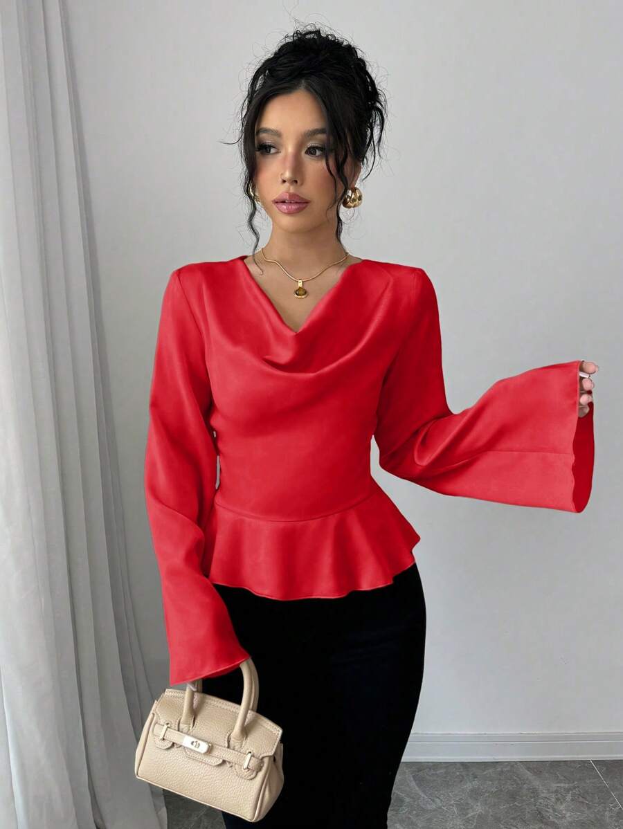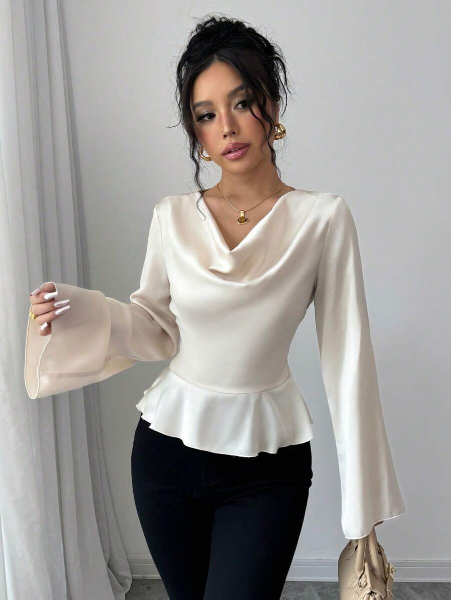 EMI Autumn/Winter Flounced Collar Cinched Waist A-Line Flared Long Sleeve Blouse