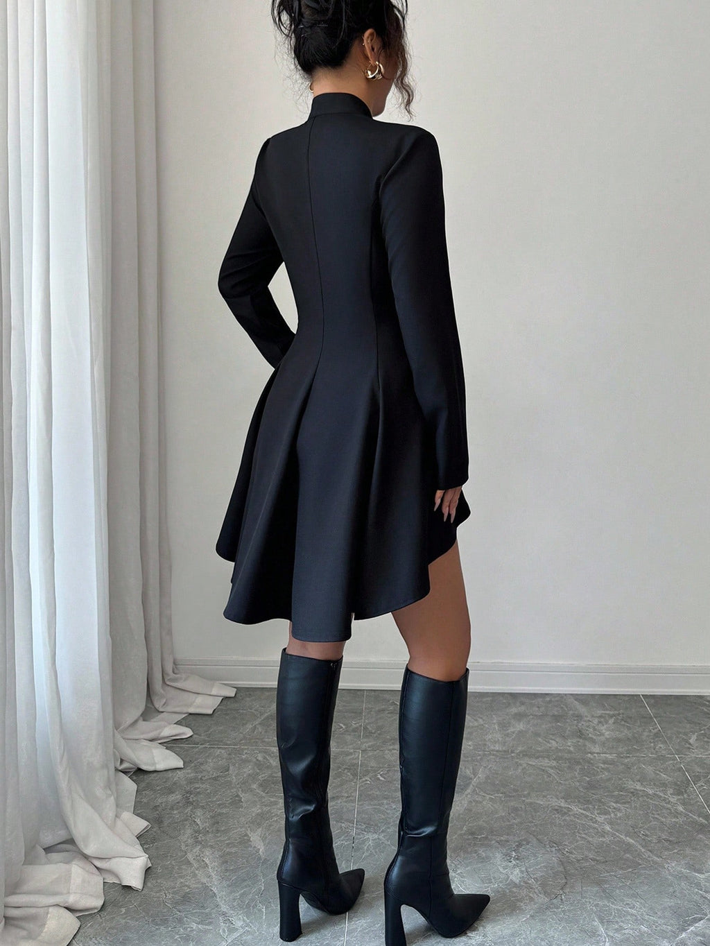 EMI Elegant Commuter Fashion Versatile Solid Black V-Neck Raglan Long Sleeve, Waist Cinched Asymmetric Hem Peplum Women Regular Jacket