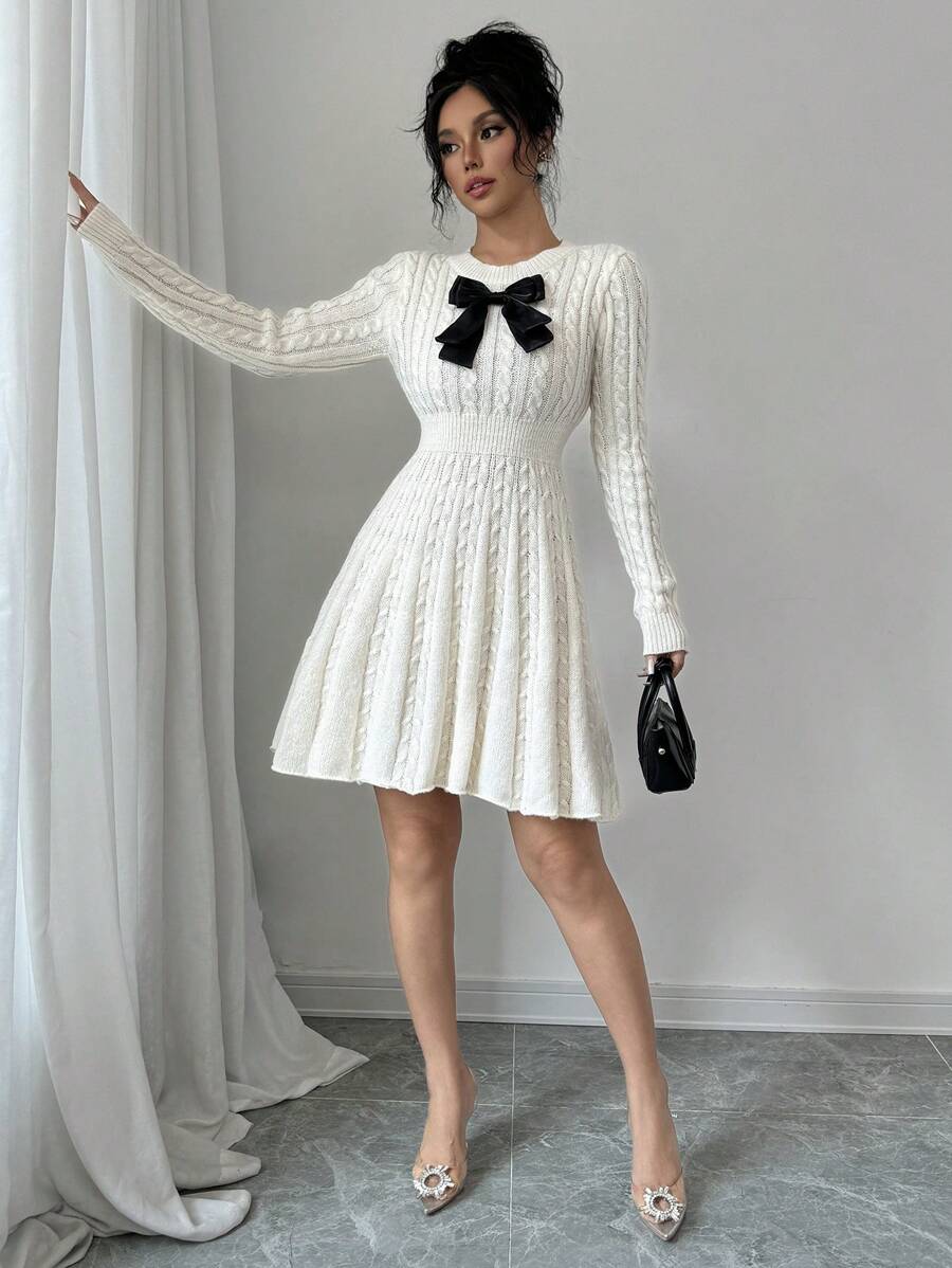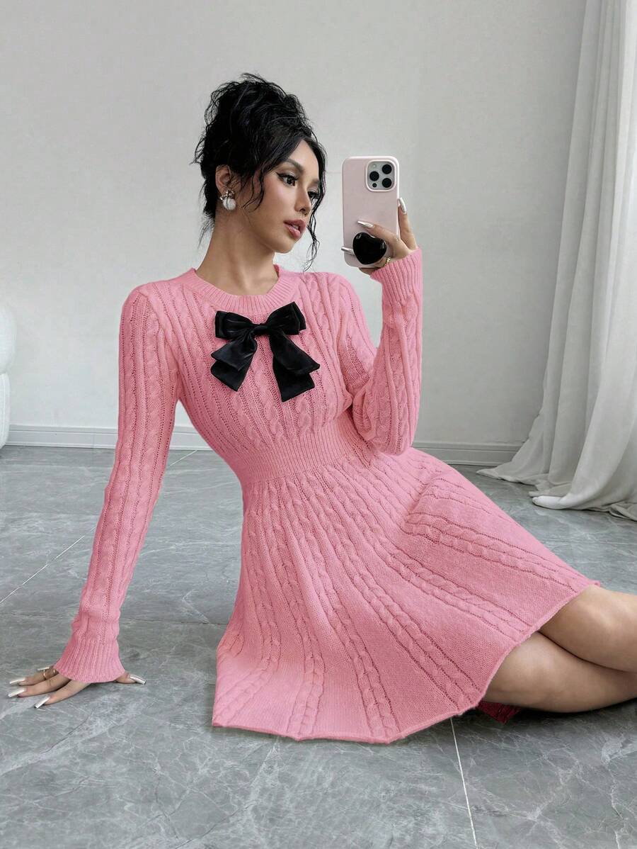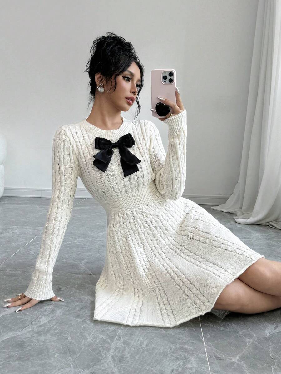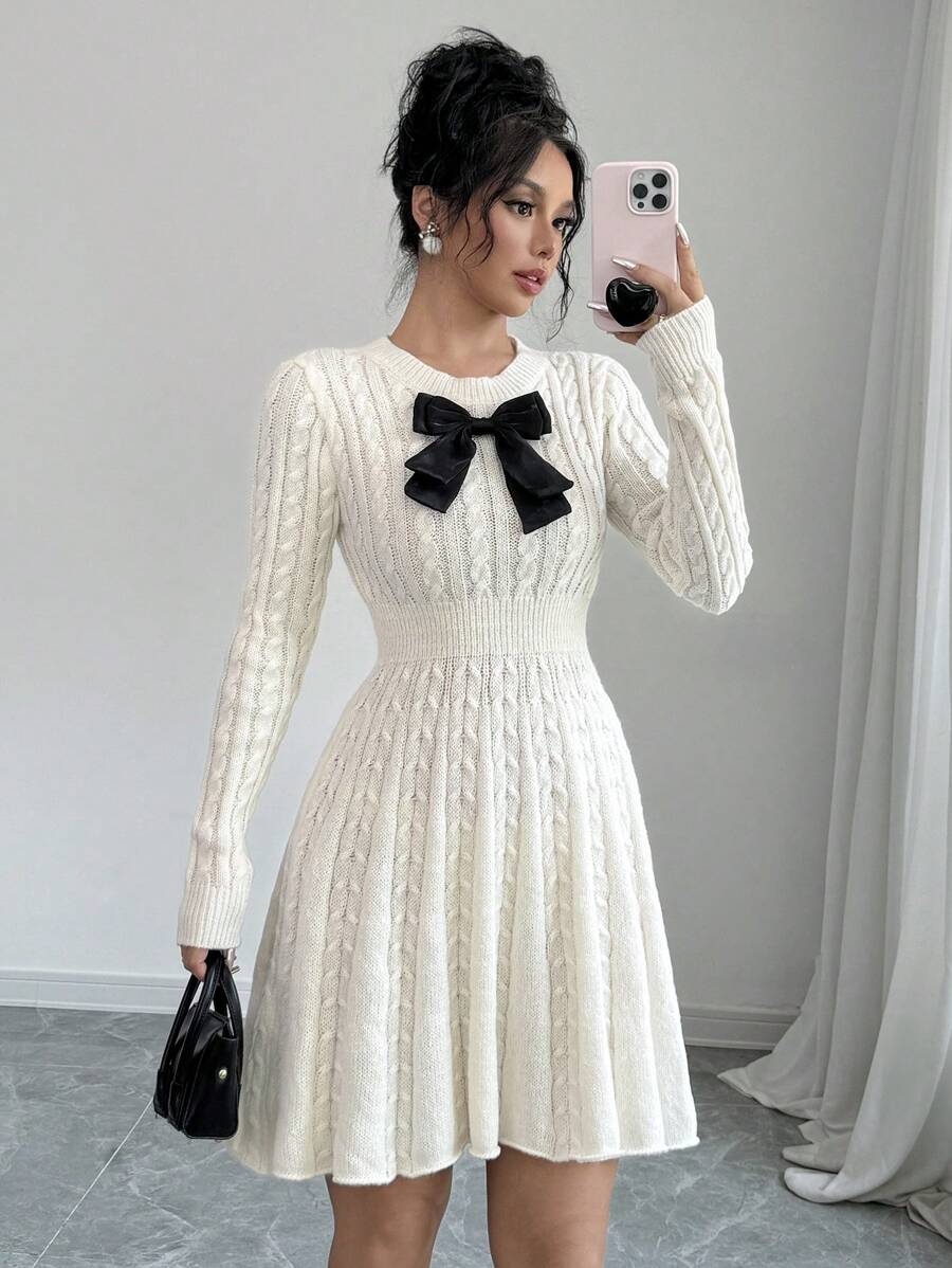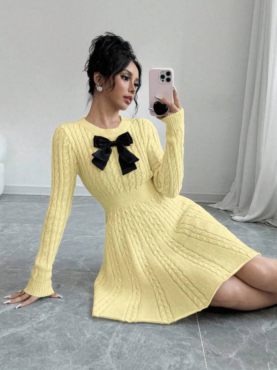 EMI Elegant Simple Bow Decor Knit Sweater Dress, Autumn/Winter Fall Cloth For Women