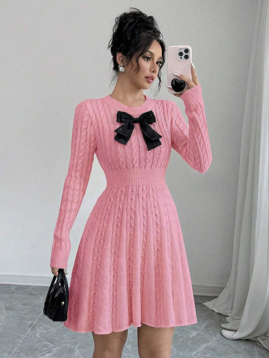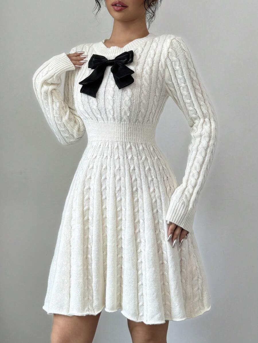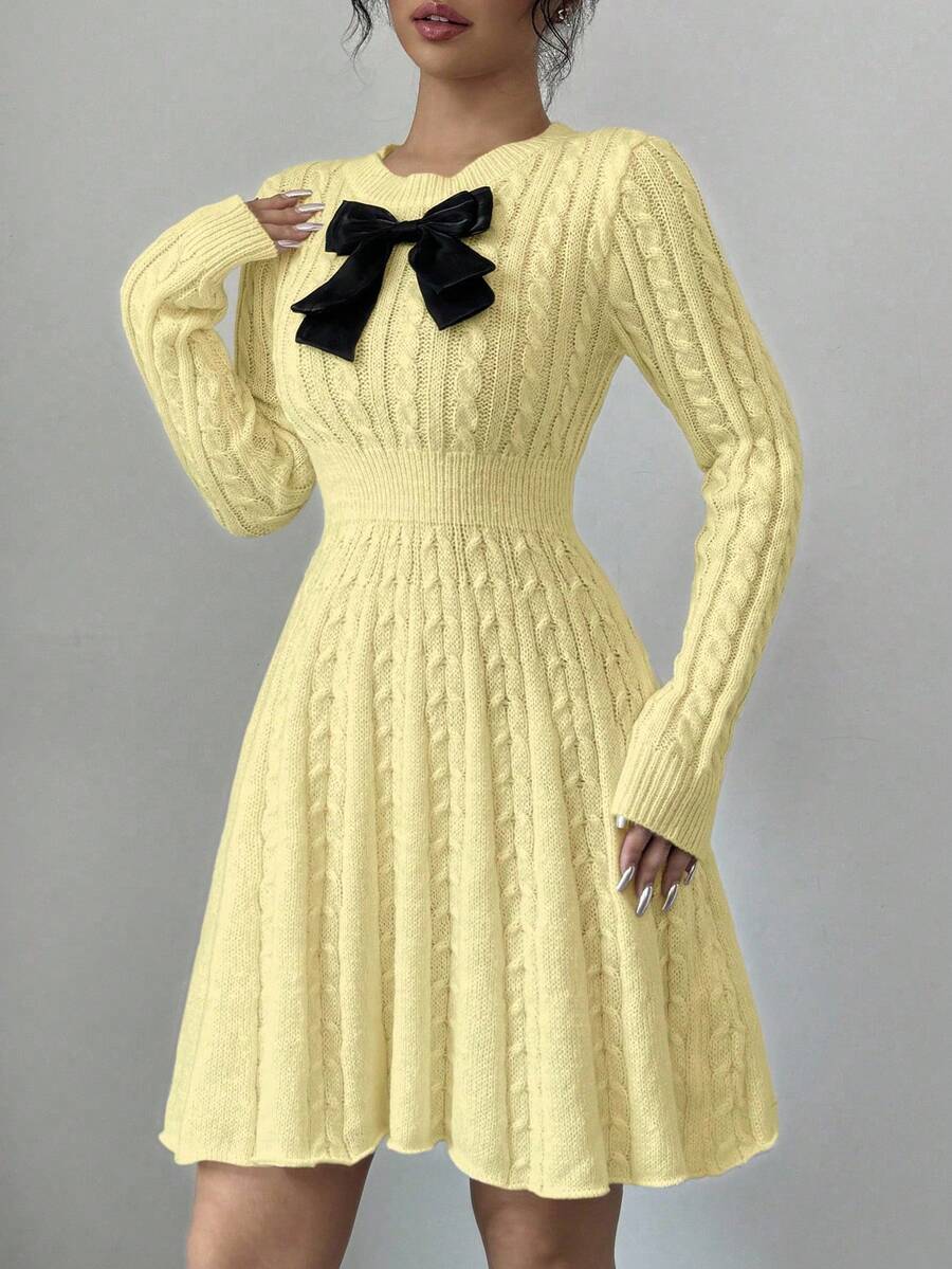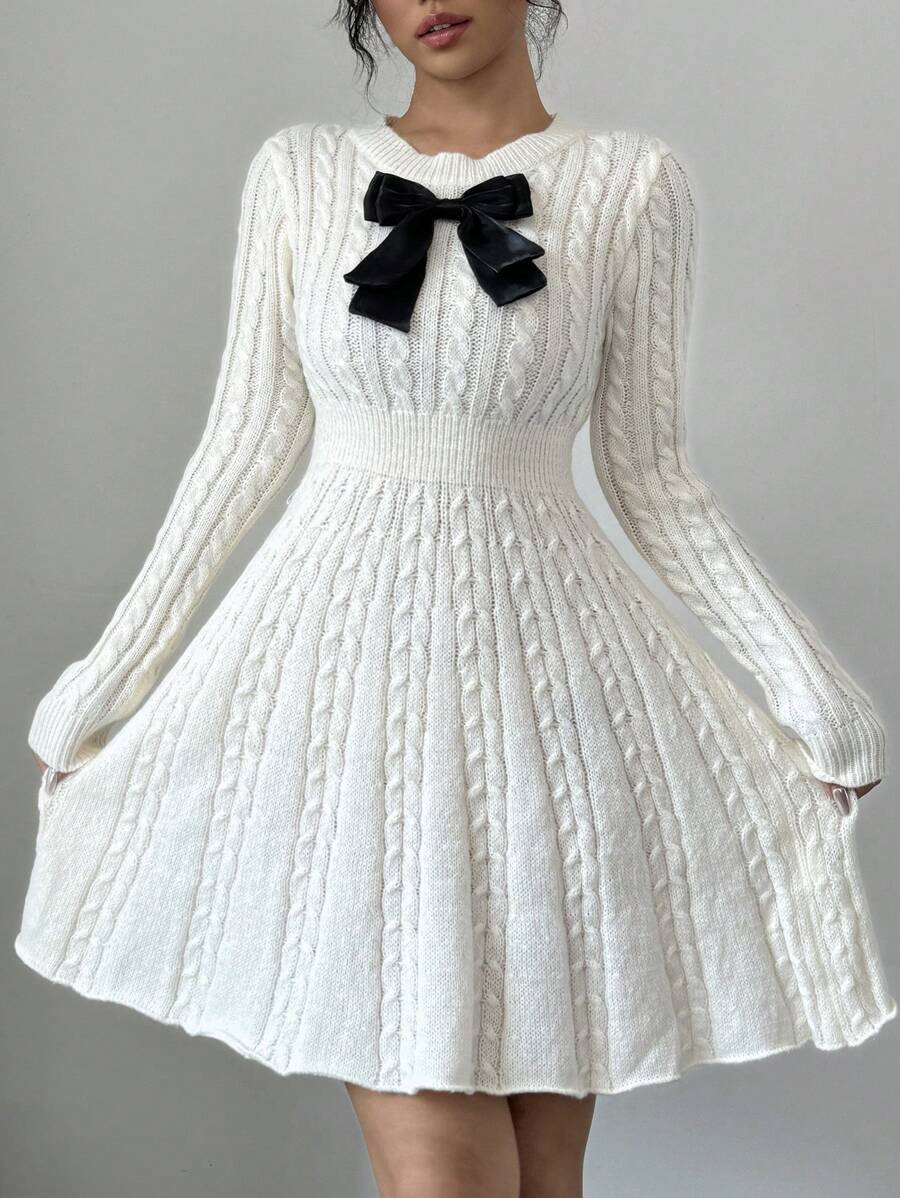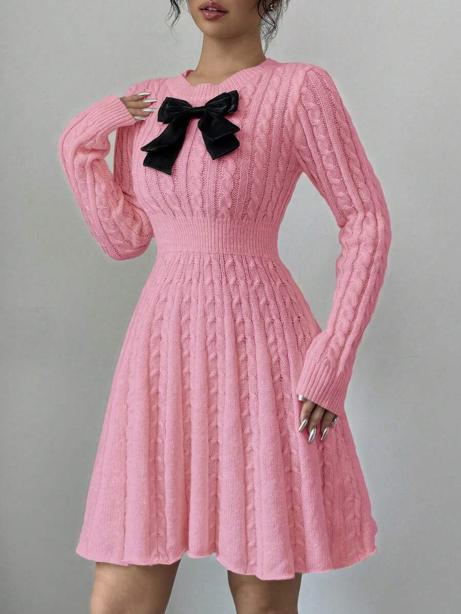 EMI Elegant Simple Bow Decor Knit Sweater Dress, Autumn/Winter Fall Cloth For Women