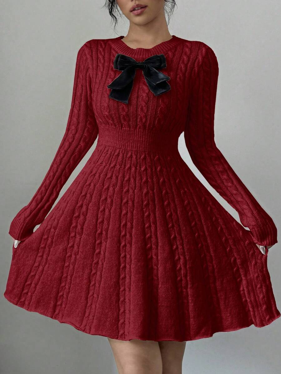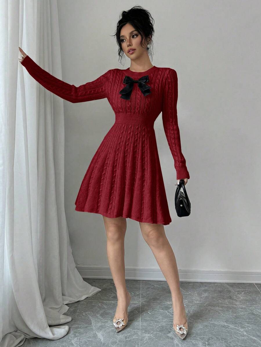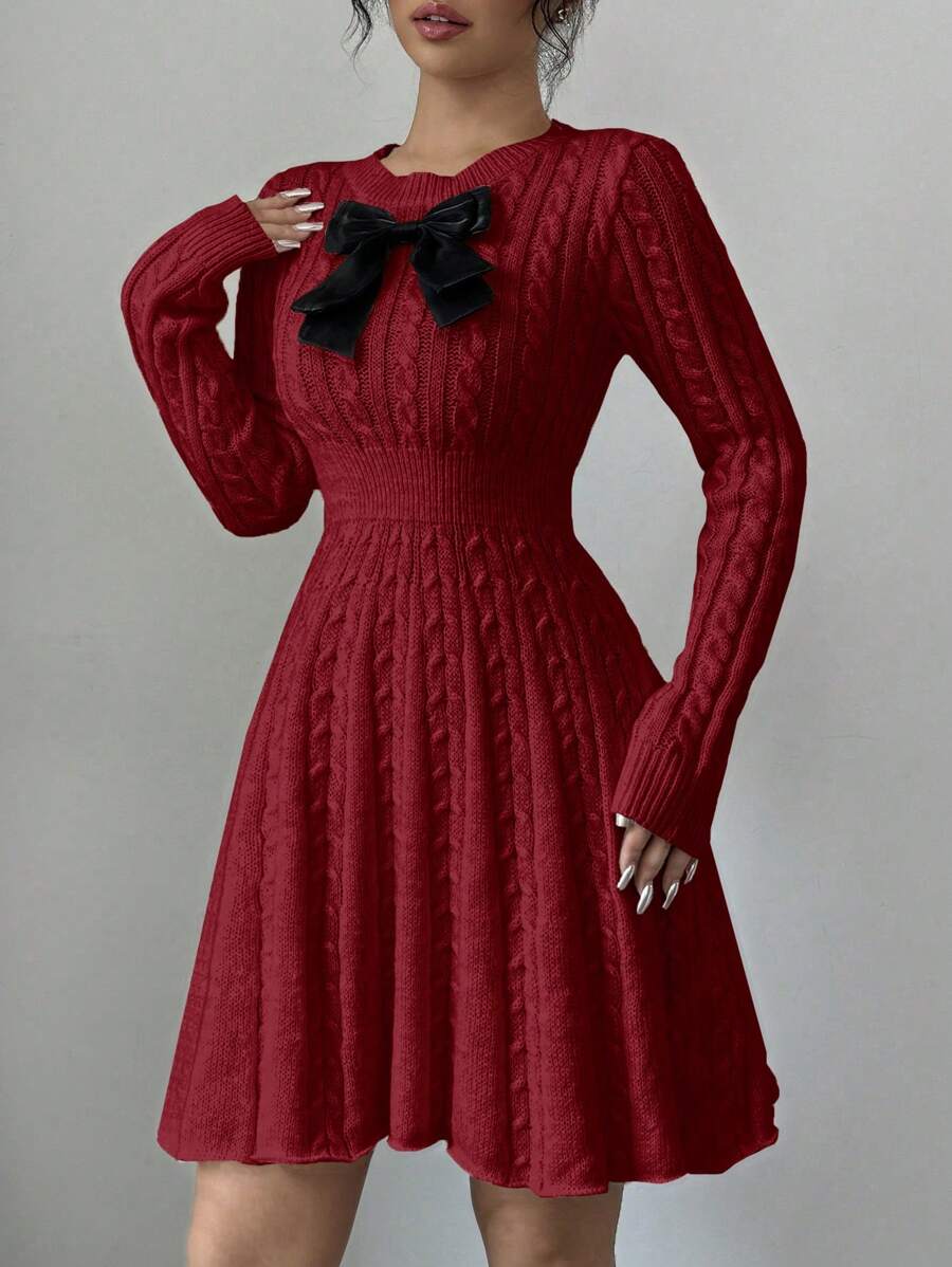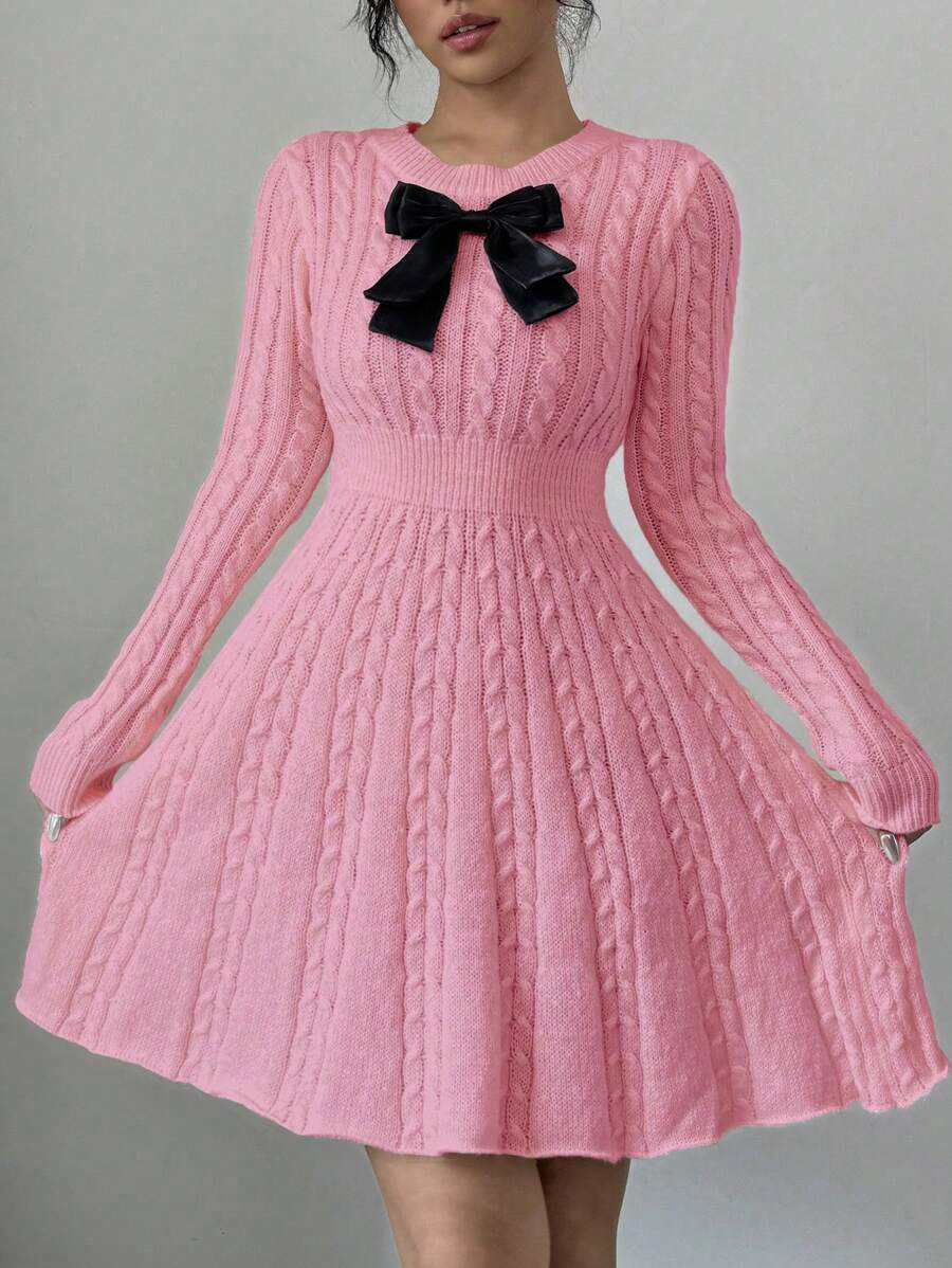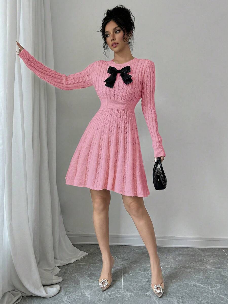 EMI Elegant Simple Bow Decor Knit Sweater Dress, Autumn/Winter Fall Cloth For Women