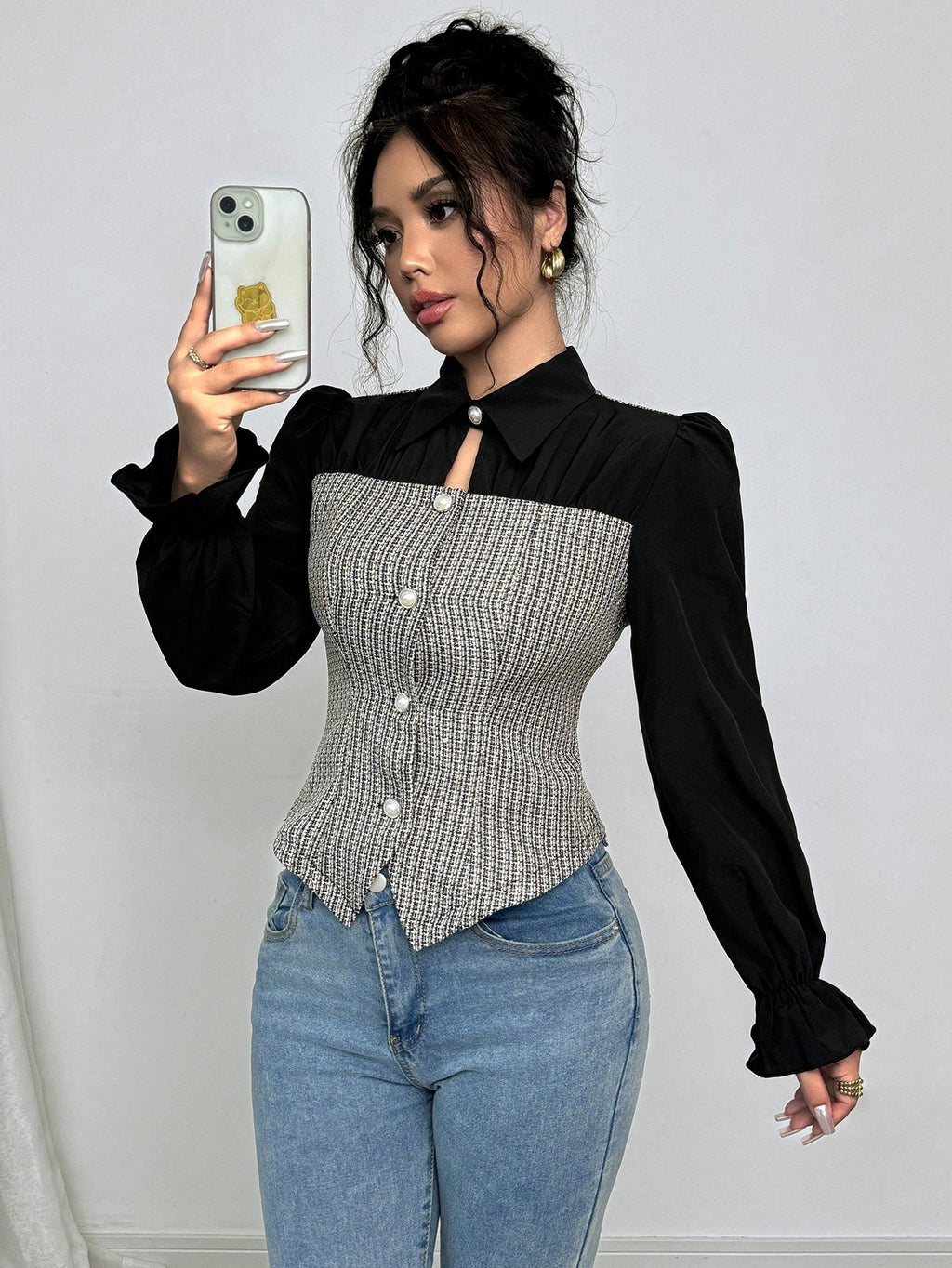 EMI Women Casual Patchwork Tweed Long Sleeve Shirt, Autumn,Long Sleeve Tops Fall Cloth For Women