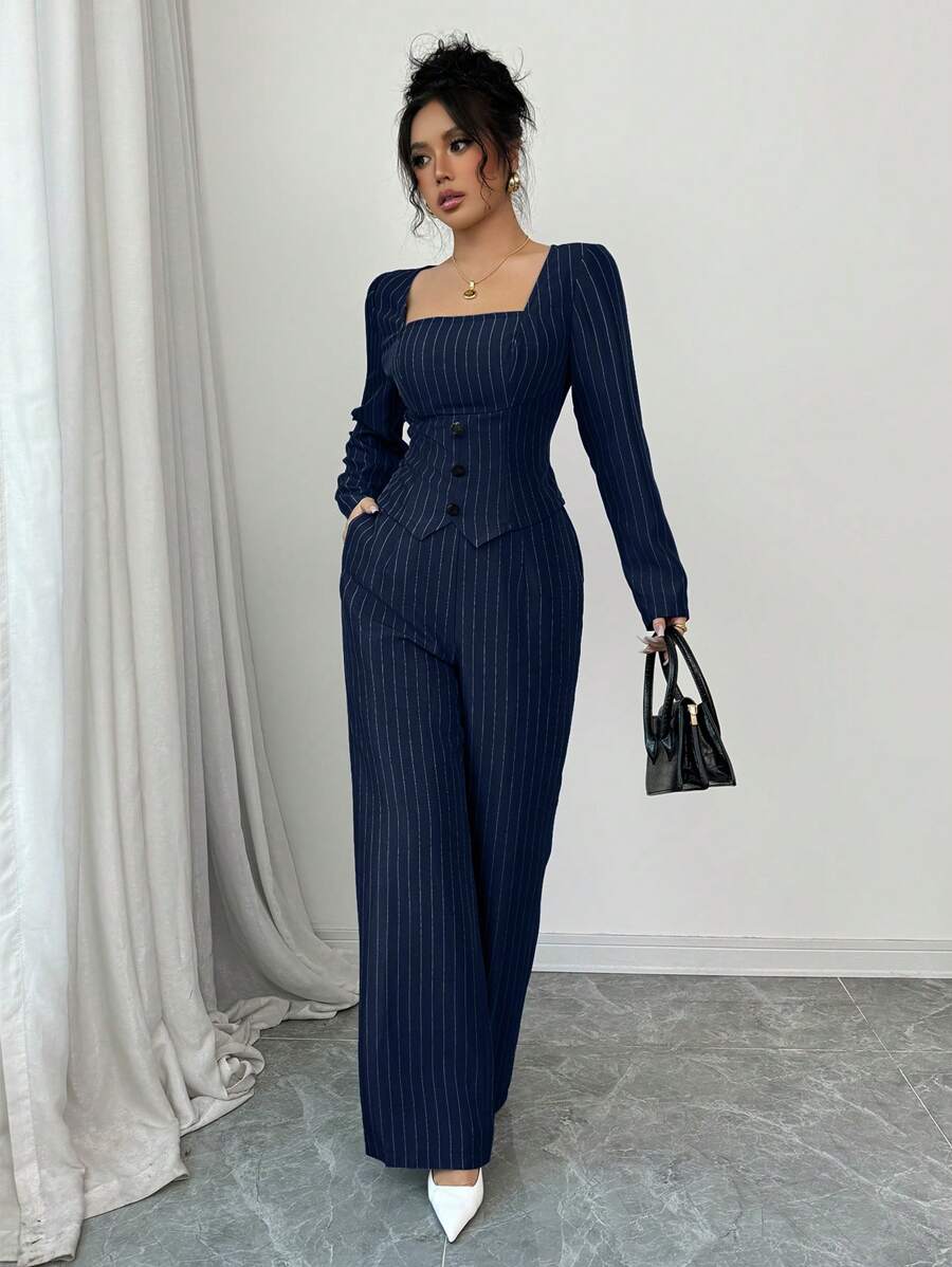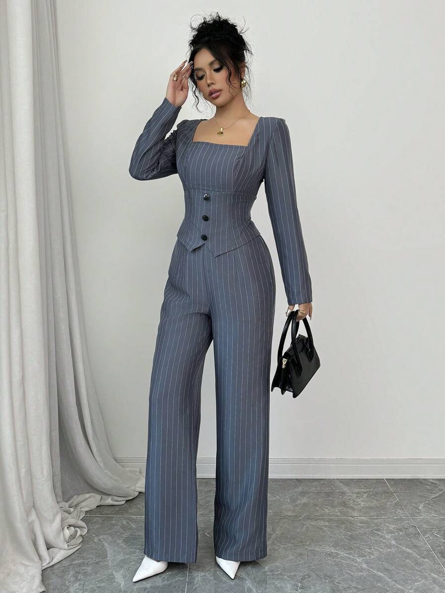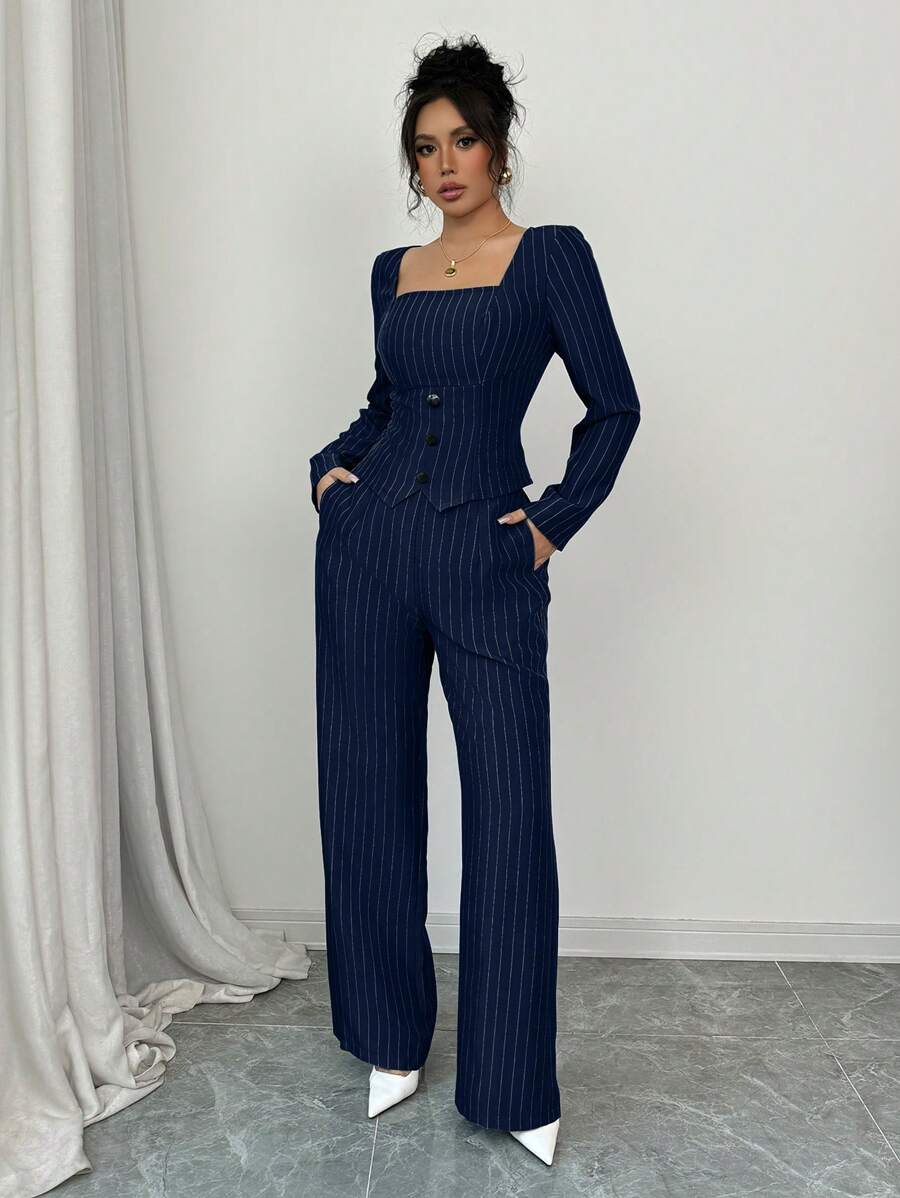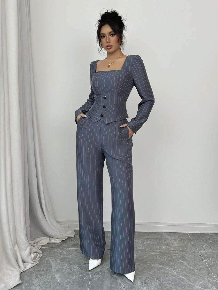 EMI Women Square Collar Faux Blazer With Long Sleeve Top Women Stripe Suit Pants, Commuting Elegant Fall Cloth For Women