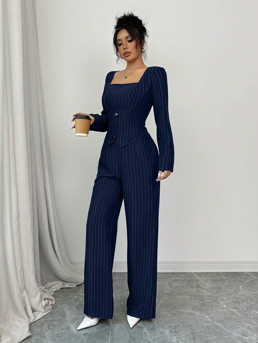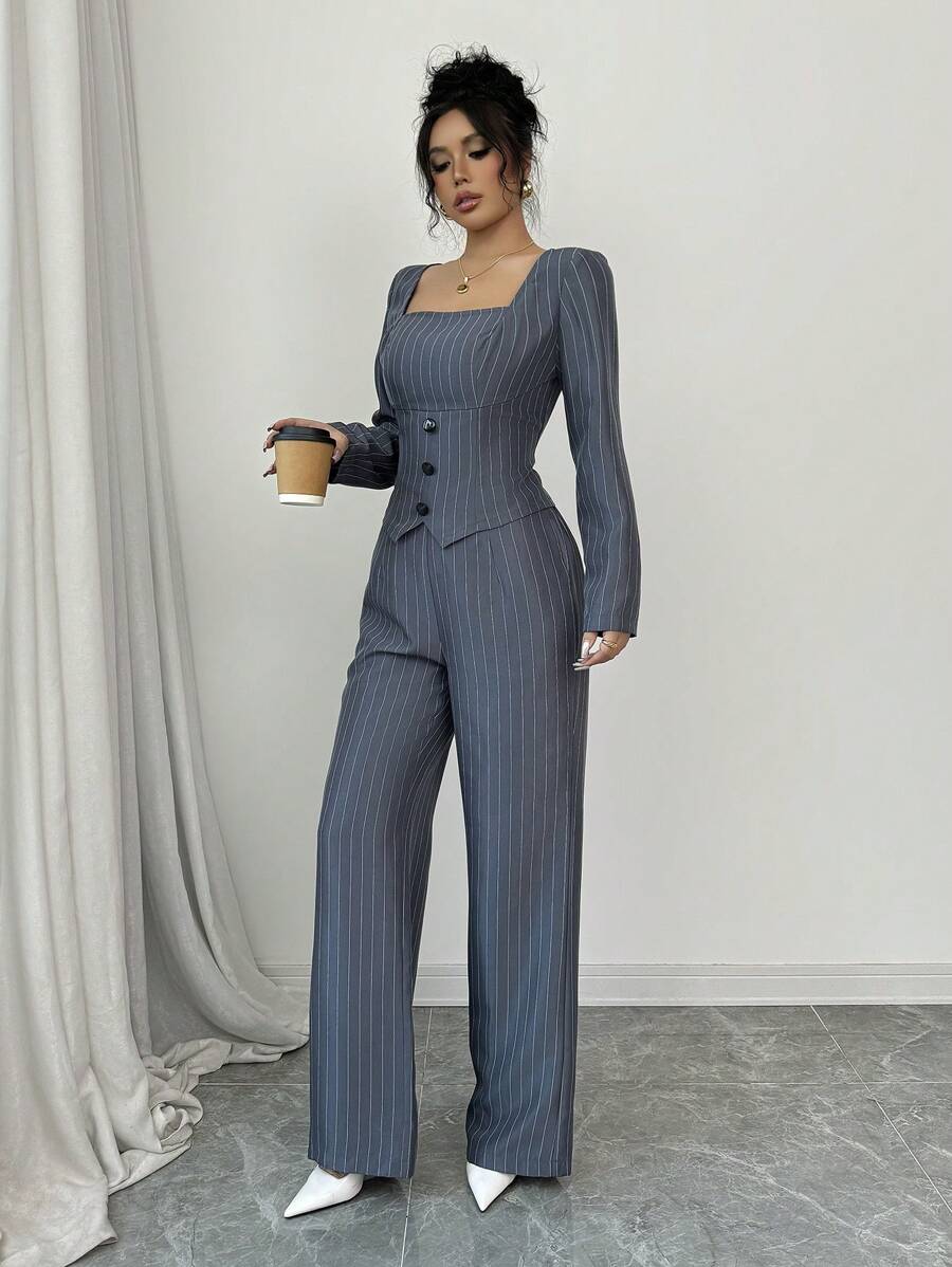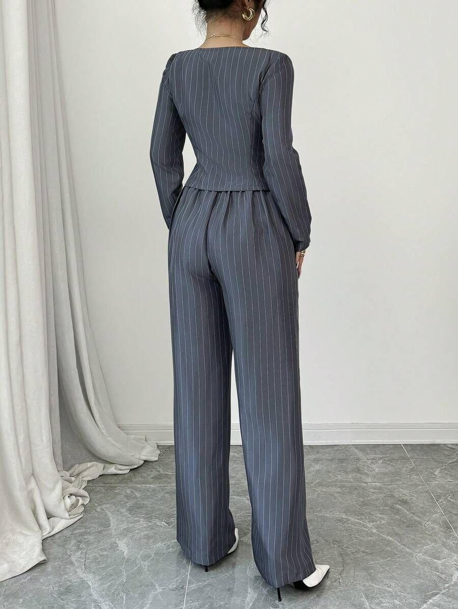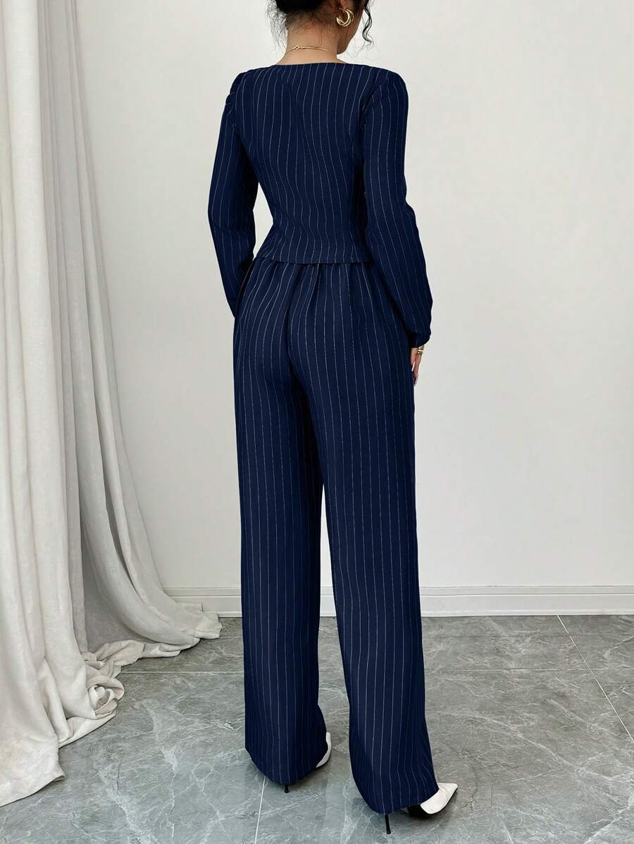 EMI Women Square Collar Faux Blazer With Long Sleeve Top Women Stripe Suit Pants, Commuting Elegant Fall Cloth For Women