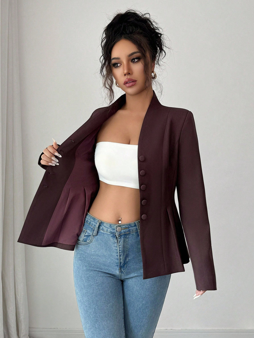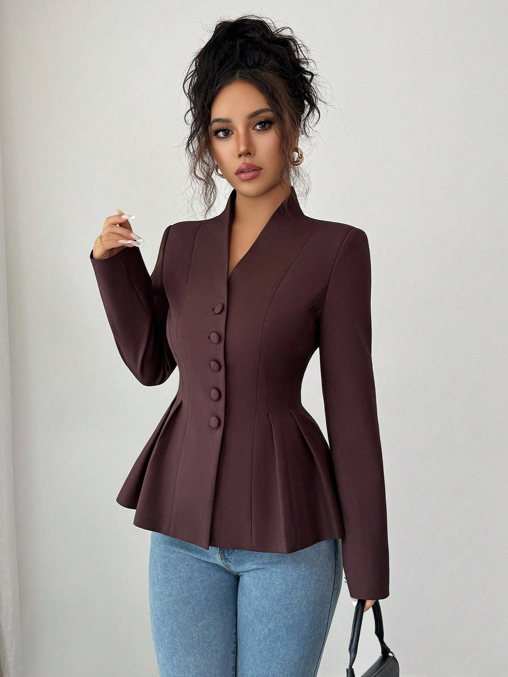 EMI Women's Casual Elegant Solid Color V-Neck Ruched A-Line Jacket, Suitable For Commute, Vacation, Afternoon Tea, Party, Autumn/Winter Fall Cloth For Women