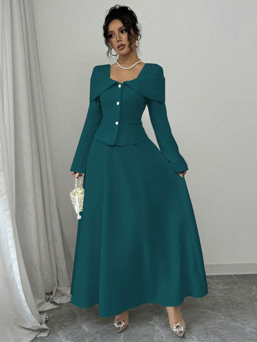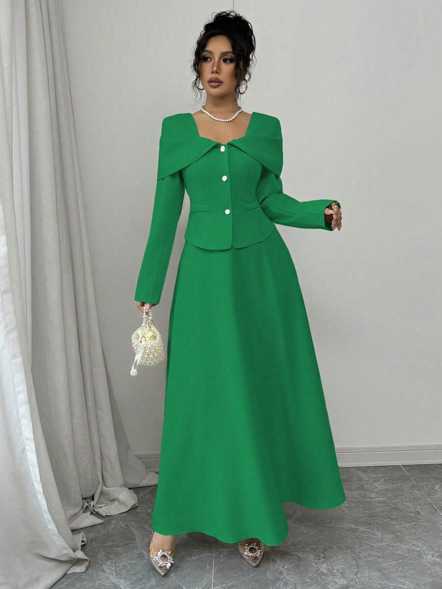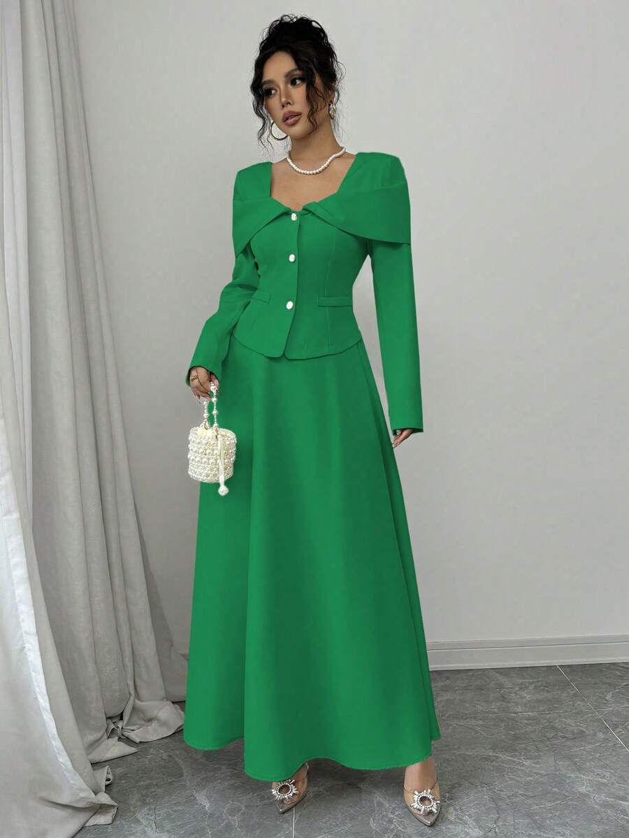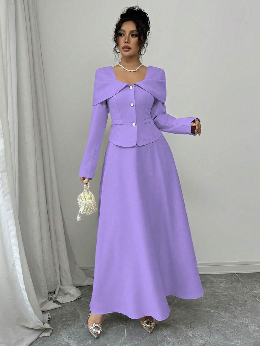 EMI Women's Elegant Commuter Solid Color Jacket And Extra-Long A-Line Skirt 2 Pieces Set Fall Cloth For Women
