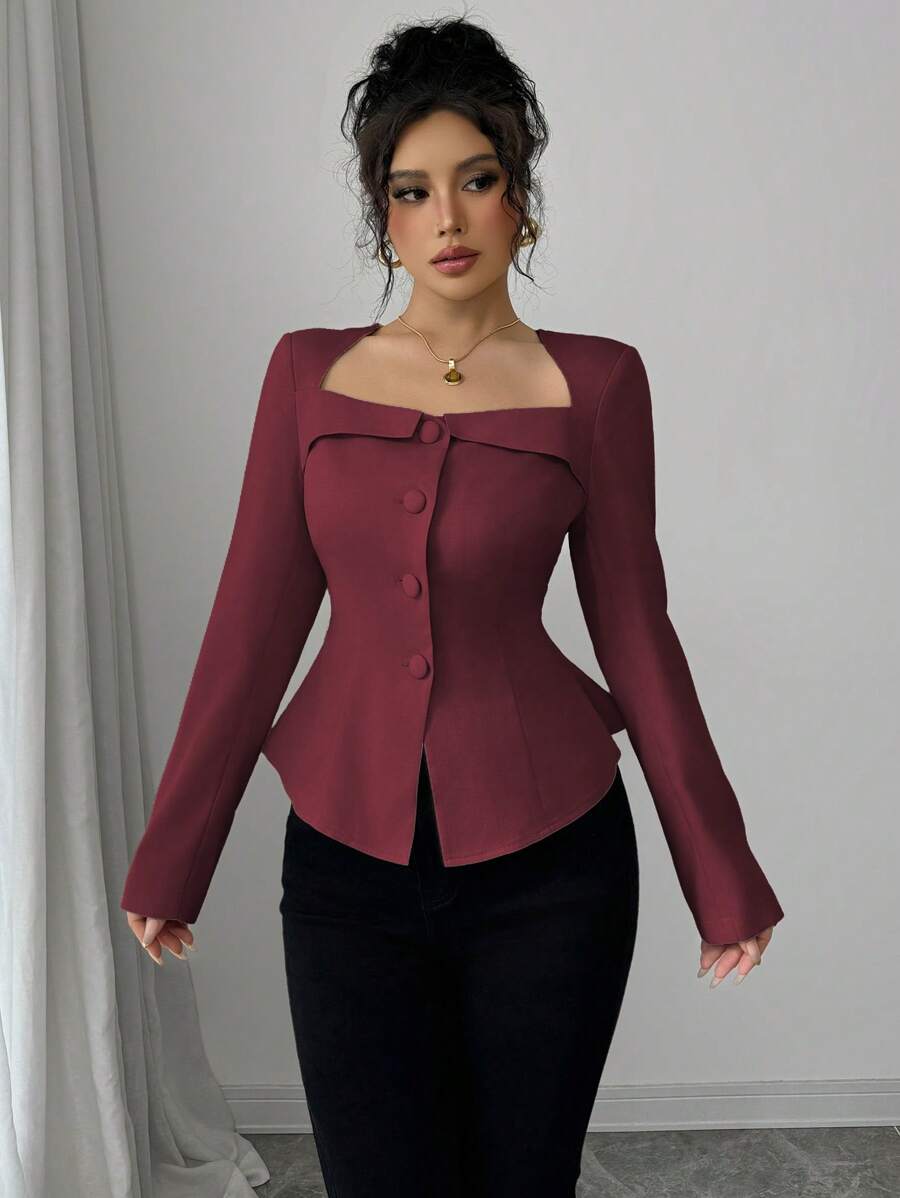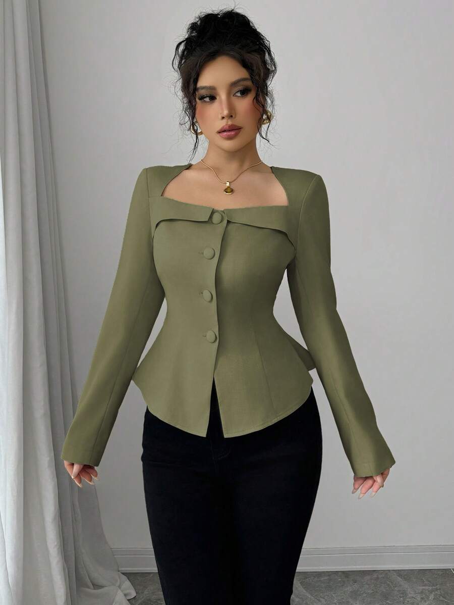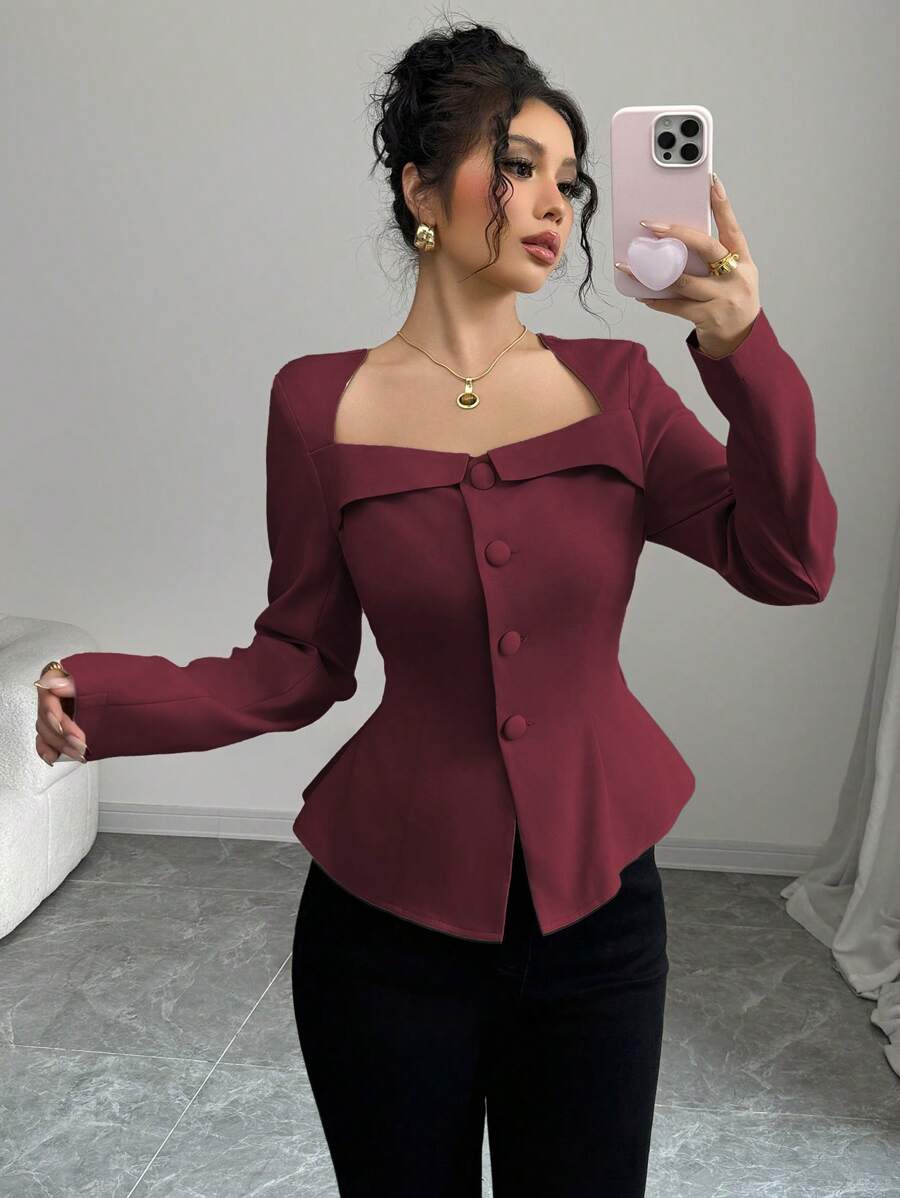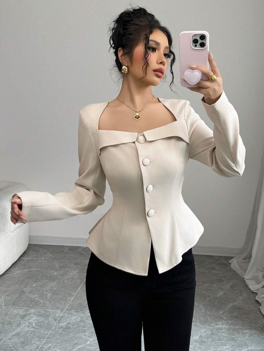 EMI Women's Elegant French Style Trapezoidal Collar Square Neck Front Button Decorative Waistline A-Line Long Sleeve Shirt, Suitable For Spring, Autumn And Winter Commuting Fall Cloth For Women