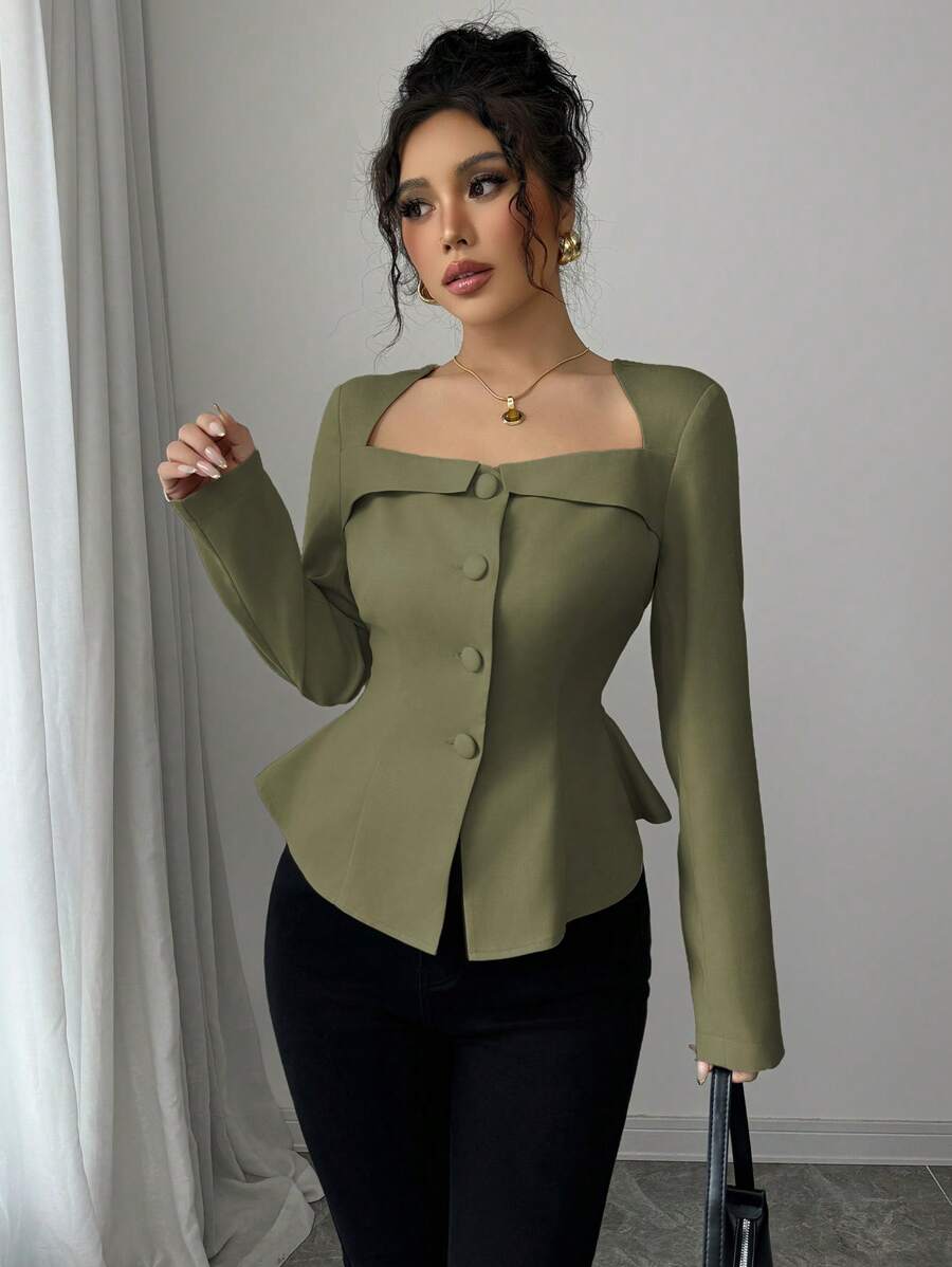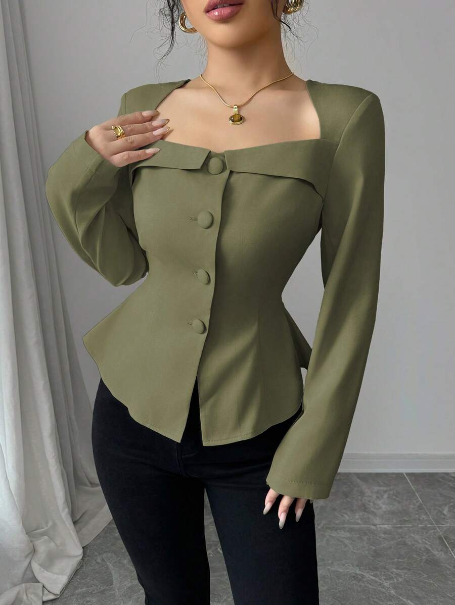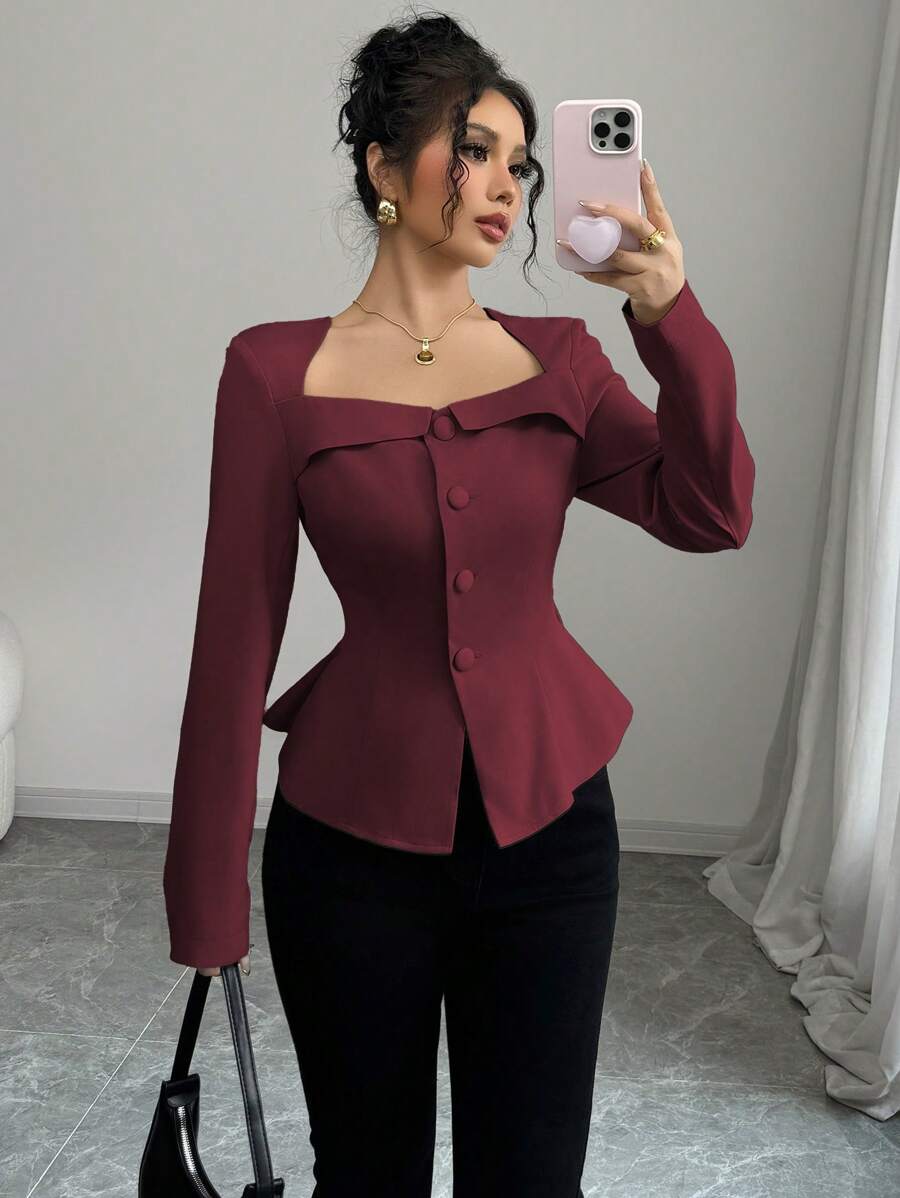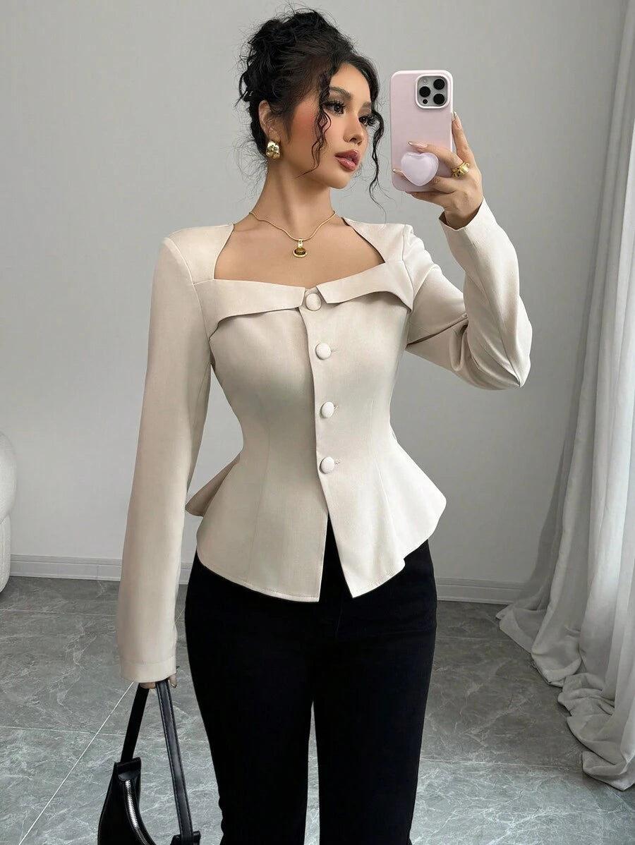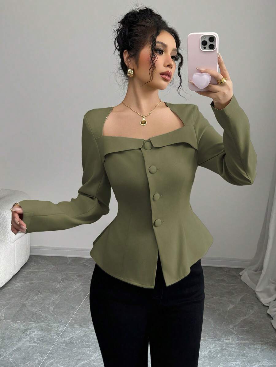 EMI Women's Elegant French Style Trapezoidal Collar Square Neck Front Button Decorative Waistline A-Line Long Sleeve Shirt, Suitable For Spring, Autumn And Winter Commuting Fall Cloth For Women