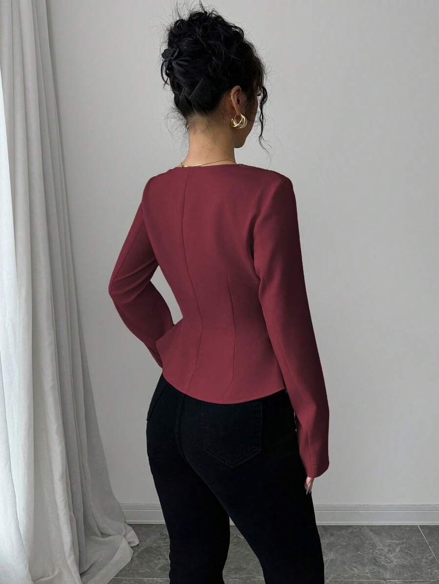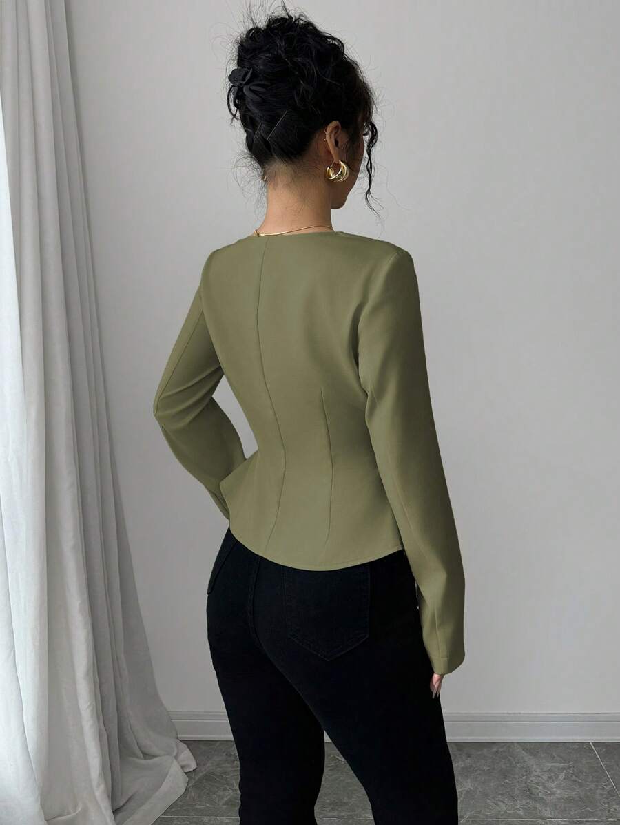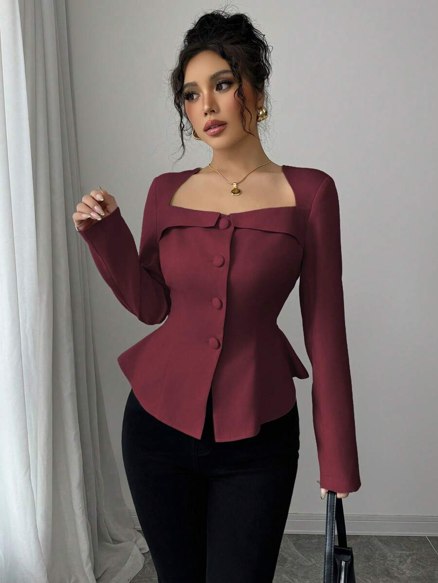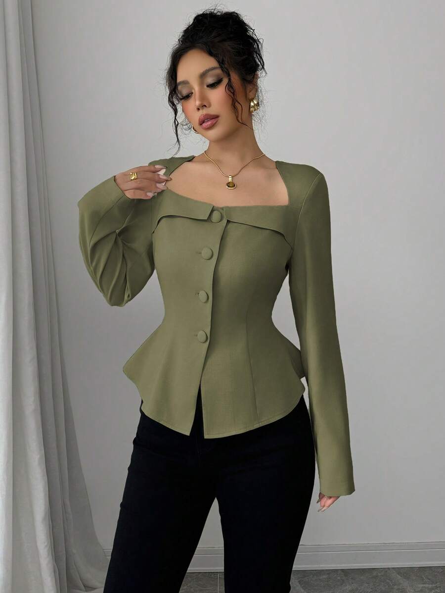 EMI Women's Elegant French Style Trapezoidal Collar Square Neck Front Button Decorative Waistline A-Line Long Sleeve Shirt, Suitable For Spring, Autumn And Winter Commuting Fall Cloth For Women
