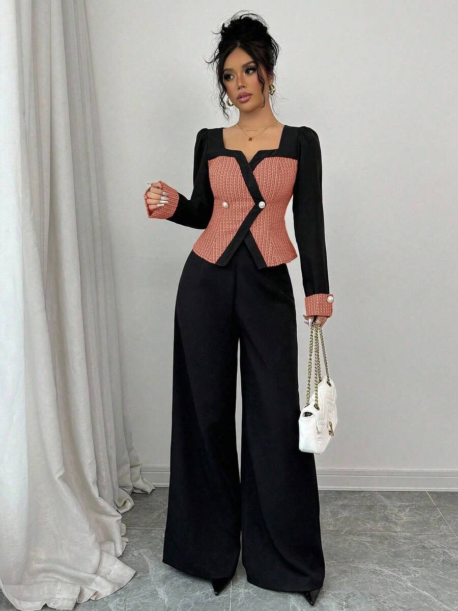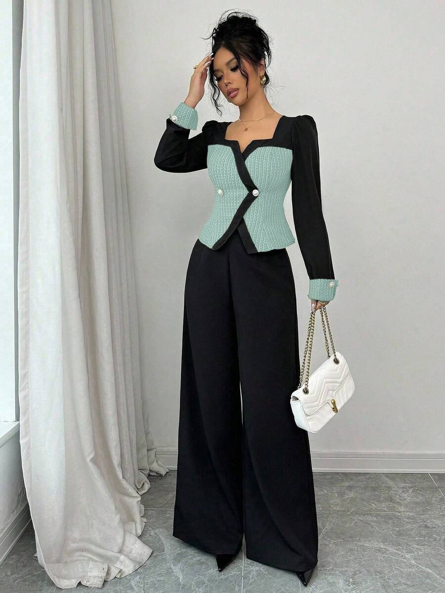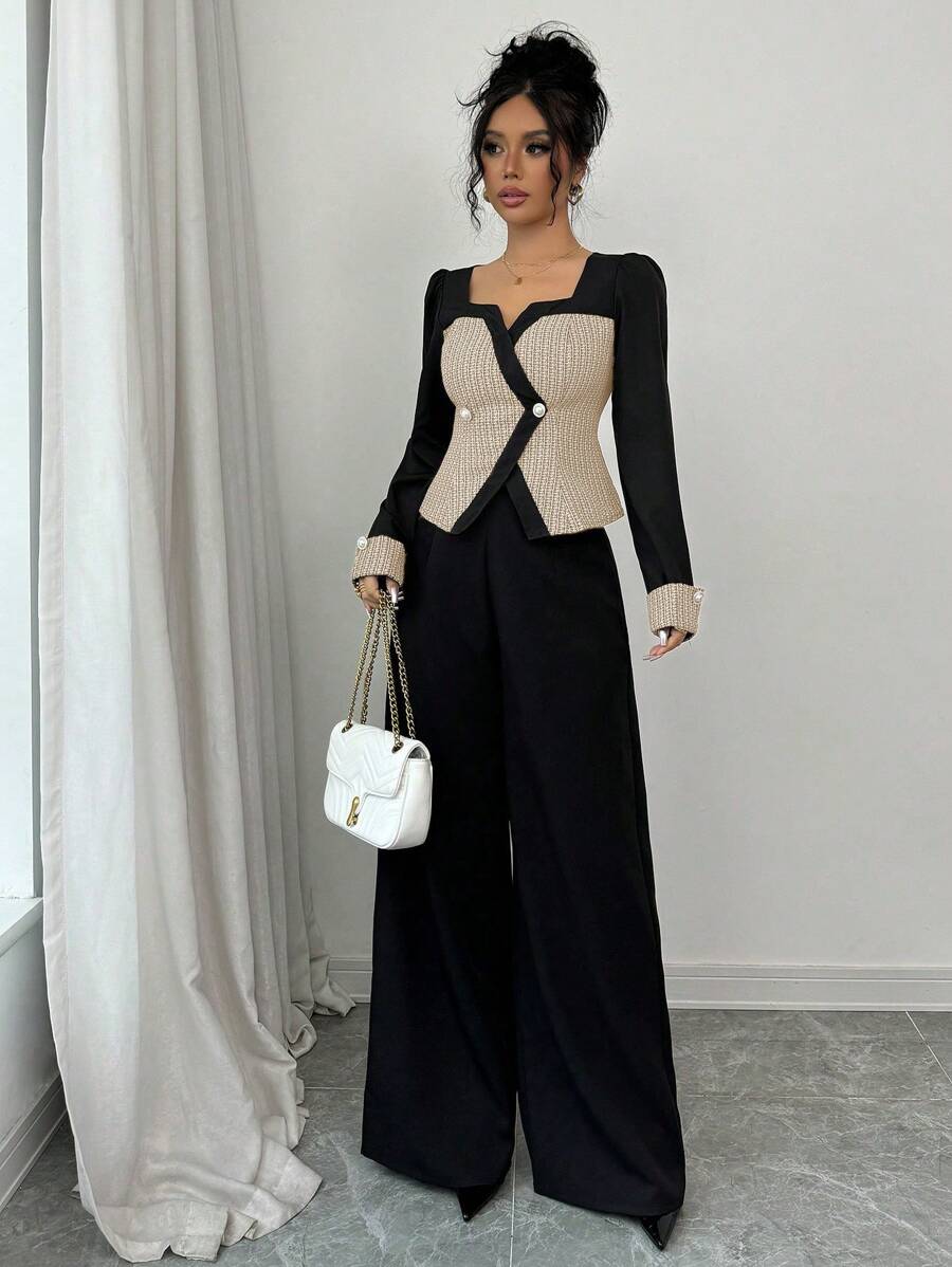 EMI Women's Elegant Plaid Patchwork Double-Breasted Bubble Sleeve Top And Wide Leg Pants Set, Autumn