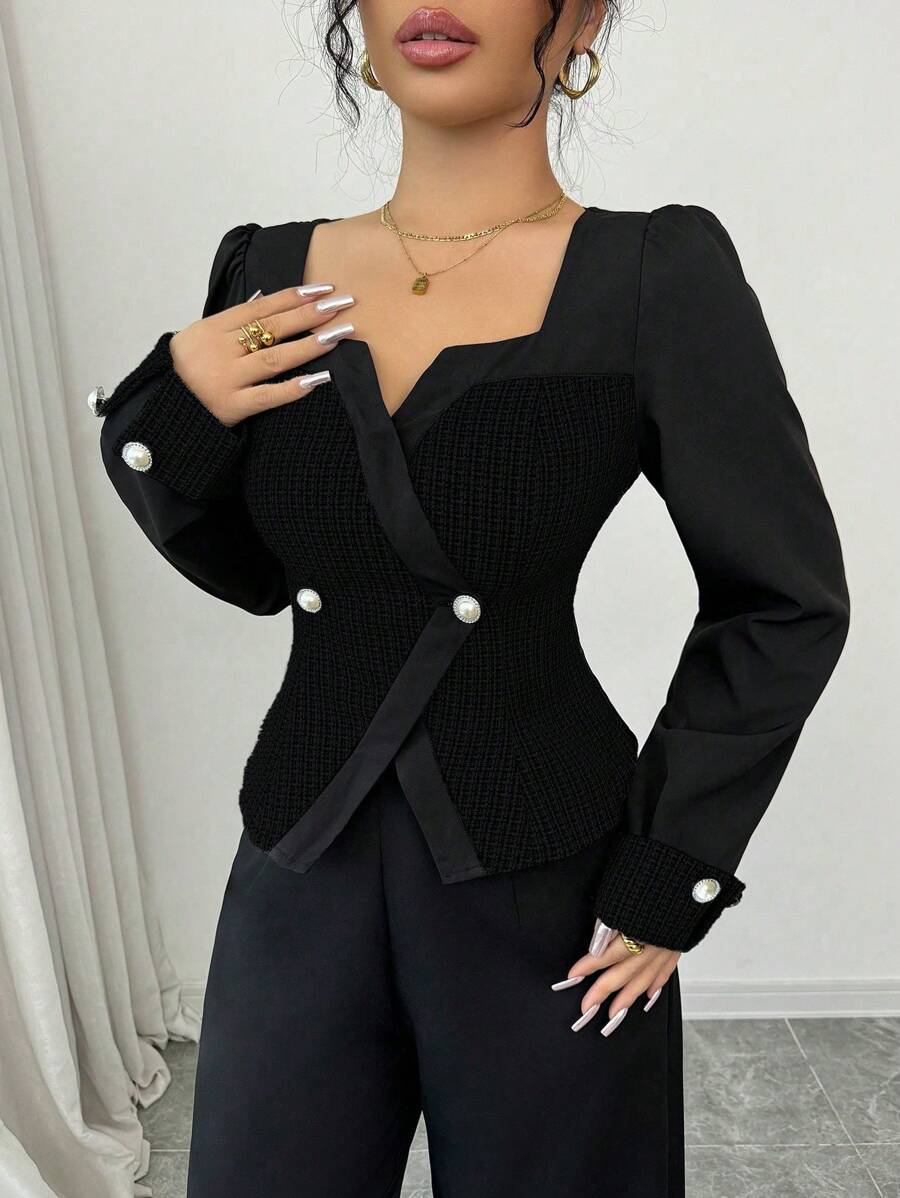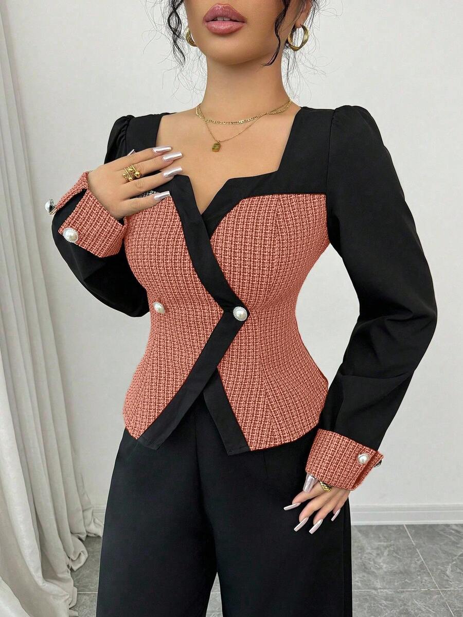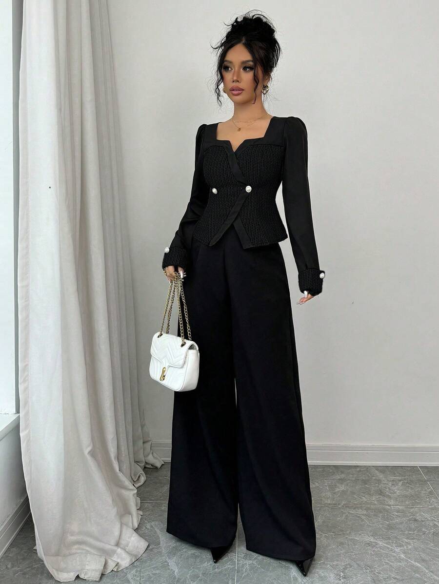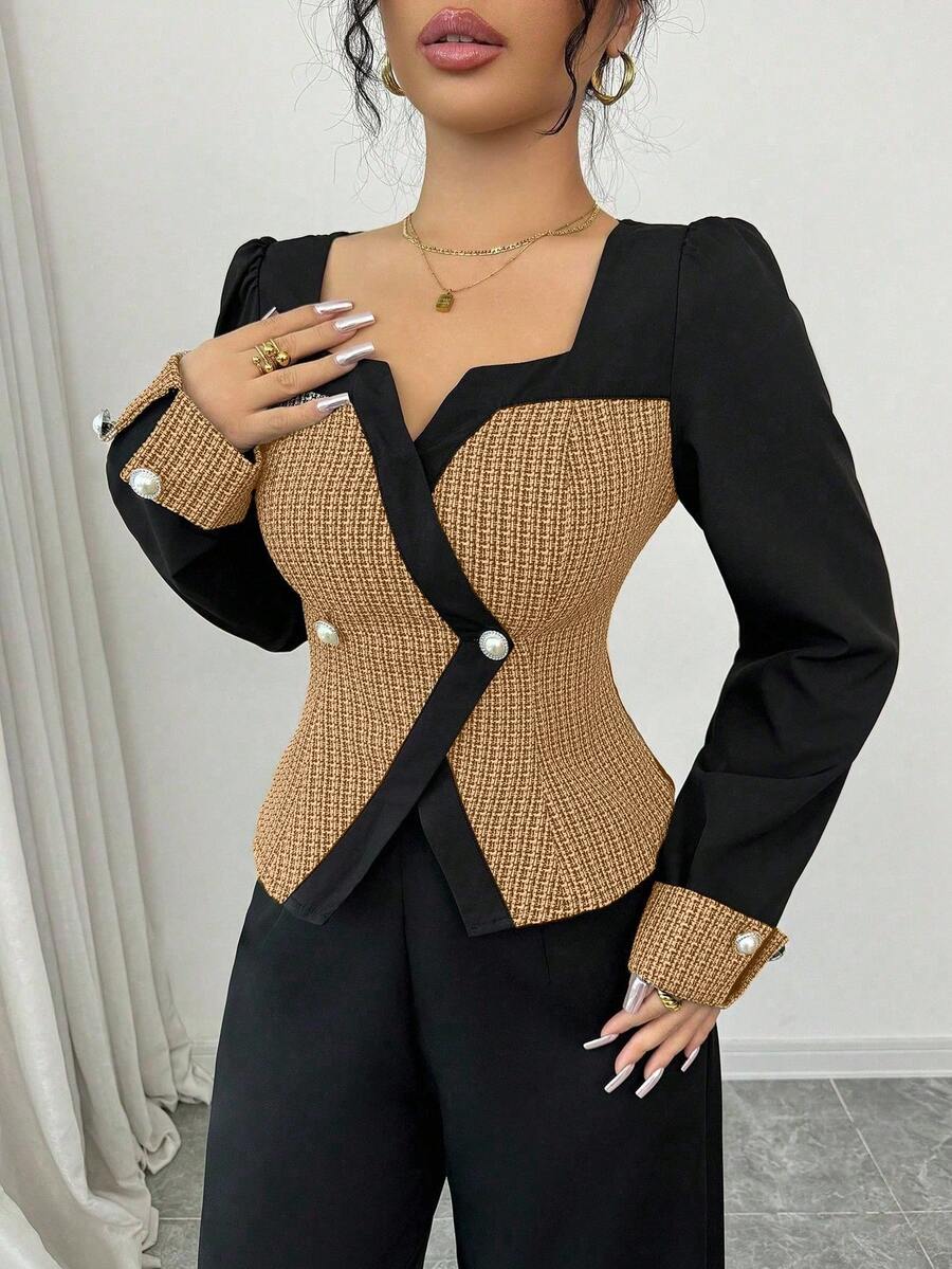 EMI Women's Elegant Plaid Patchwork Double-Breasted Bubble Sleeve Top And Wide Leg Pants Set, Autumn