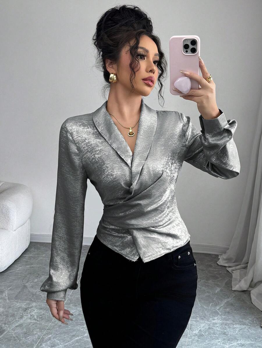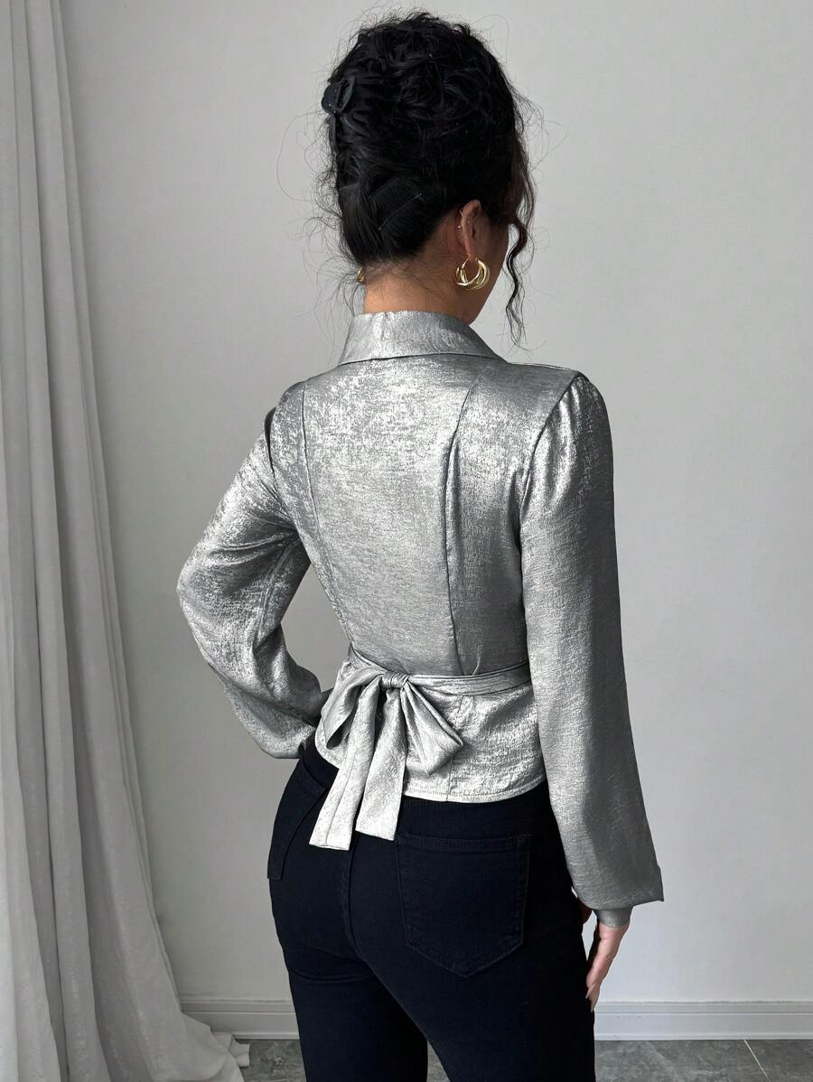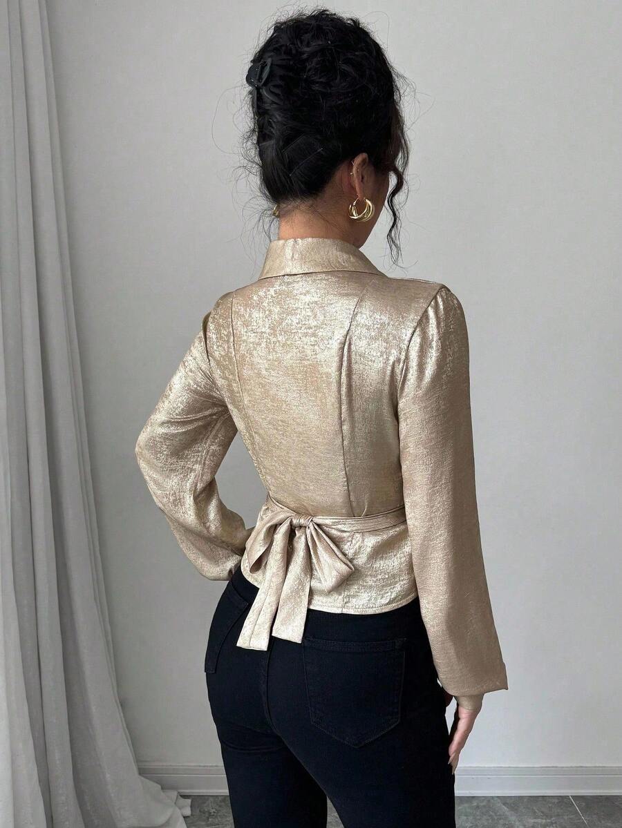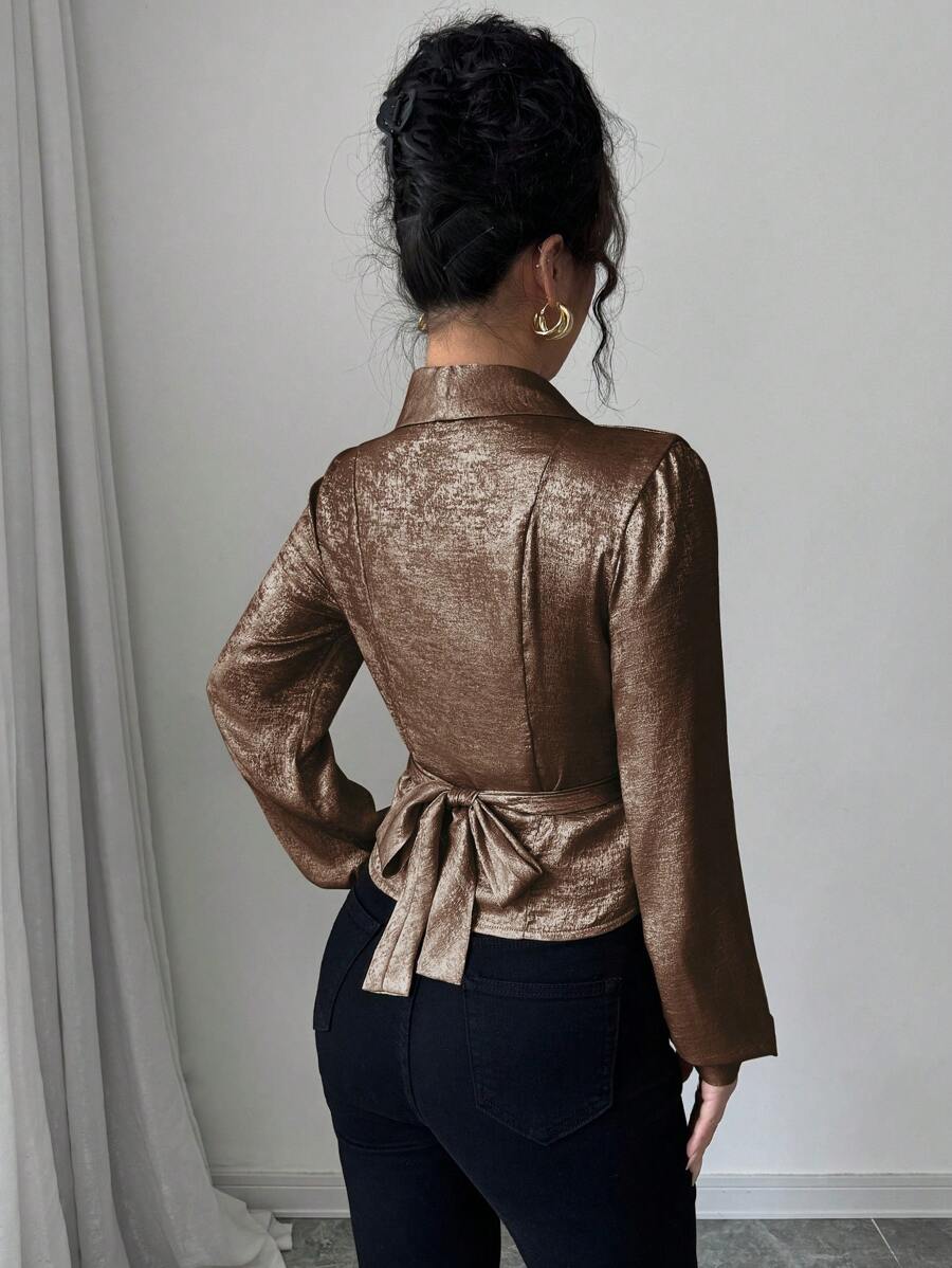 EMI Women's Shiny Fabric V-Neck Cinched Waist Bowknot Elegant Romantic Blouse Fall Cloth For Women
