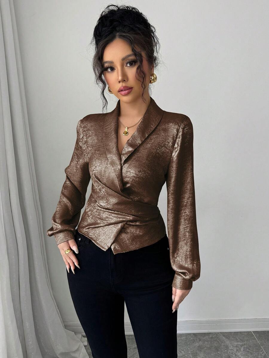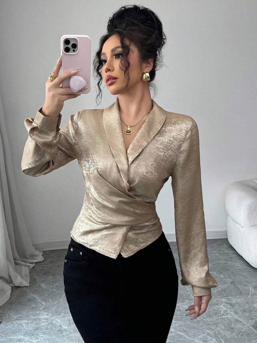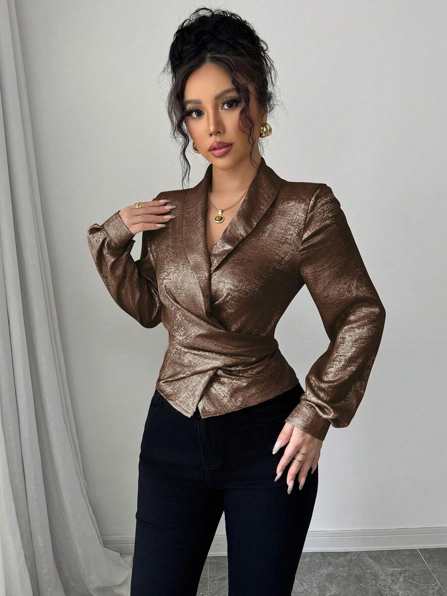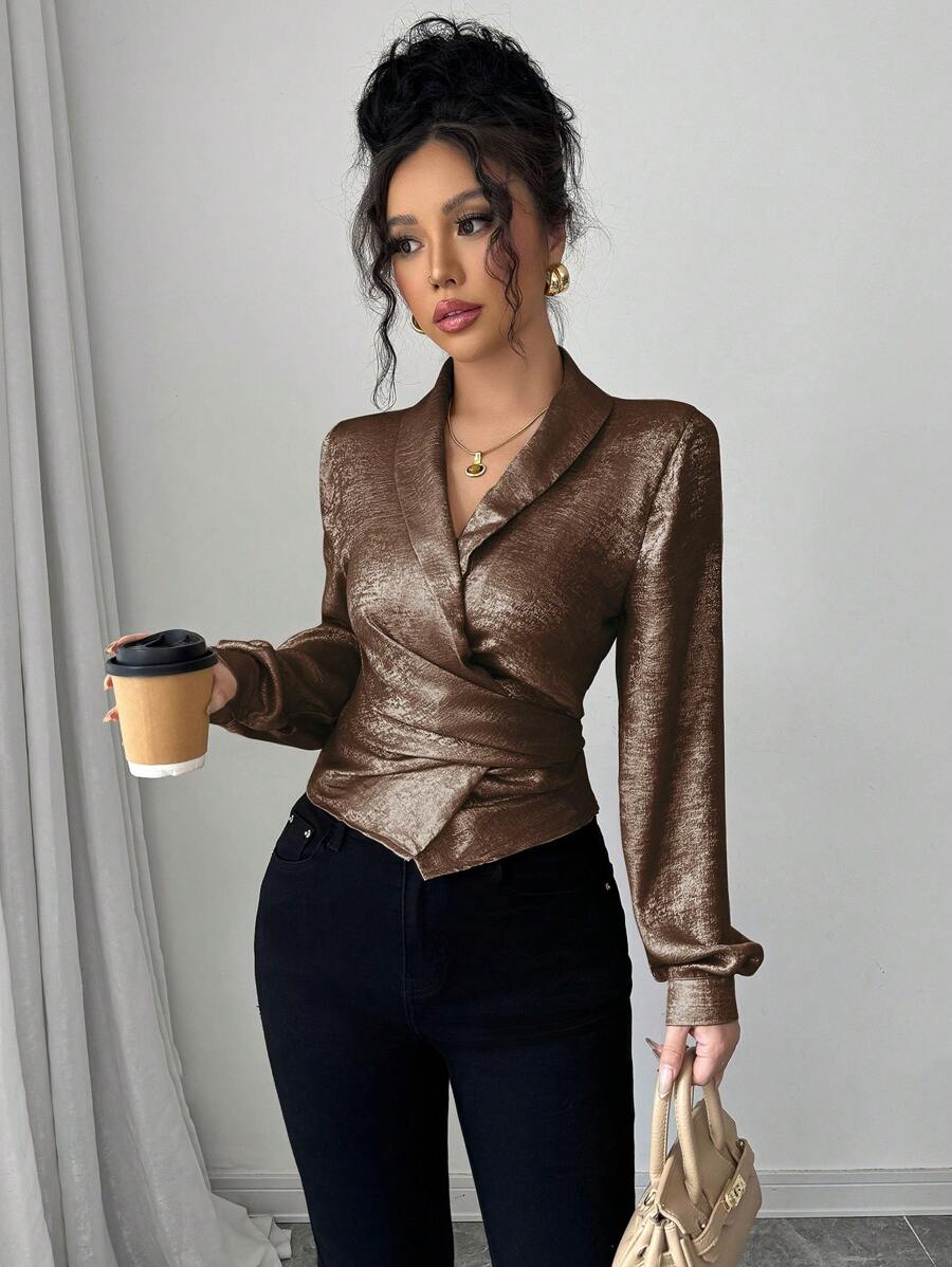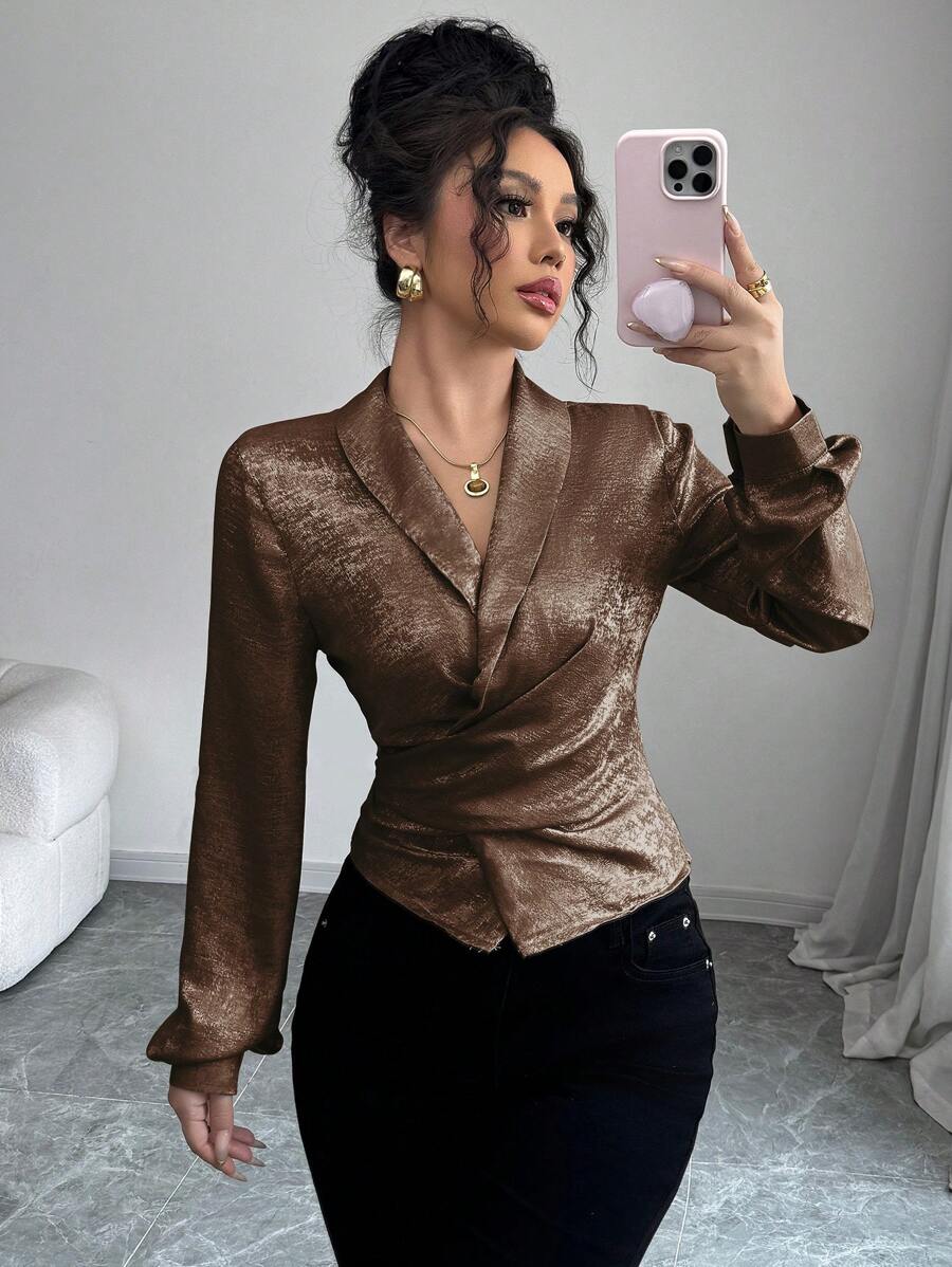 EMI Women's Shiny Fabric V-Neck Cinched Waist Bowknot Elegant Romantic Blouse Fall Cloth For Women