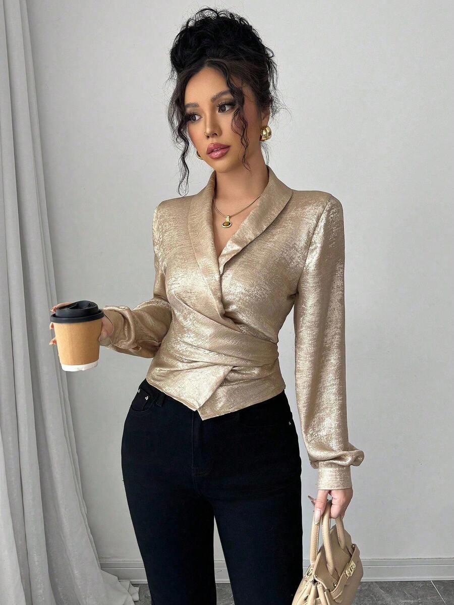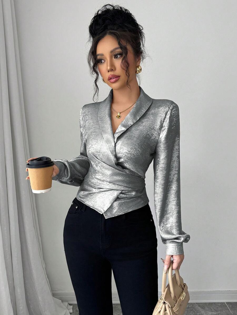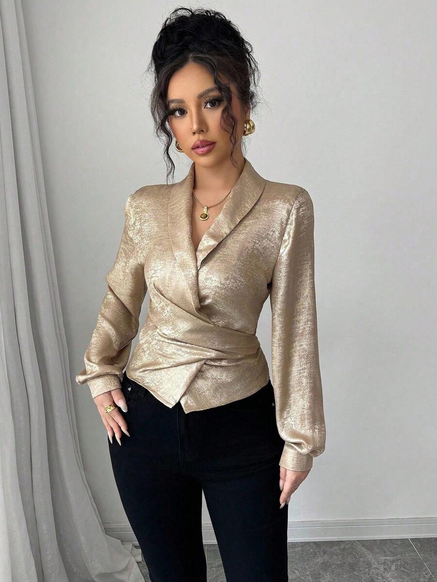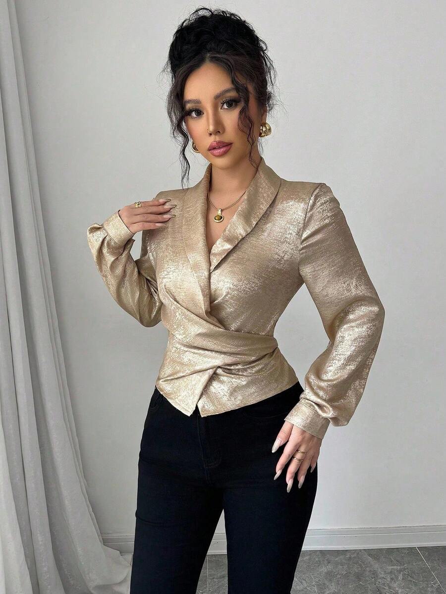 EMI Women's Shiny Fabric V-Neck Cinched Waist Bowknot Elegant Romantic Blouse Fall Cloth For Women