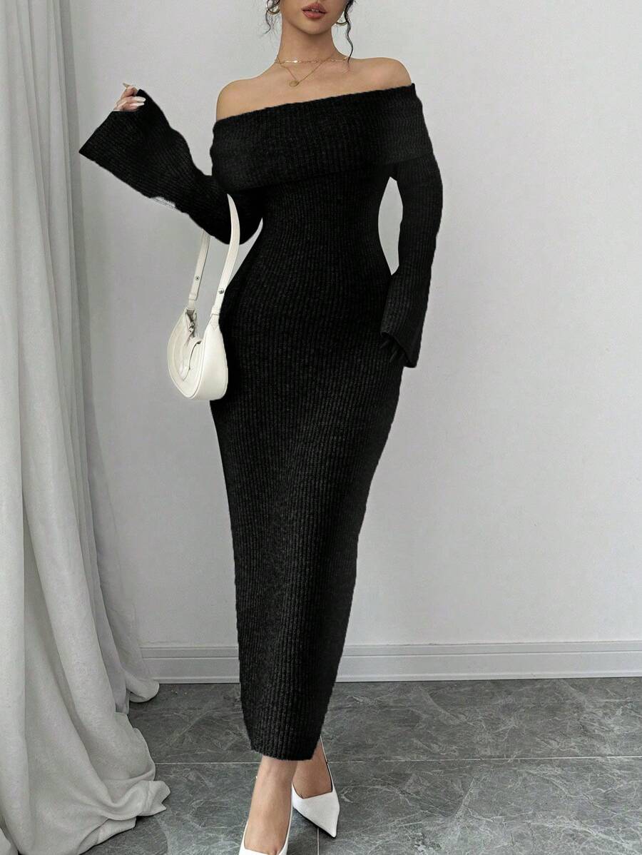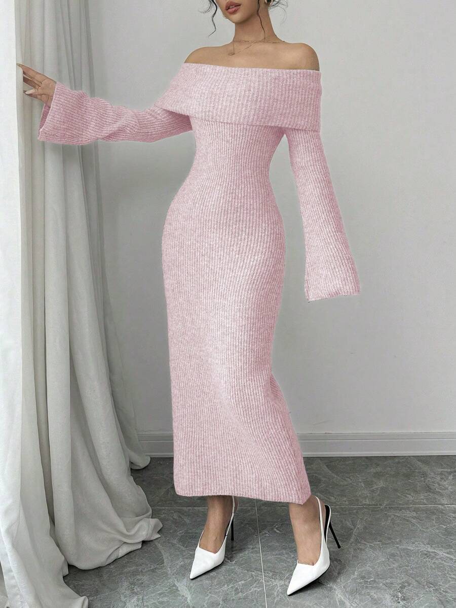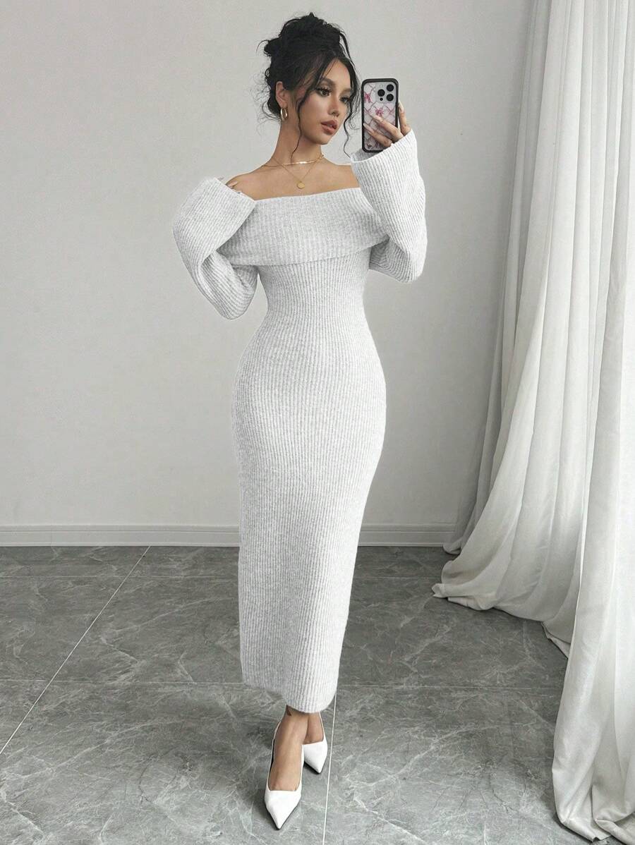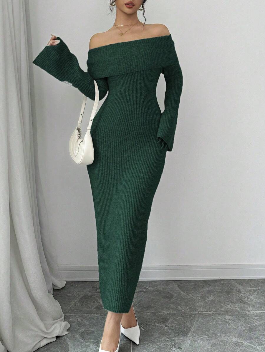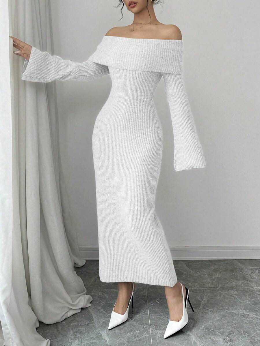 EMI Women's Solid Color Simple Off-Shoulder Long Sleeve Dress, Casual Fall Winter Cloth For Women