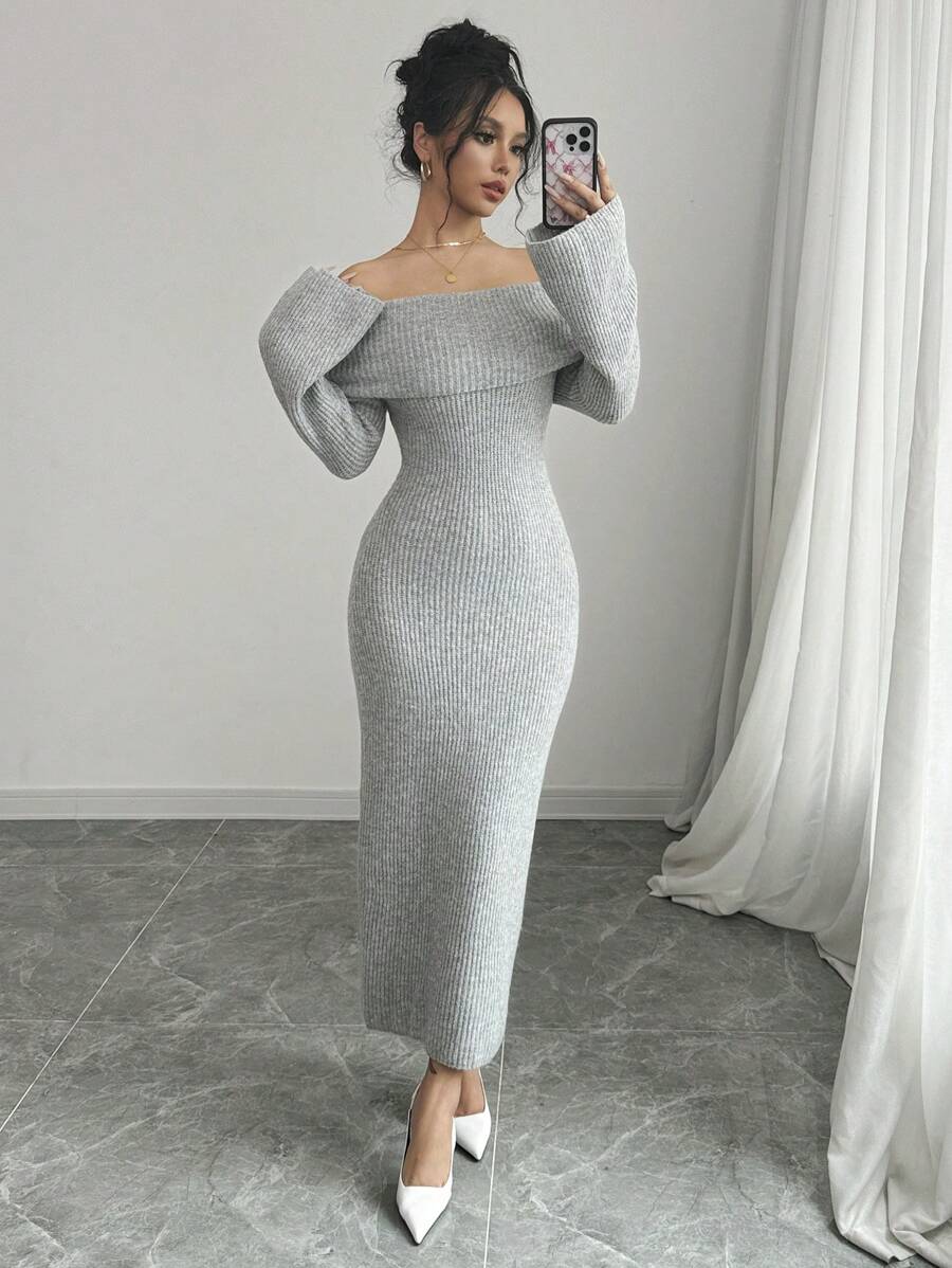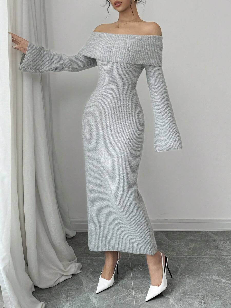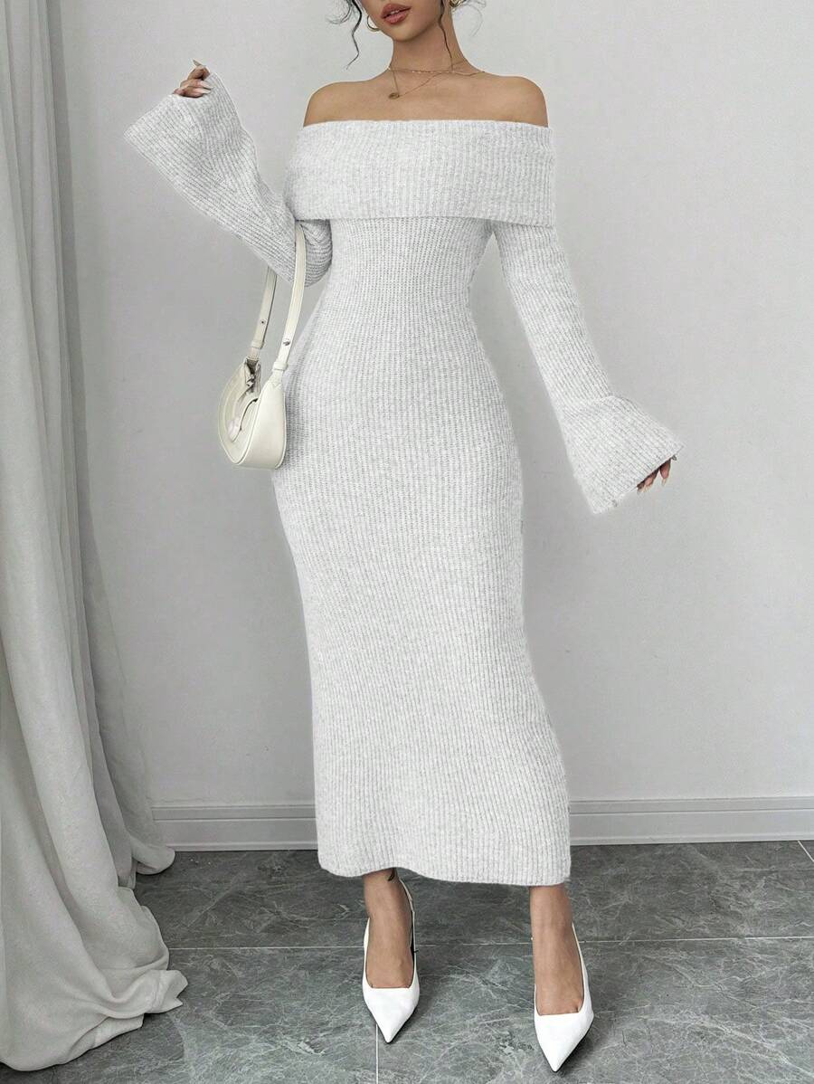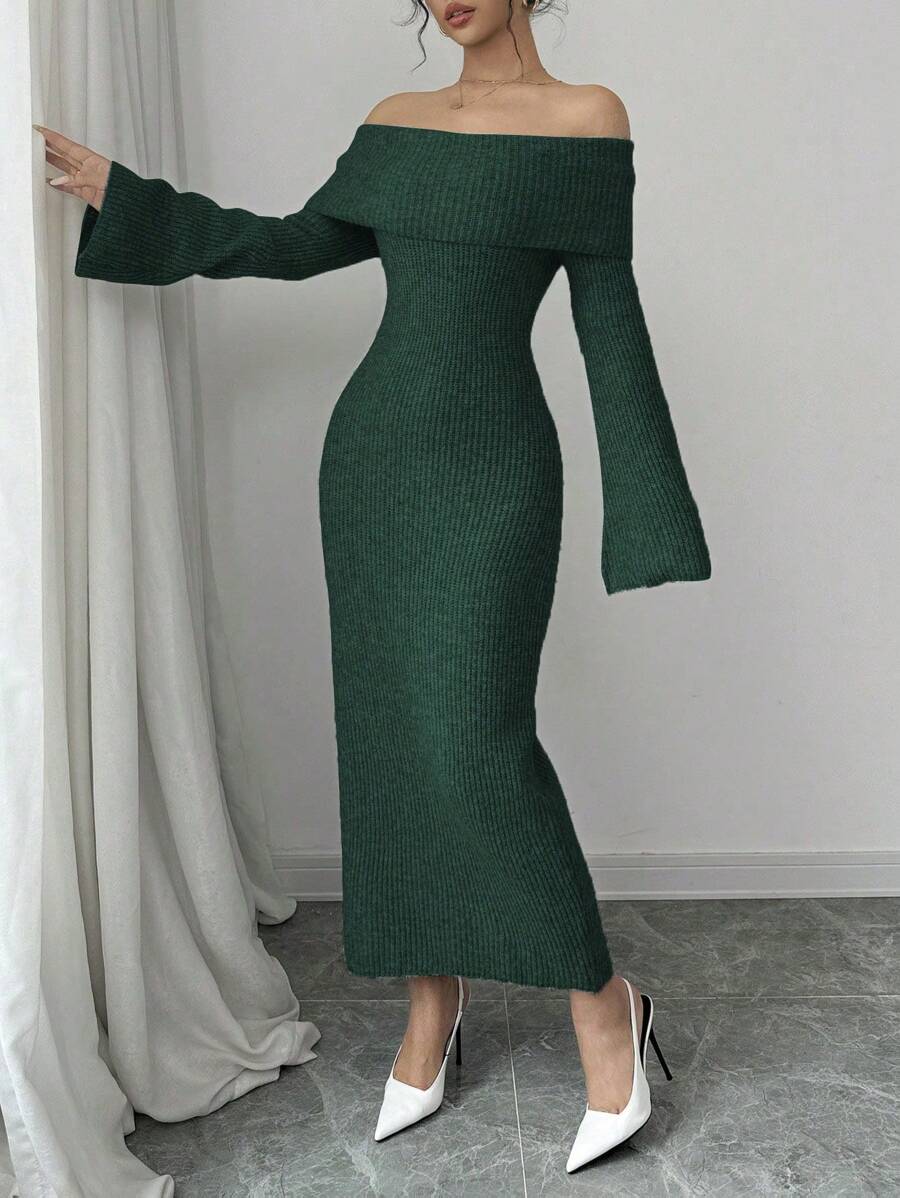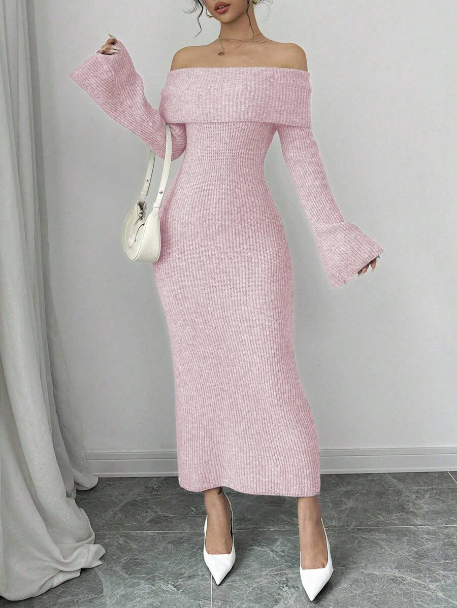 EMI Women's Solid Color Simple Off-Shoulder Long Sleeve Dress, Casual Fall Winter Cloth For Women