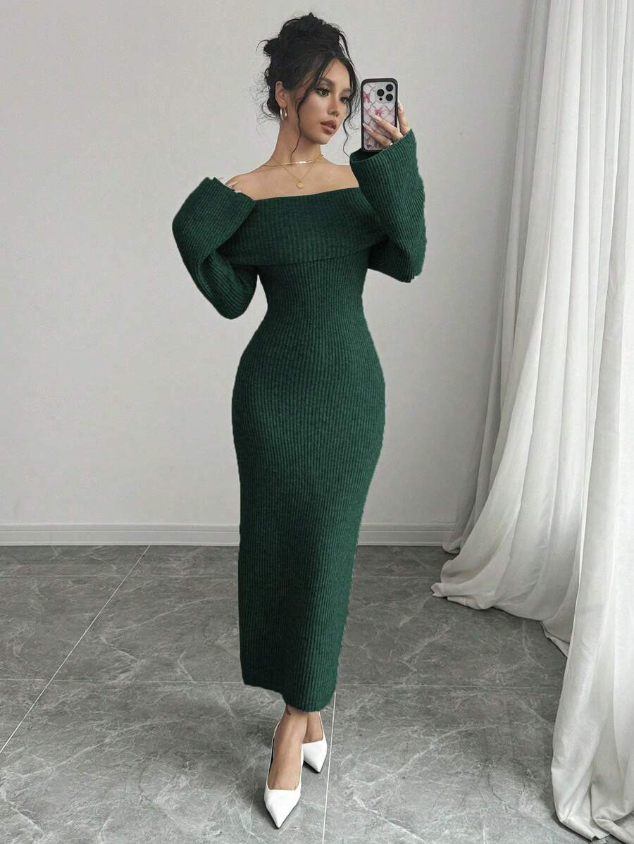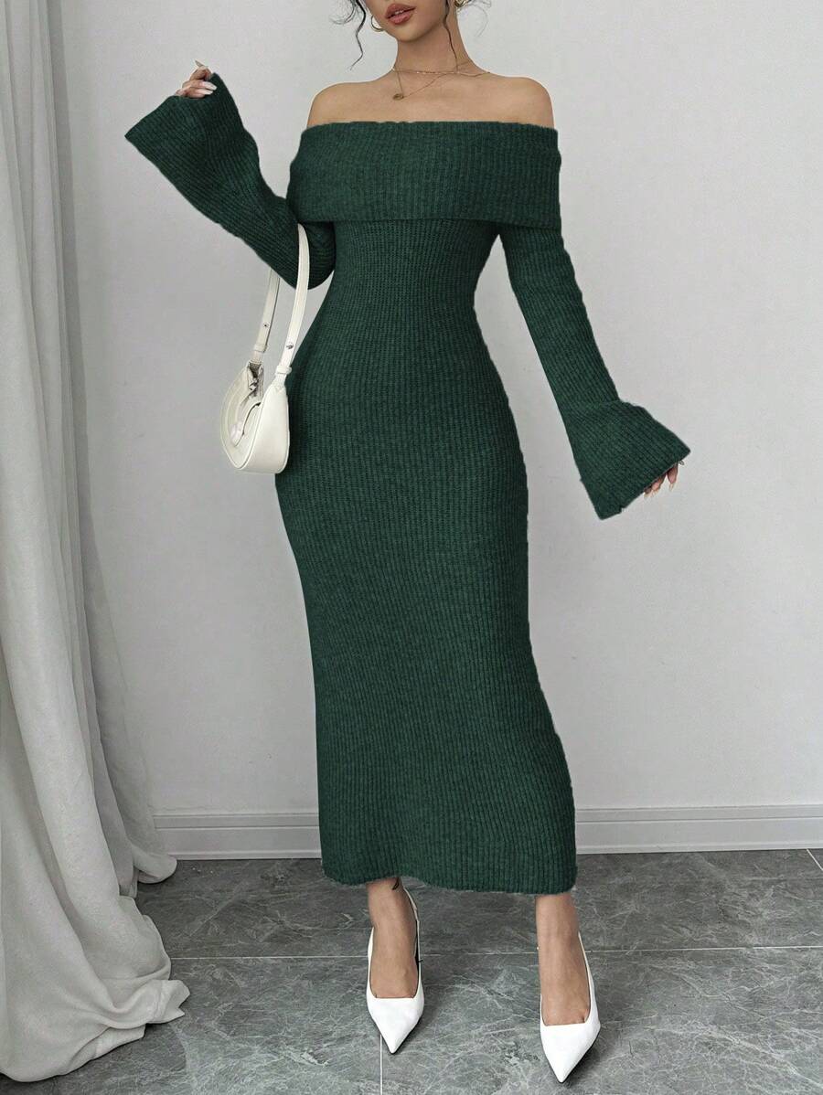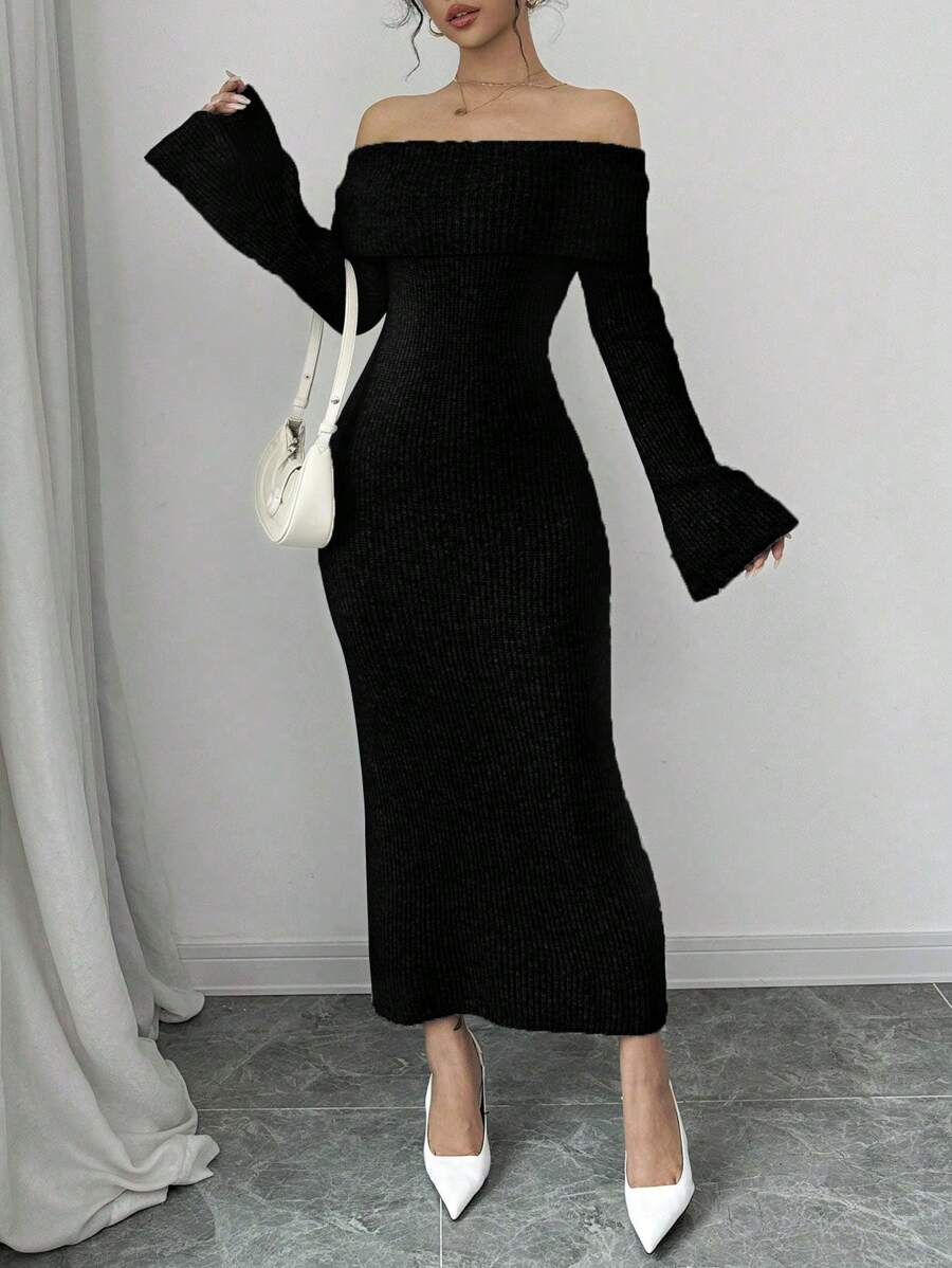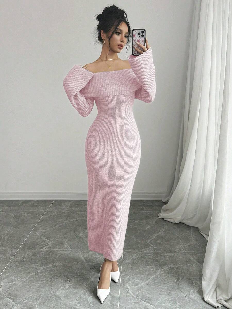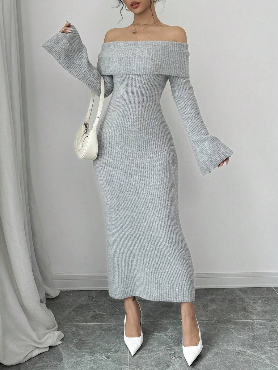 EMI Women's Solid Color Simple Off-Shoulder Long Sleeve Dress, Casual Fall Winter Cloth For Women