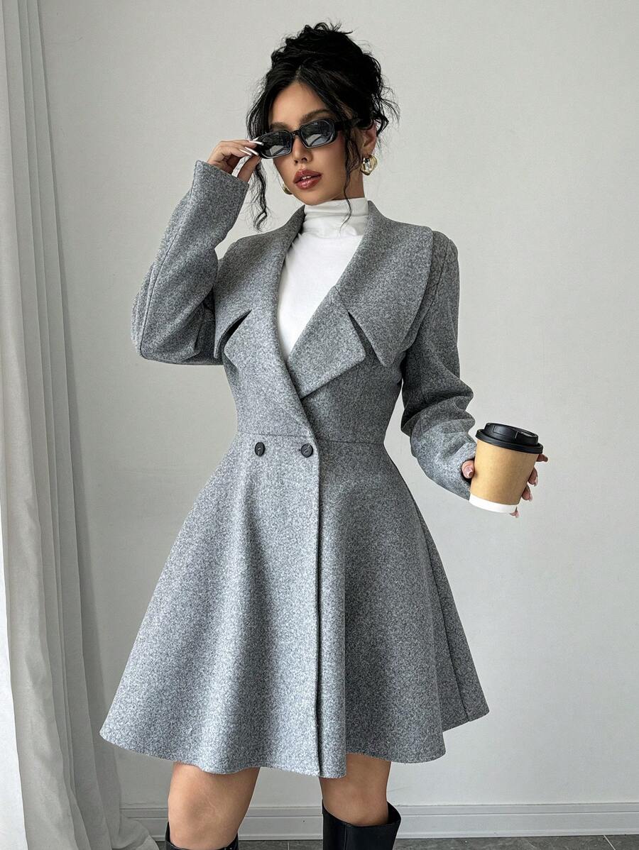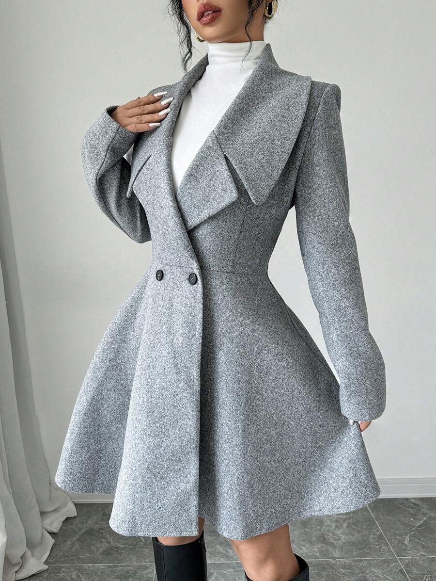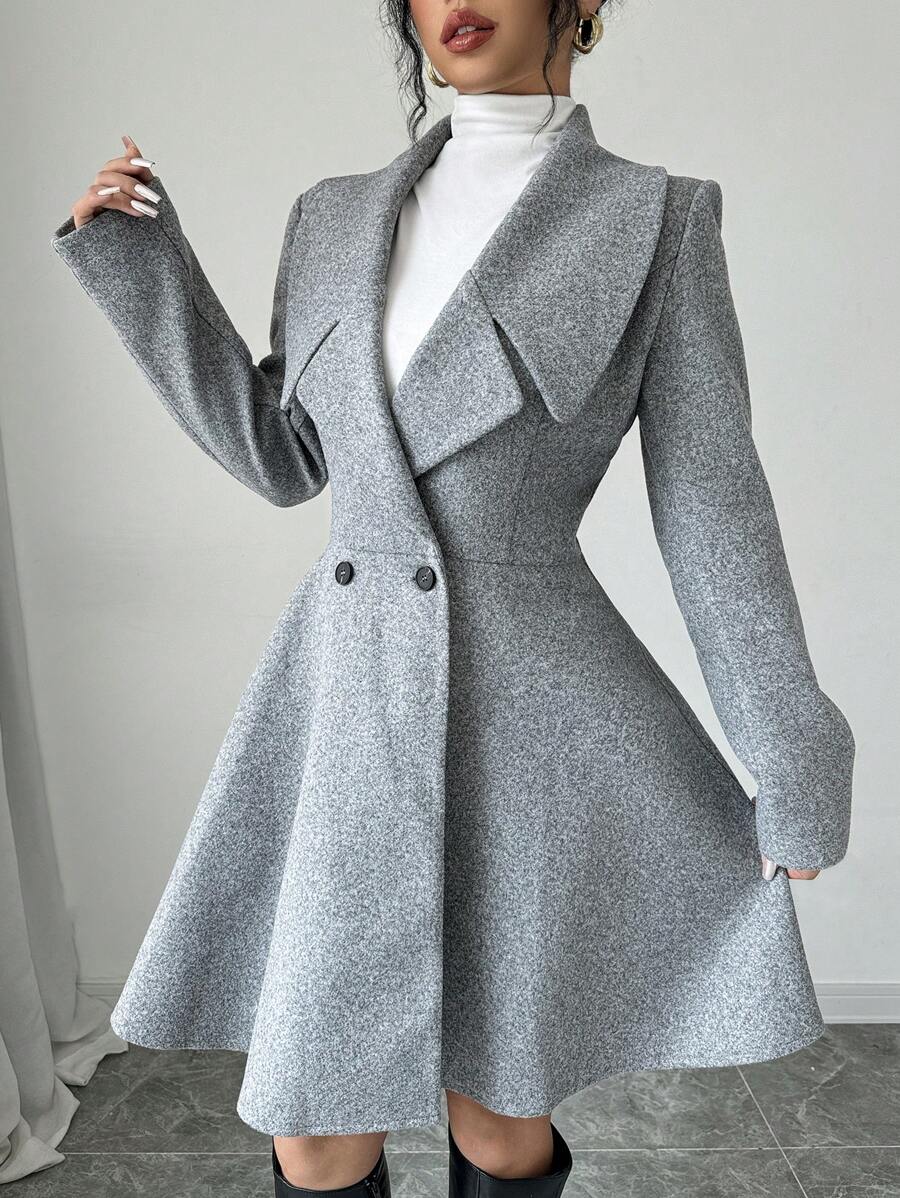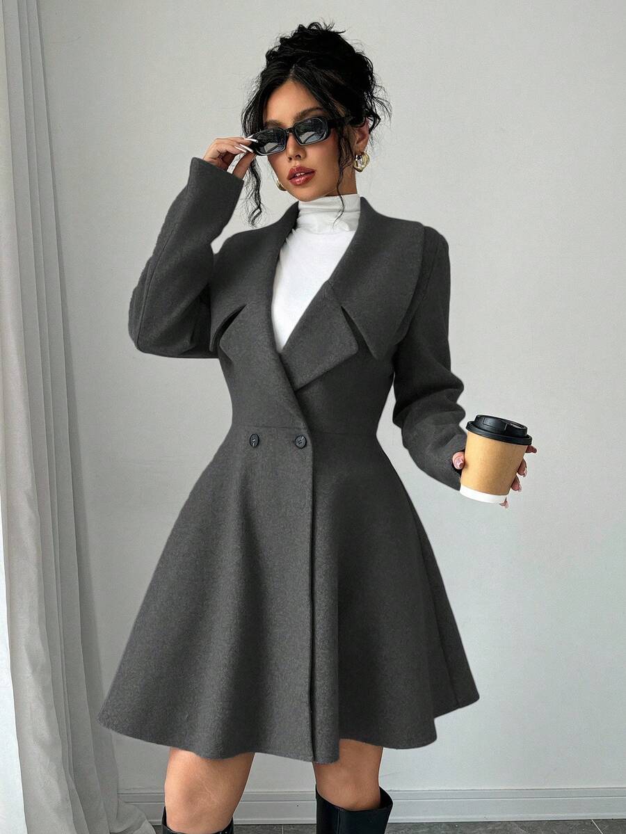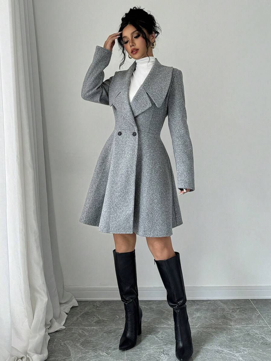 EMI Women's Solid Color Stand Collar Long Sleeve Double-Breasted Elegant Overcoat, Fall/Winter, Ladies Late Fall Elegant Button, Double Button Regular Sleeve Shawl Collar Loose Grey Tweed Plain Women Overcoats, Casual Daily Wear