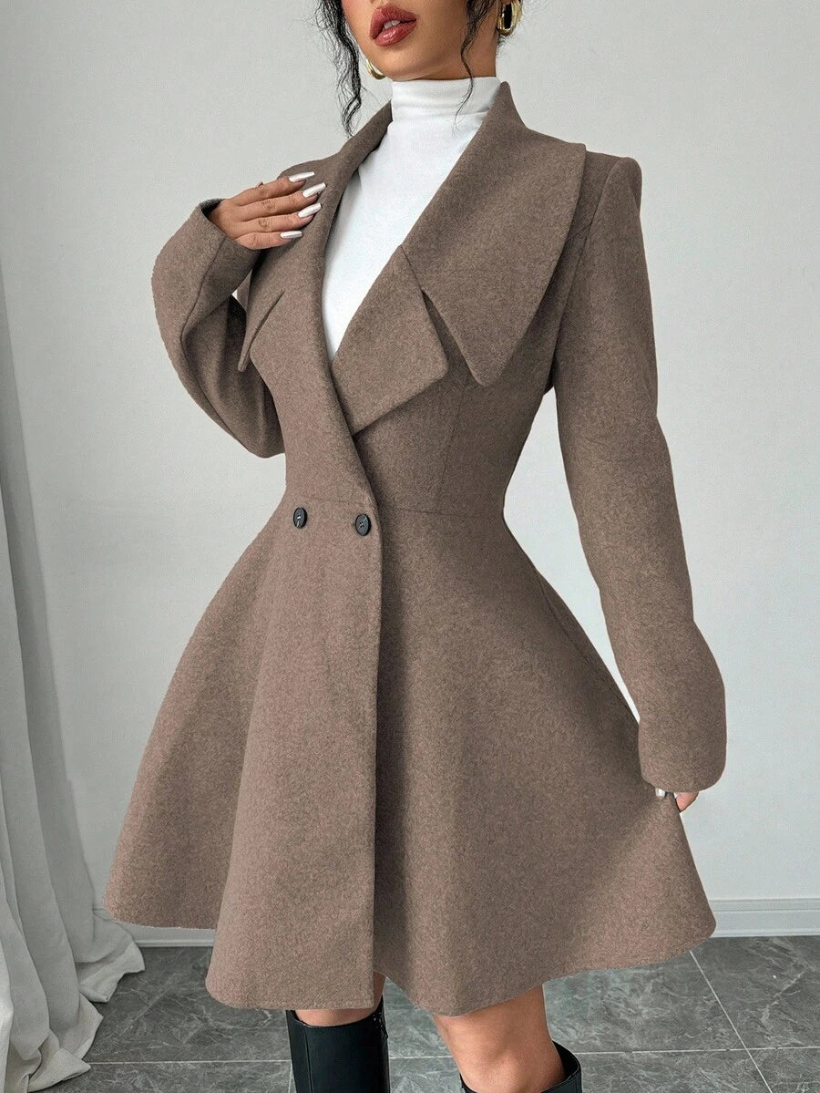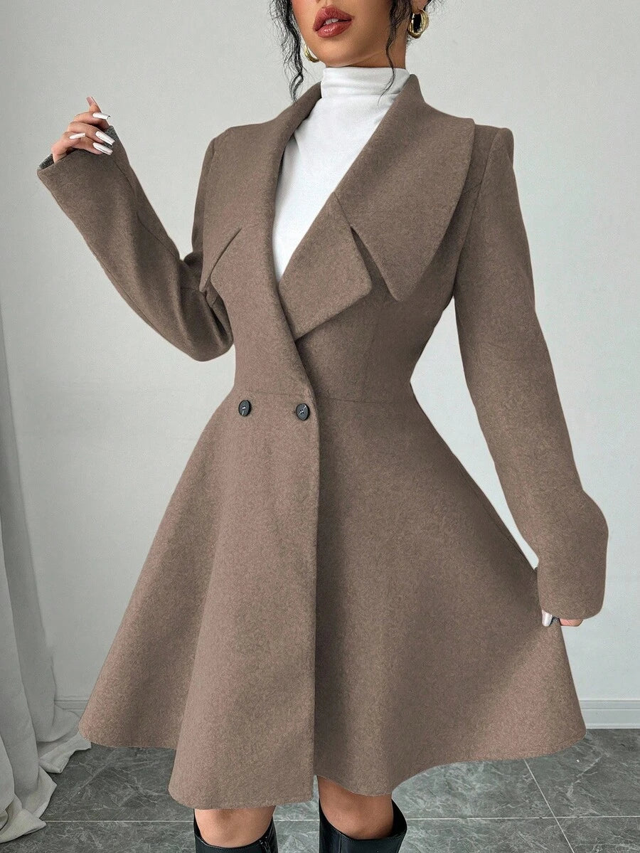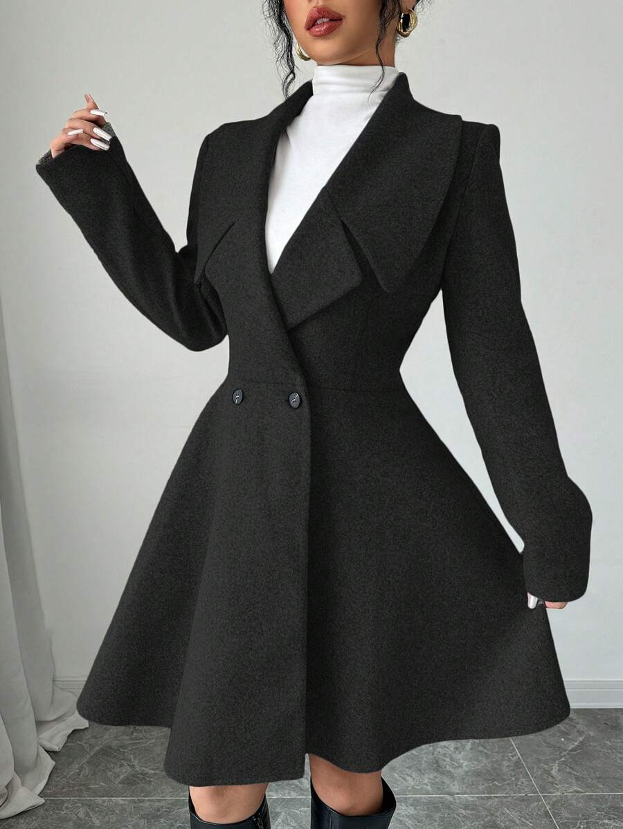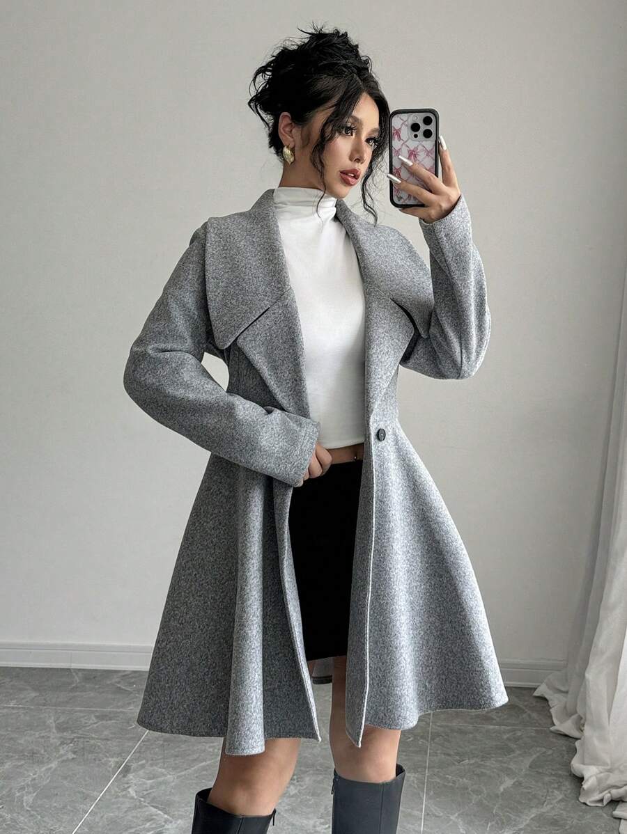 EMI Women's Solid Color Stand Collar Long Sleeve Double-Breasted Elegant Overcoat, Fall/Winter, Ladies Late Fall Elegant Button, Double Button Regular Sleeve Shawl Collar Loose Grey Tweed Plain Women Overcoats, Casual Daily Wear