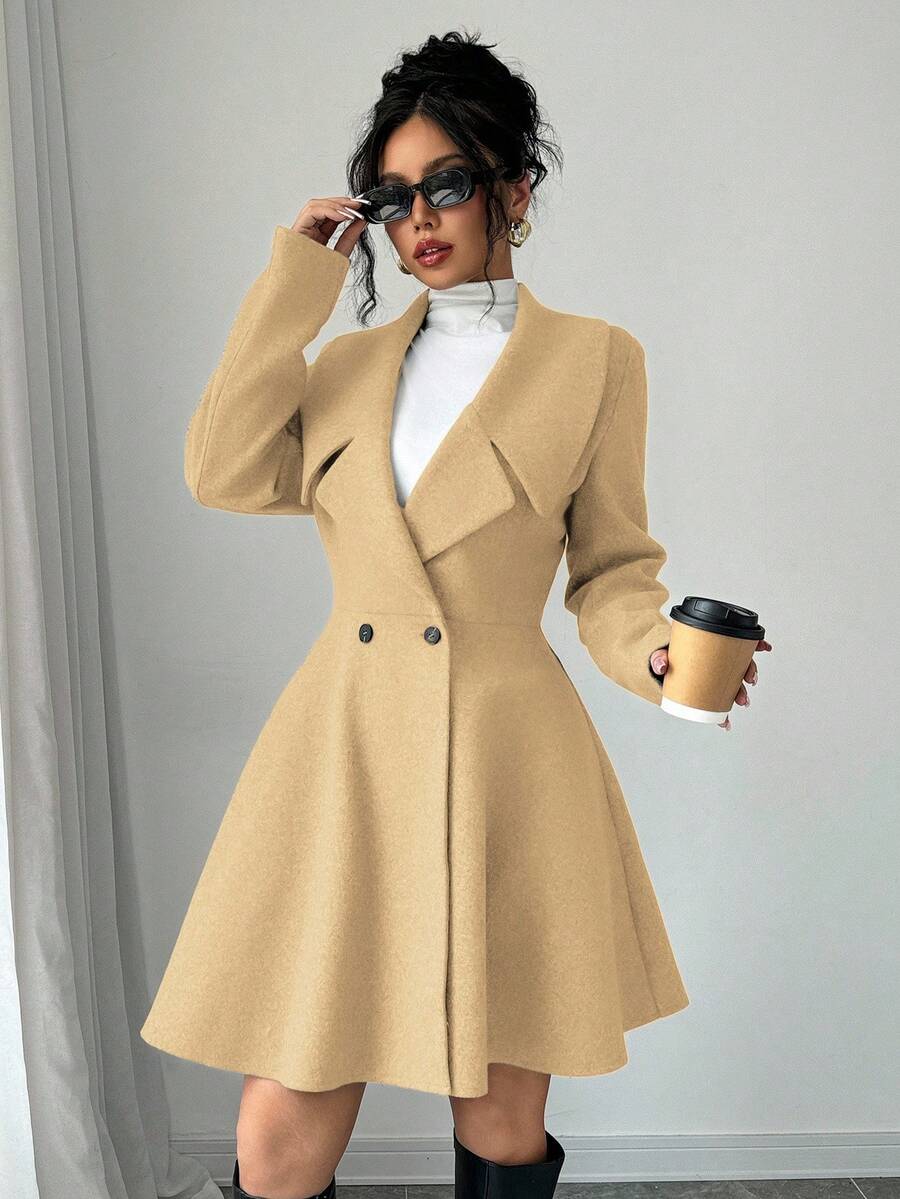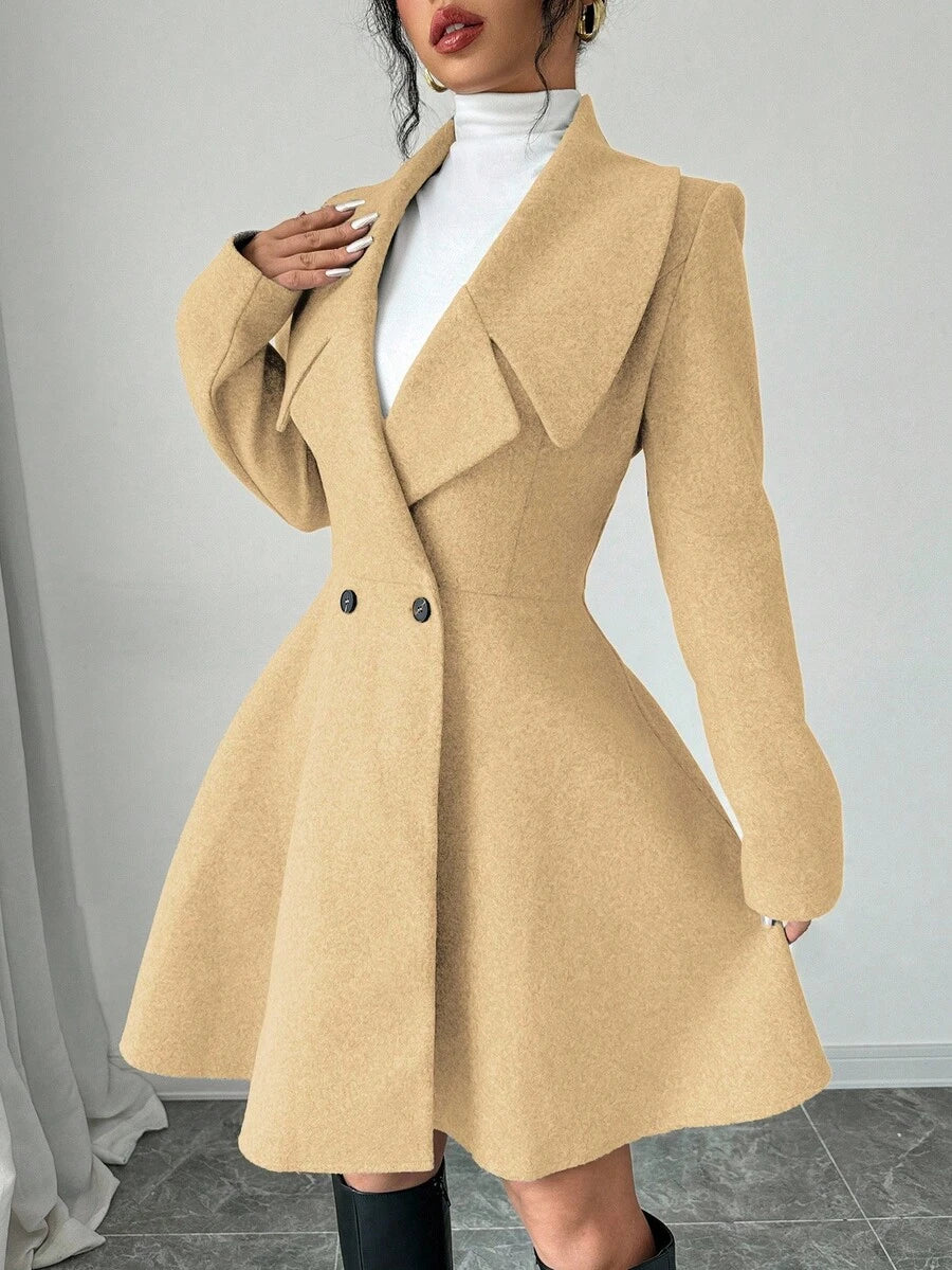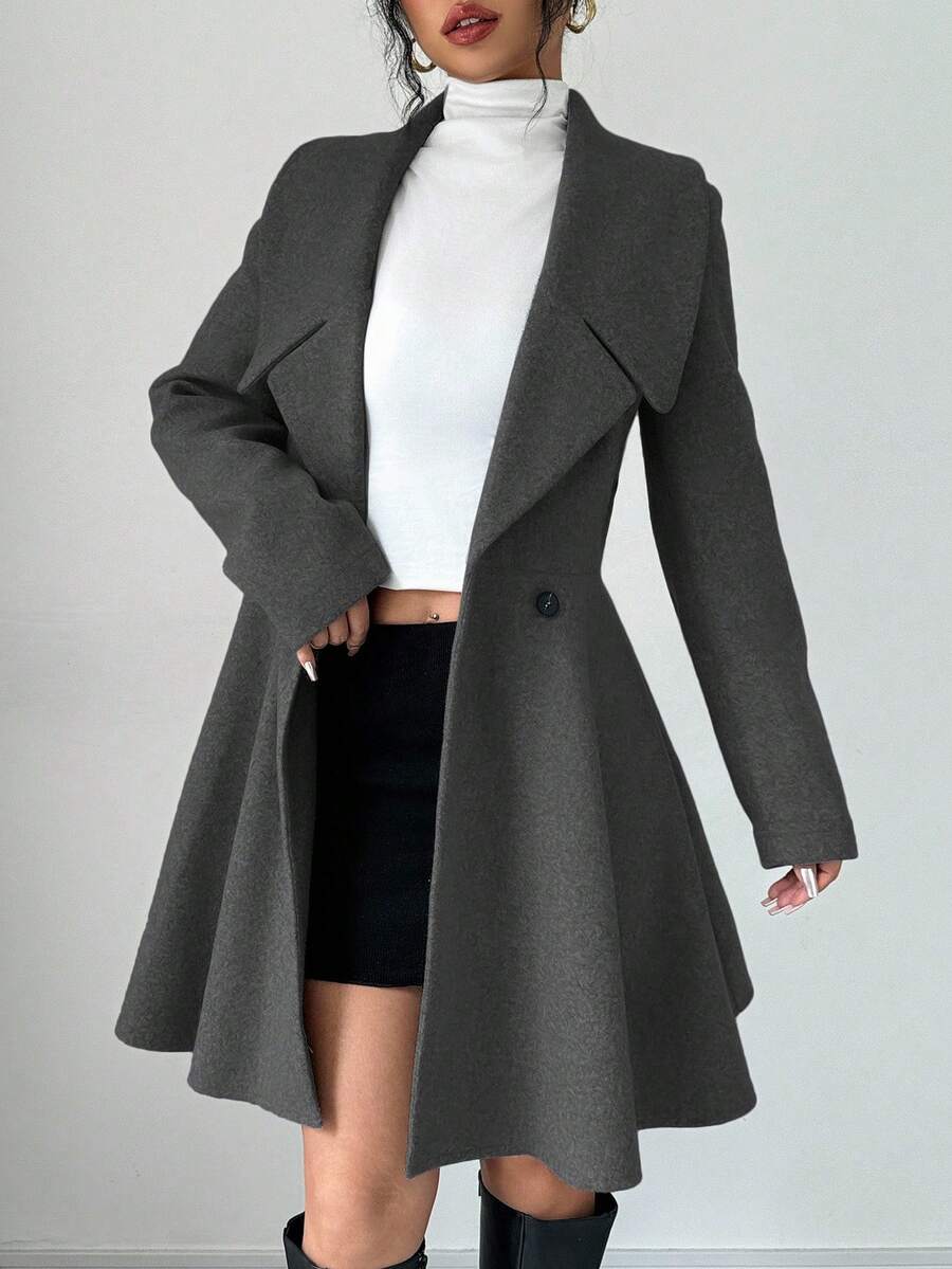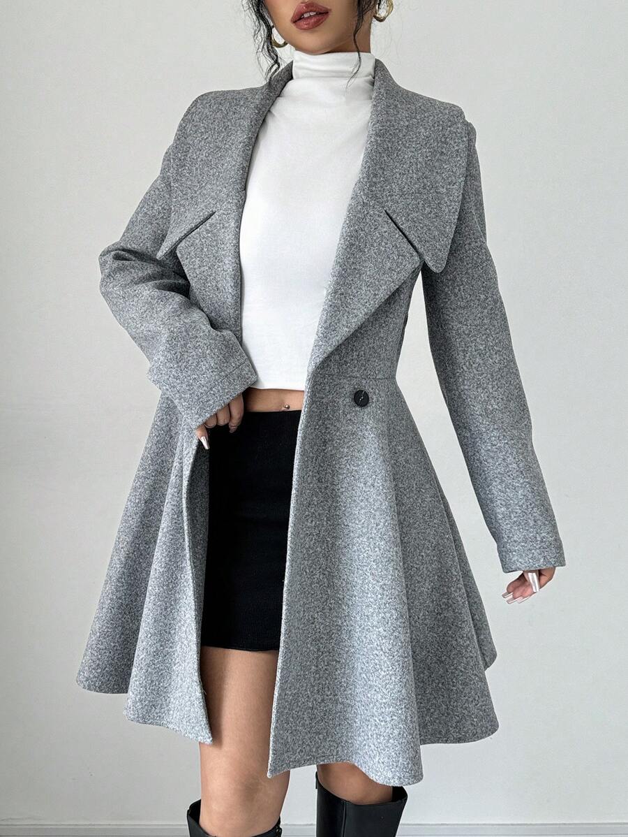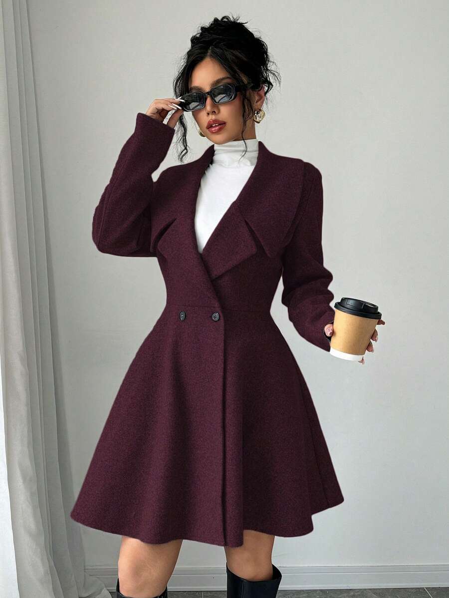 EMI Women's Solid Color Stand Collar Long Sleeve Double-Breasted Elegant Overcoat, Fall/Winter, Ladies Late Fall Elegant Button, Double Button Regular Sleeve Shawl Collar Loose Grey Tweed Plain Women Overcoats, Casual Daily Wear